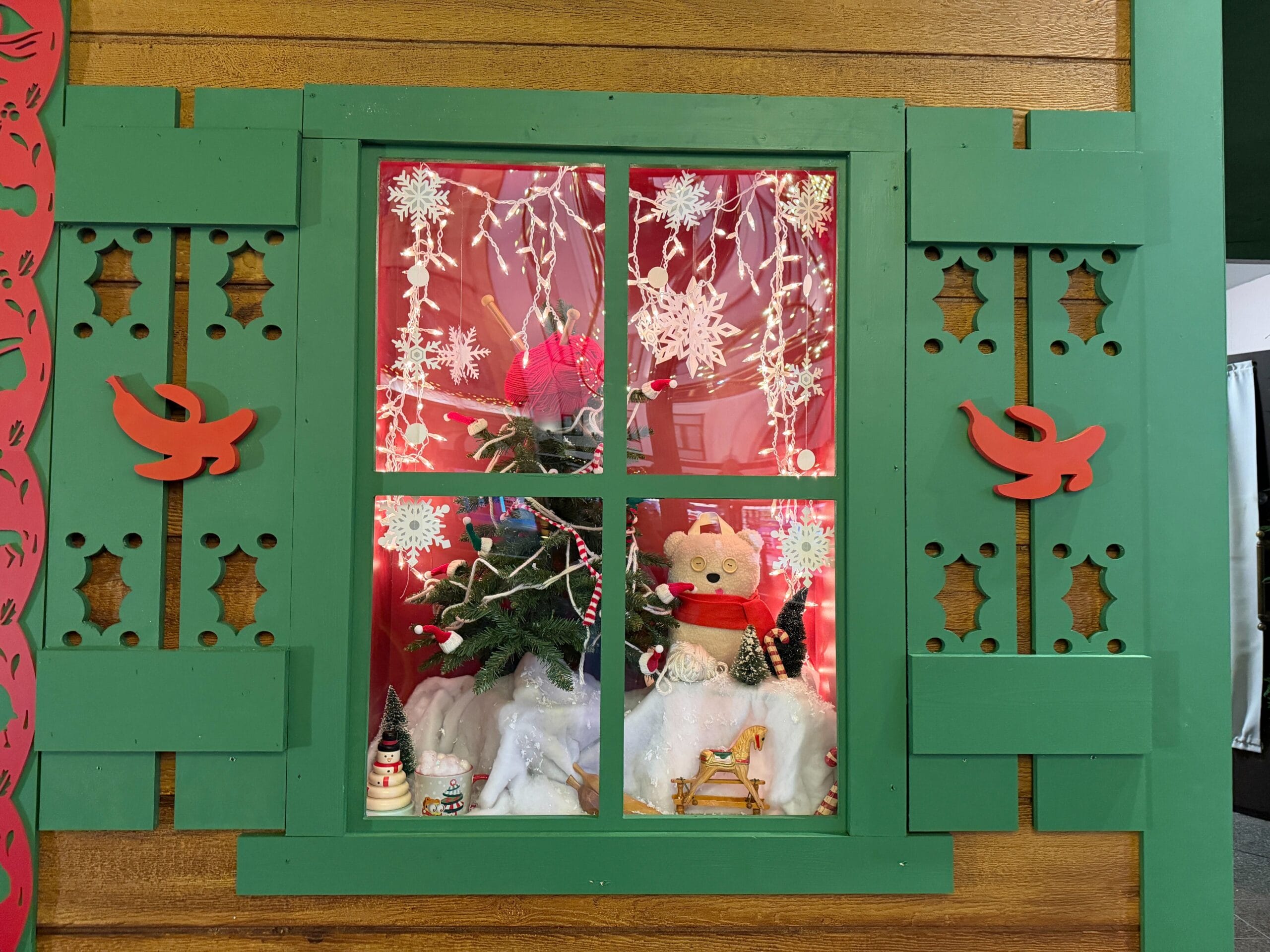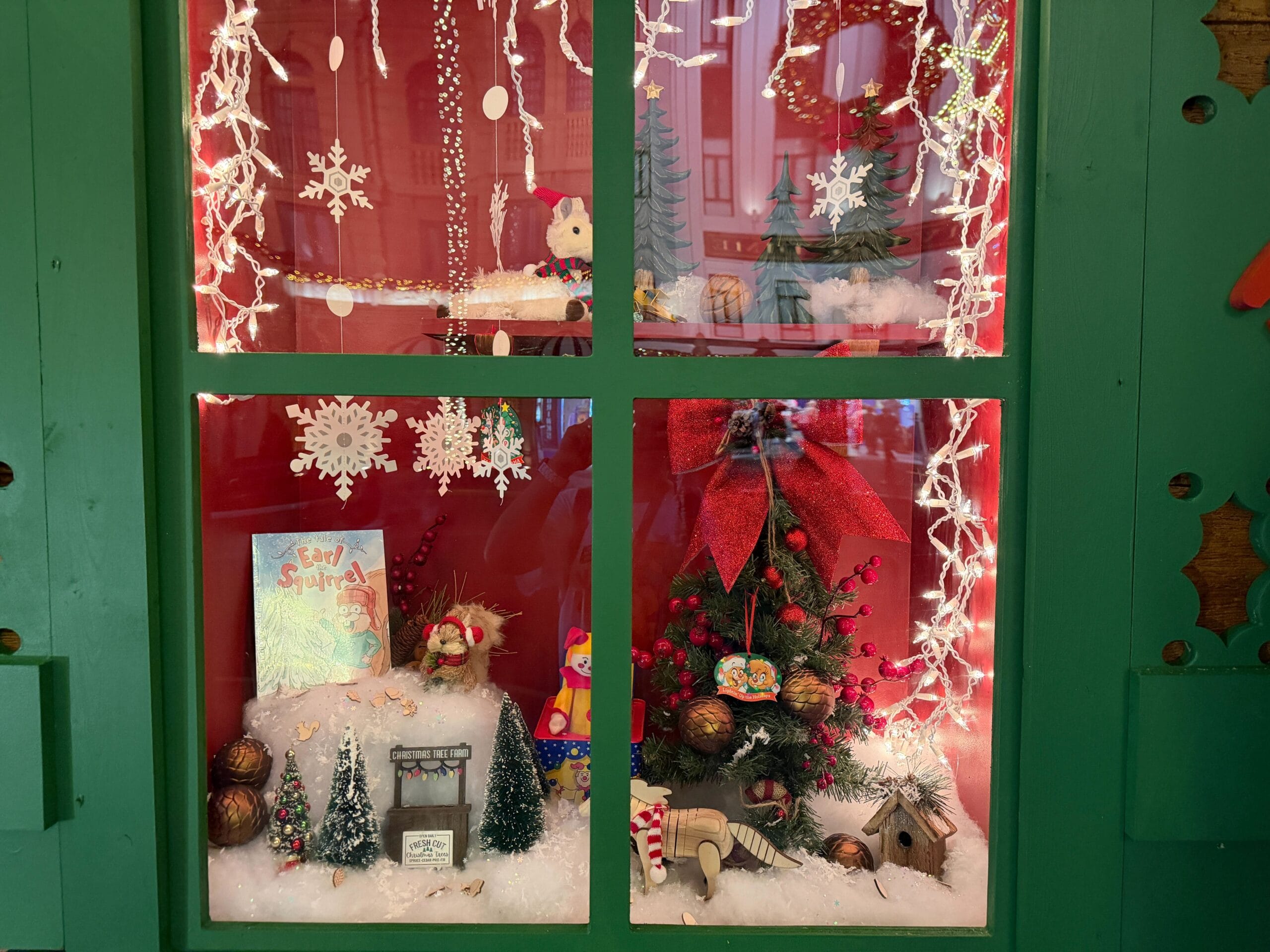 The Studio Store is decorated with windows featuring different characters in holiday settings.
