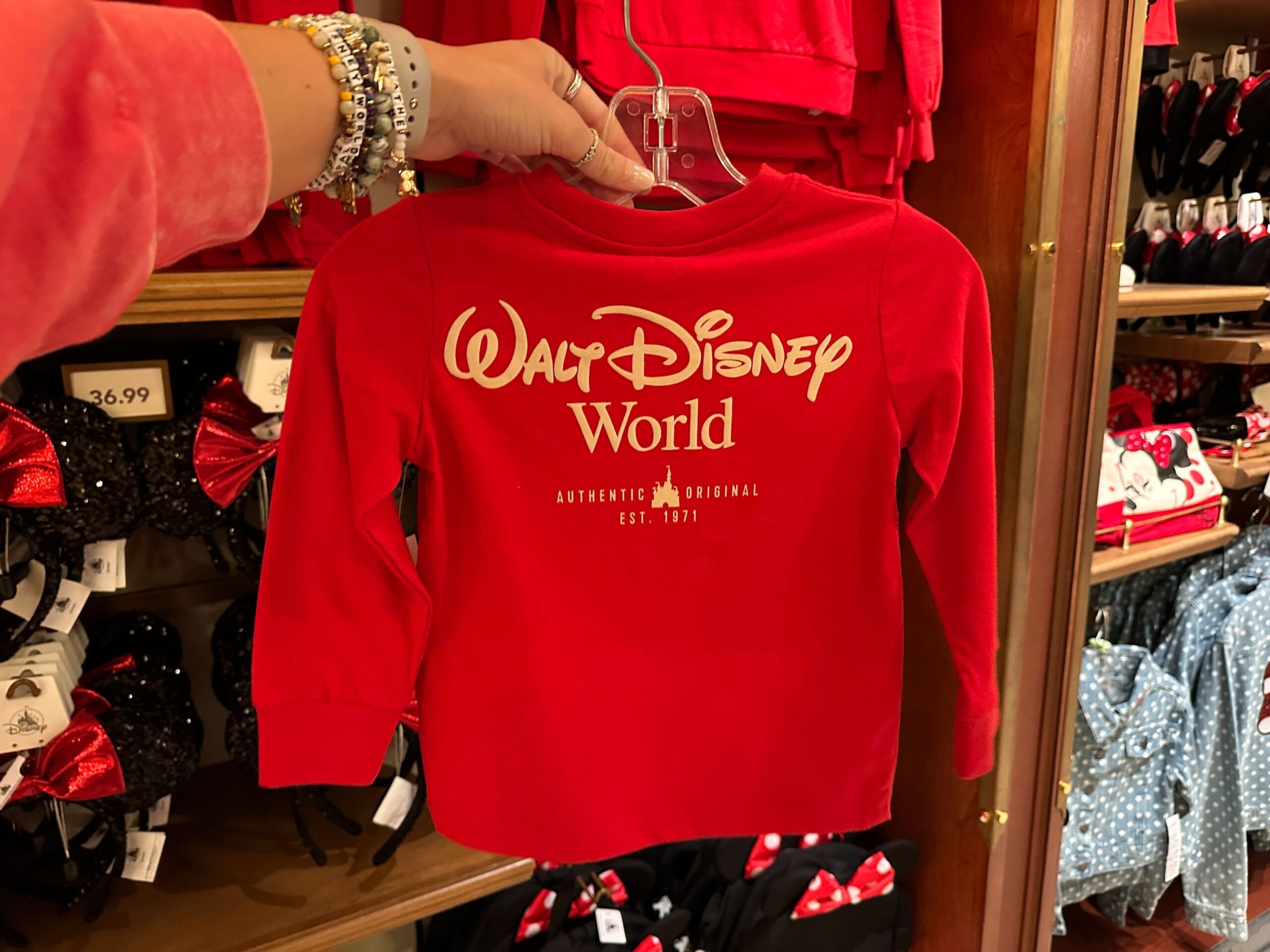 It’s getting colder and Walt Disney World has started stocking long-sleeved apparel. We found this new youth long-sleeved shirt and adult sweatshirt at the Emporium in Magic Kingdom.