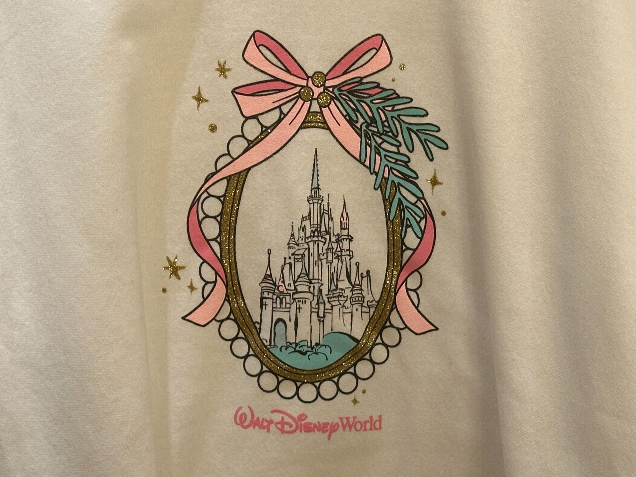 An oval image of Cinderella Castle is on the chest of this white pullover. The castle has a sparkly gold border with printed pearls, leaves, and a pink ribbon. Sparkly gold stars are around the image and “Walt Disney World” is in pink at the bottom.