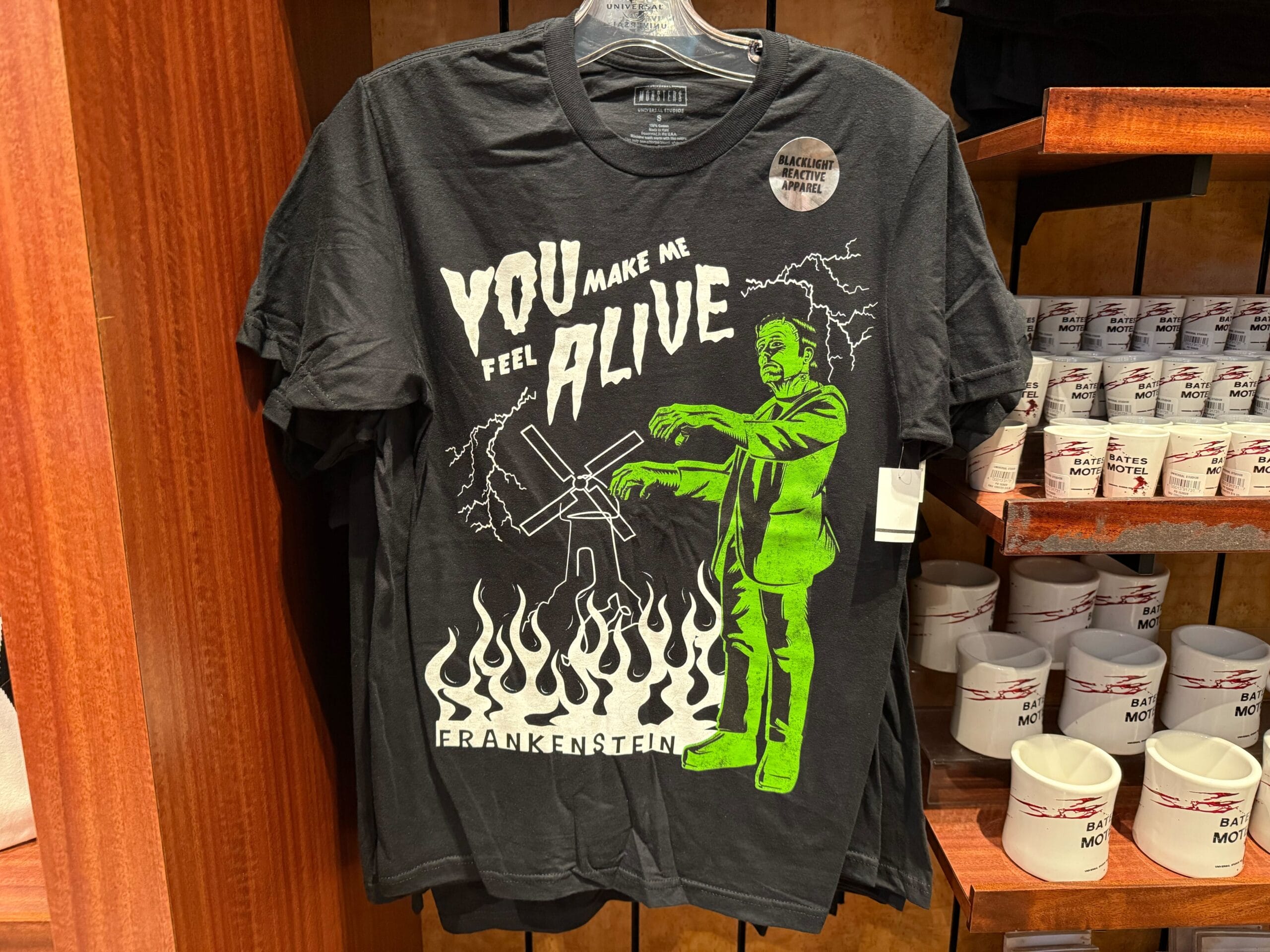 This is a black tee with a blacklight reactive design. Frankenstein’s Monster is in green on one side. The Burning Blade Tavern windmill, fire, and lightning are in the background. “You Make Me Feel Alice” is at the top and “Frankenstein” is at the bottom.
