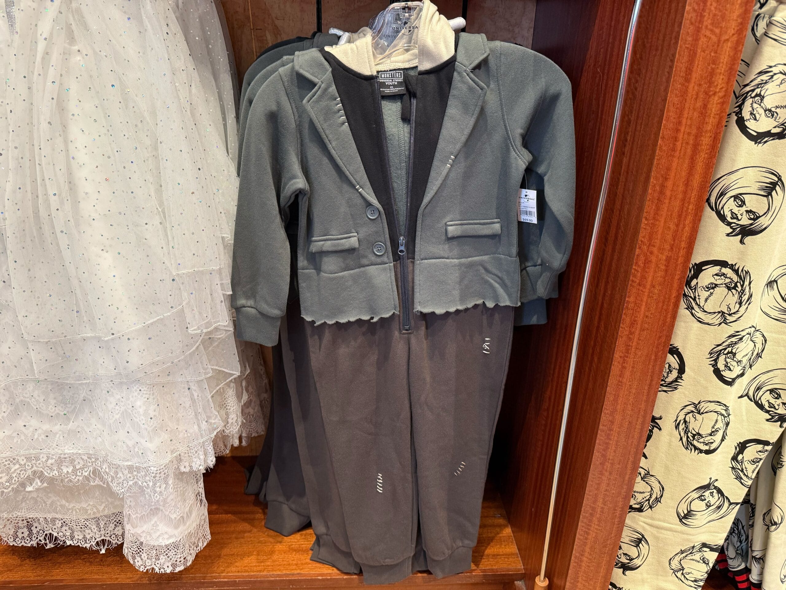 The youth costume is one piece but includes layered elements. The tattered gray jacket with buttons and faux pockets is over a black zip-up torso. Attached brown sweatpants feature stitching details. The hood has Frankenstein’s black hair and signature bolts.