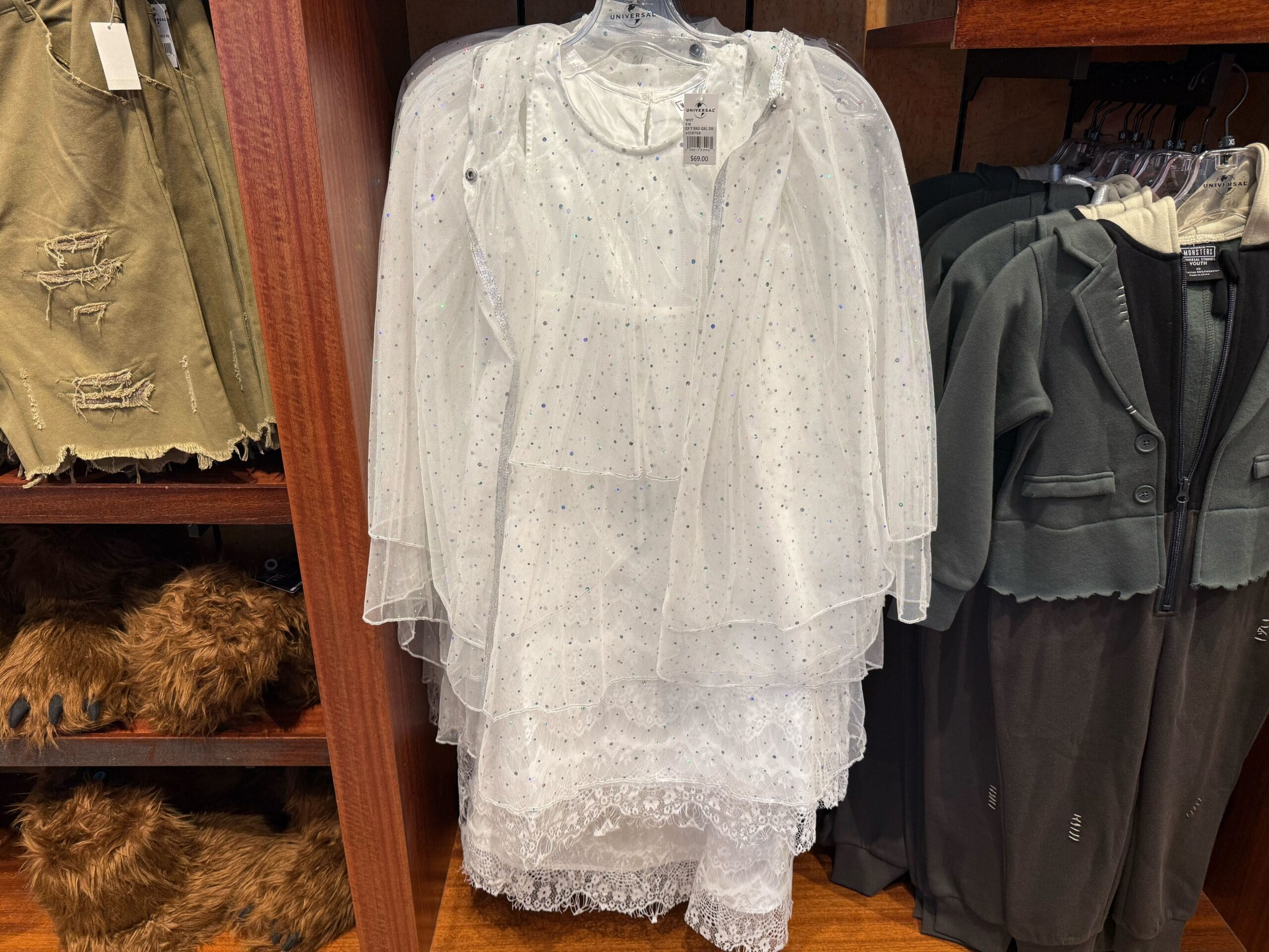 The Bride-inspired costume has a cape layered over a dress. It’s made of sparkly white tulle with a lace hem. The cape has a hood and button snap on the front.