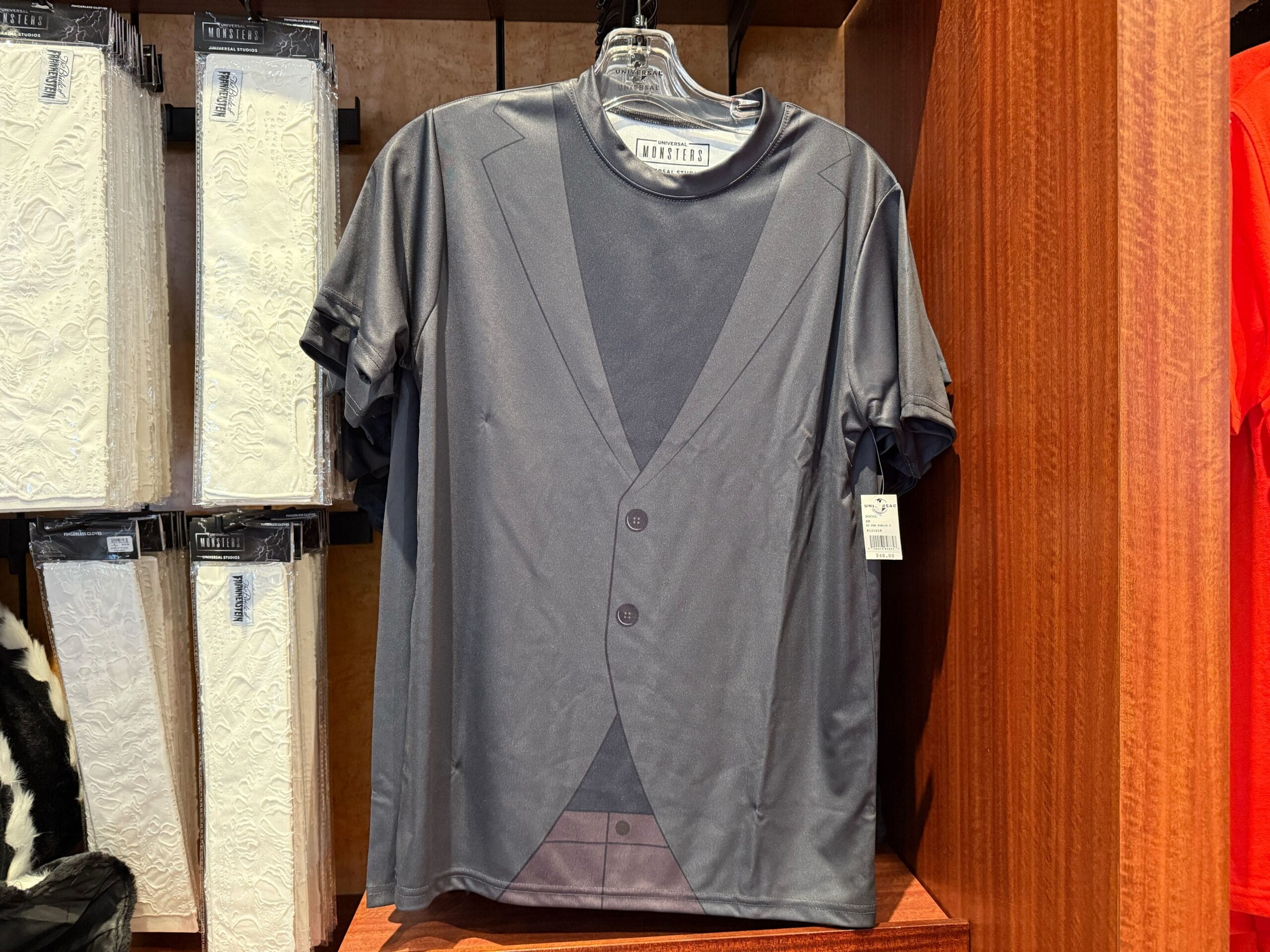 This shirt is printed with the design of the classic Frankenstein’s Monster costume. A dark gray buttoned jacket is pictured over a black shirt and brown pants.
