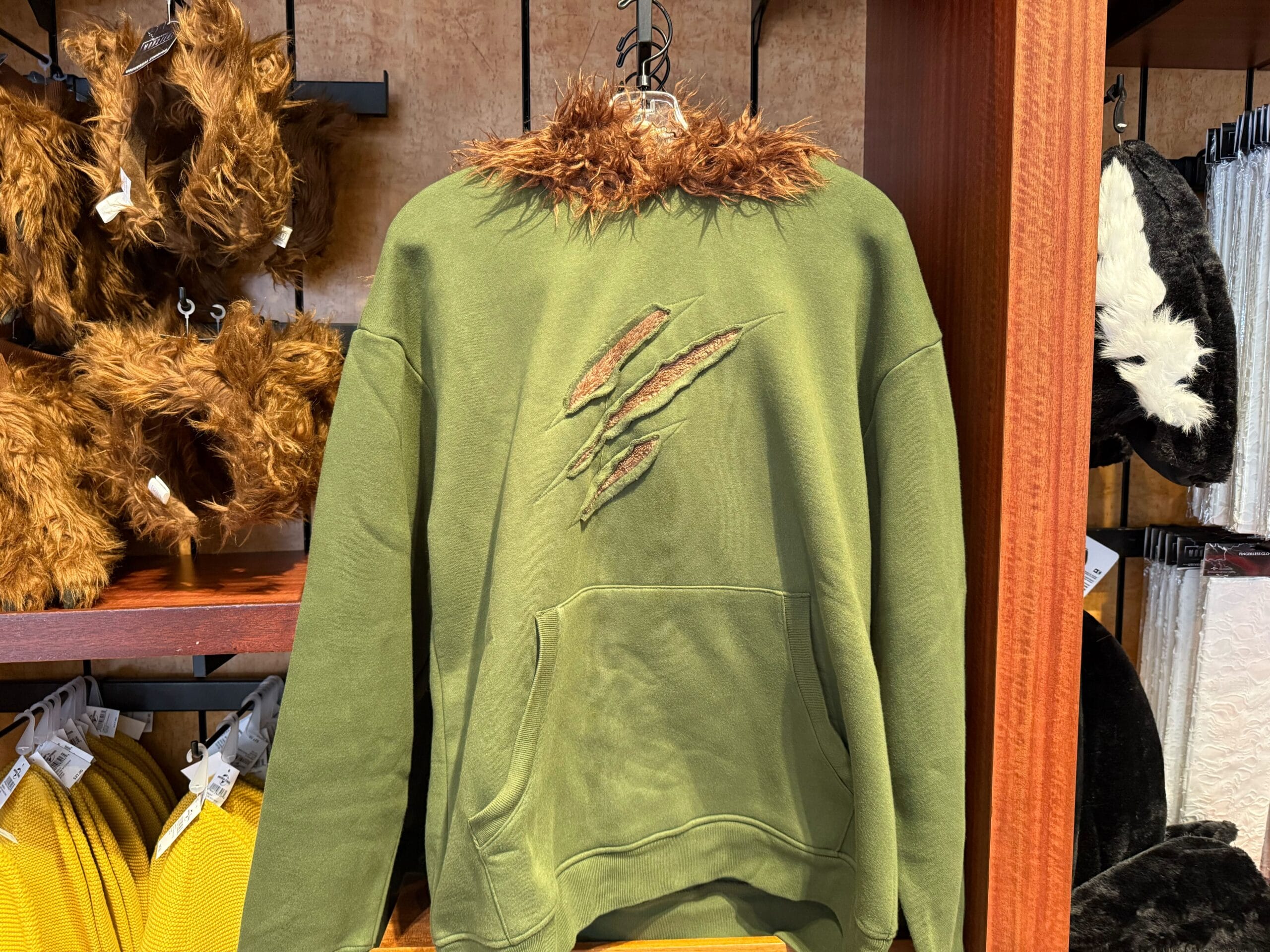 This is a green sweatshirt with a kangaroo pocket on the front. Three claw marks are embroidered on the chest. It has a fuzzy brown hood.