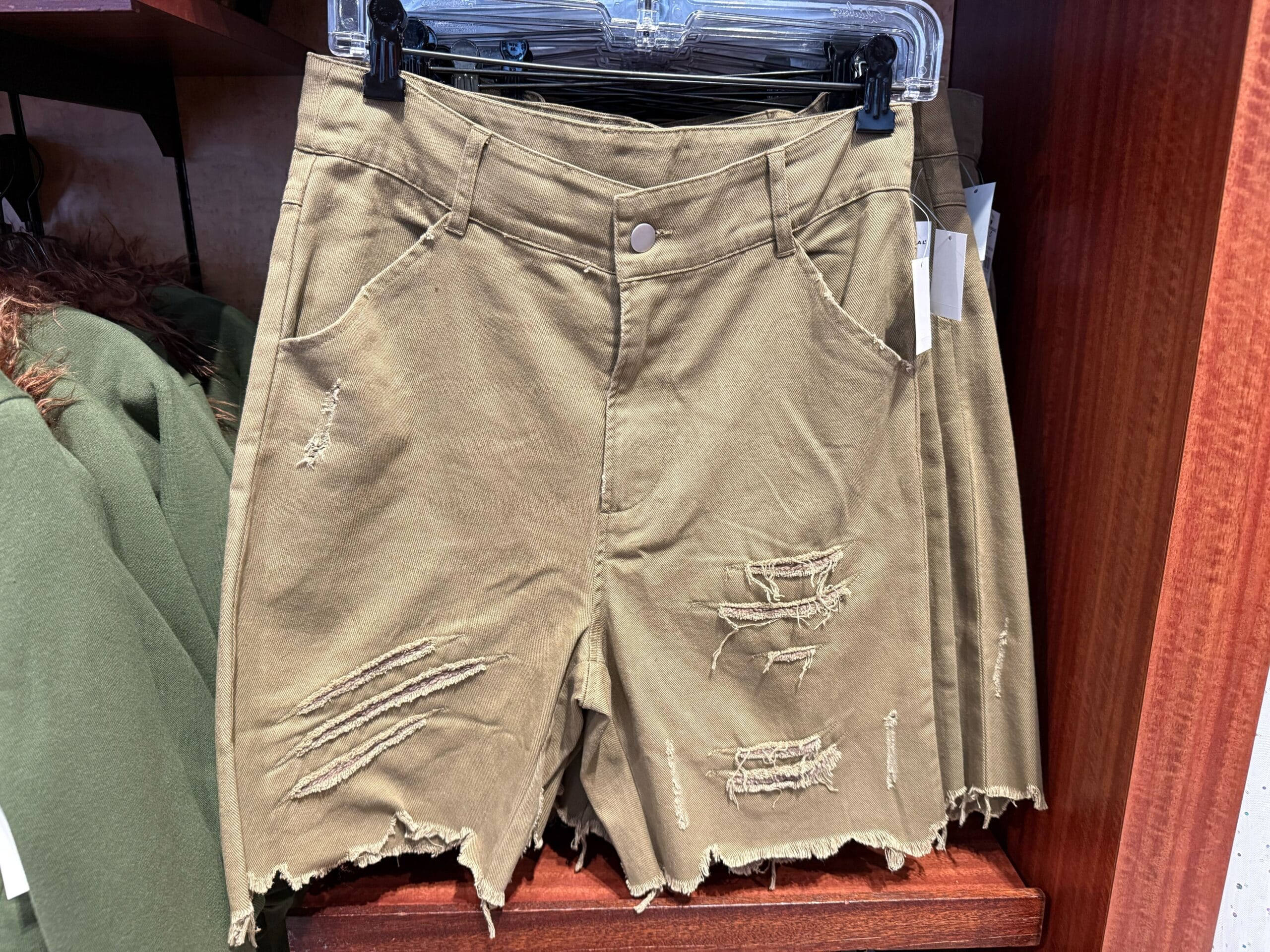 These are khaki shorts that appear to have been torn at the knee. There are more fake rip marks across the legs.
