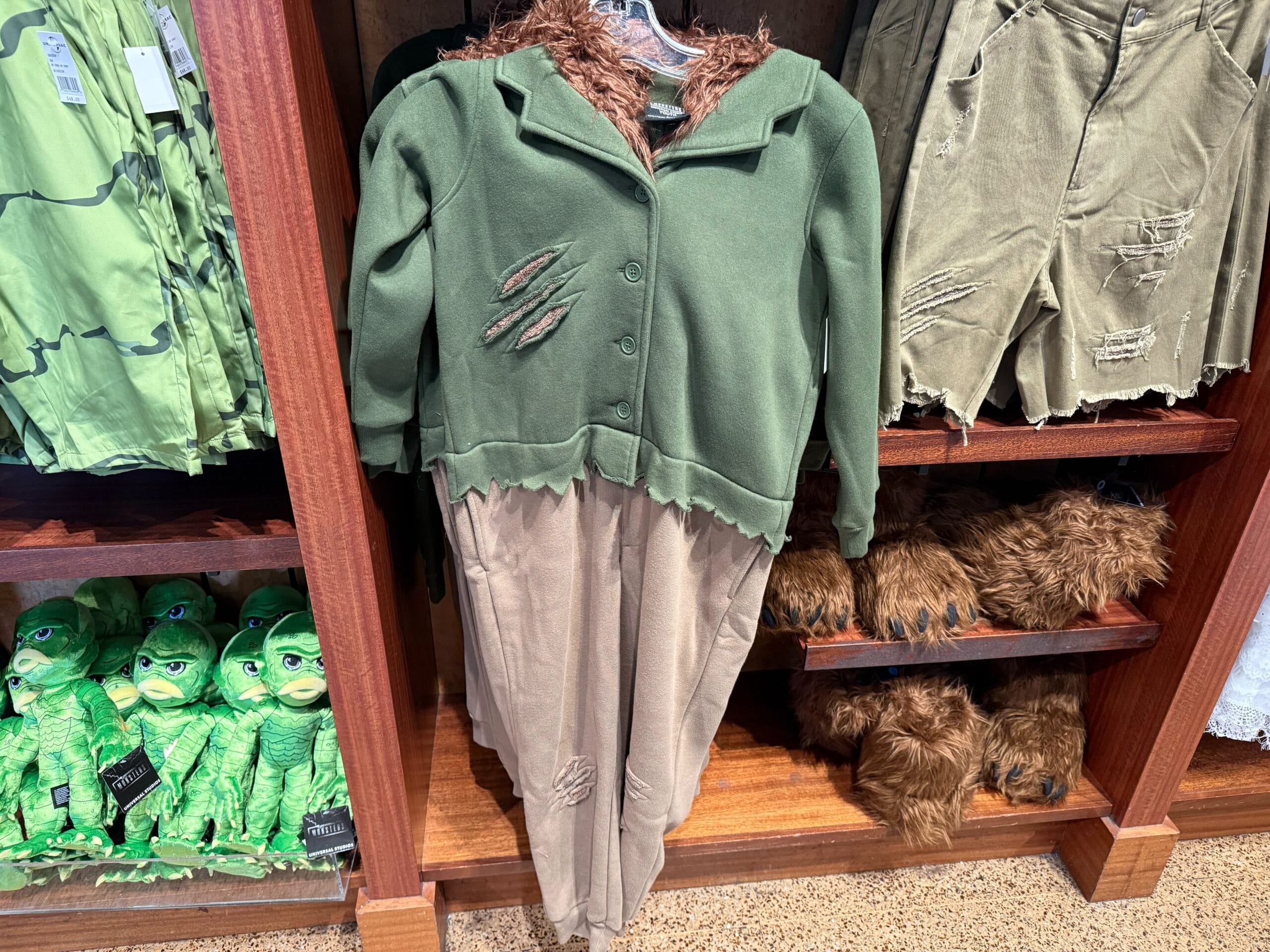The youth costume is a full attached set. A green jacket with faux buttons is attached to gray sweatpants and a brown fuzzy hood. it also has fake claw marks.
