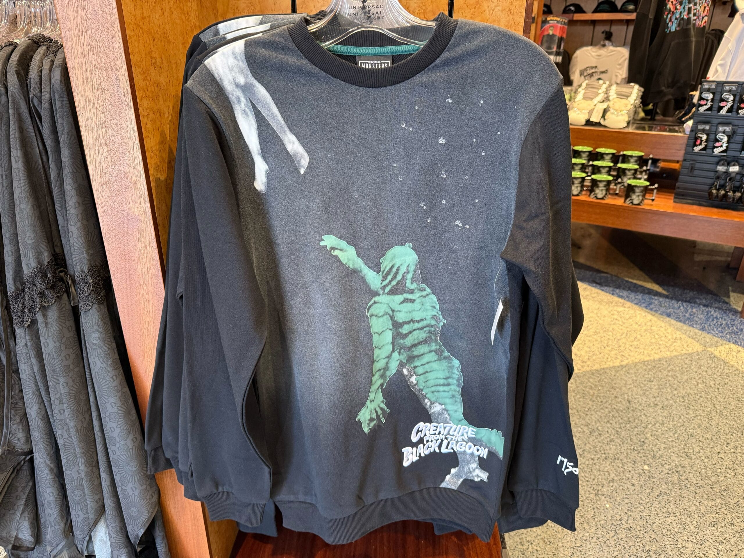 This black sweatshirt features screen art of the Creature swimming after a human. “Creature From the Black Lagoon” is embroidered in the lower corner.