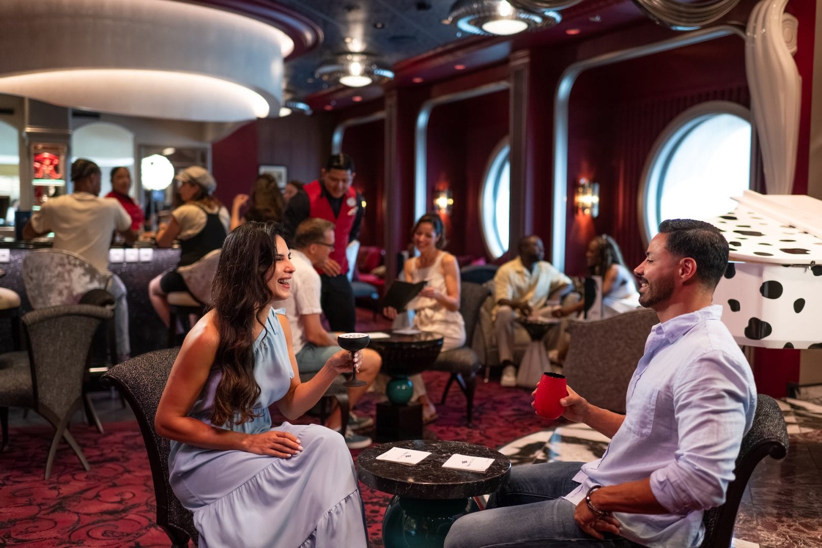 There is even a glowing, fiber-optic Cruella that appears and disappears in the wall behind an eye-catching spotted piano. One side of the lounge opens to the Grand Hall, so guests can sit back with a drink and look out at ship’s gathering space.