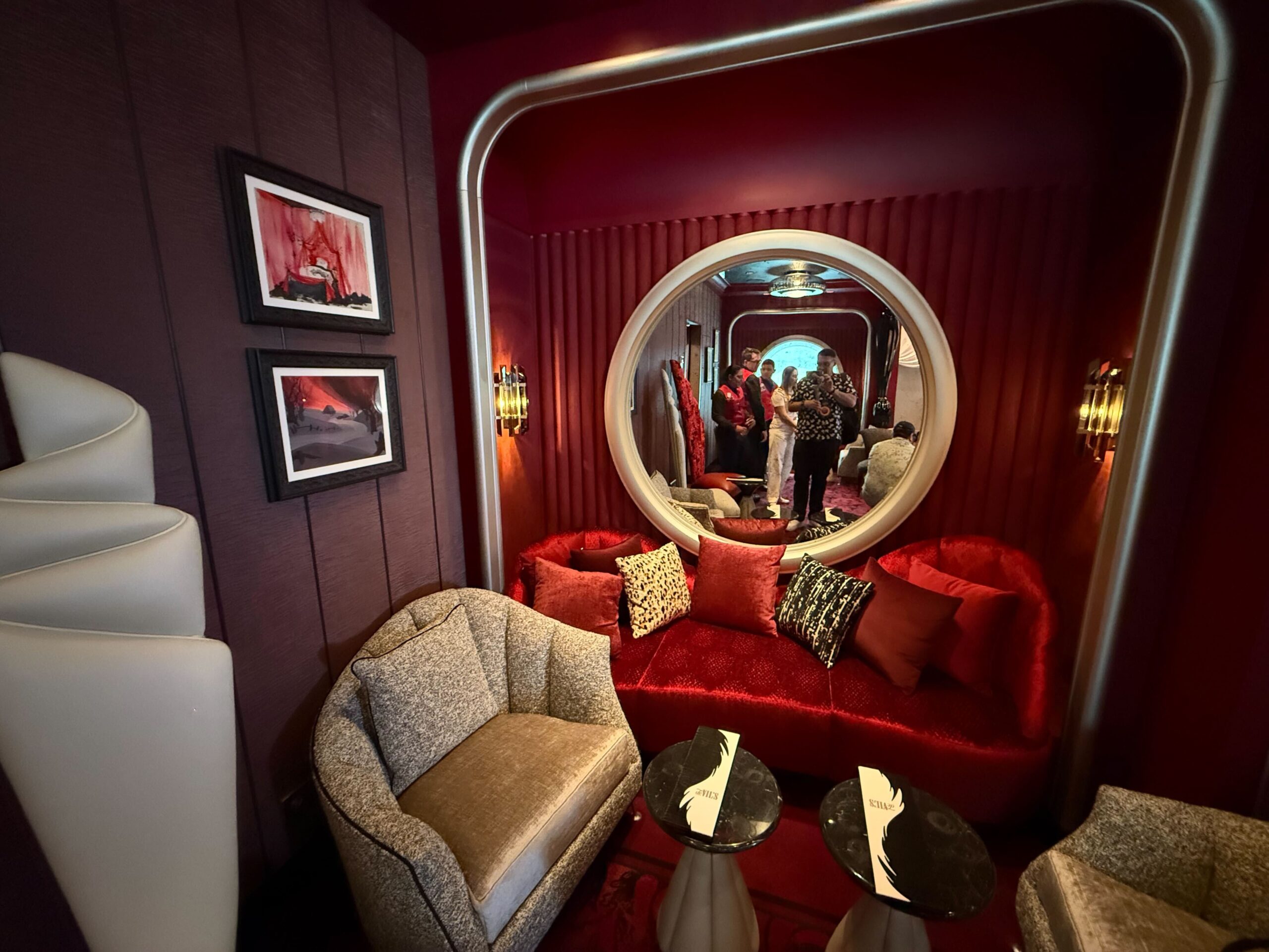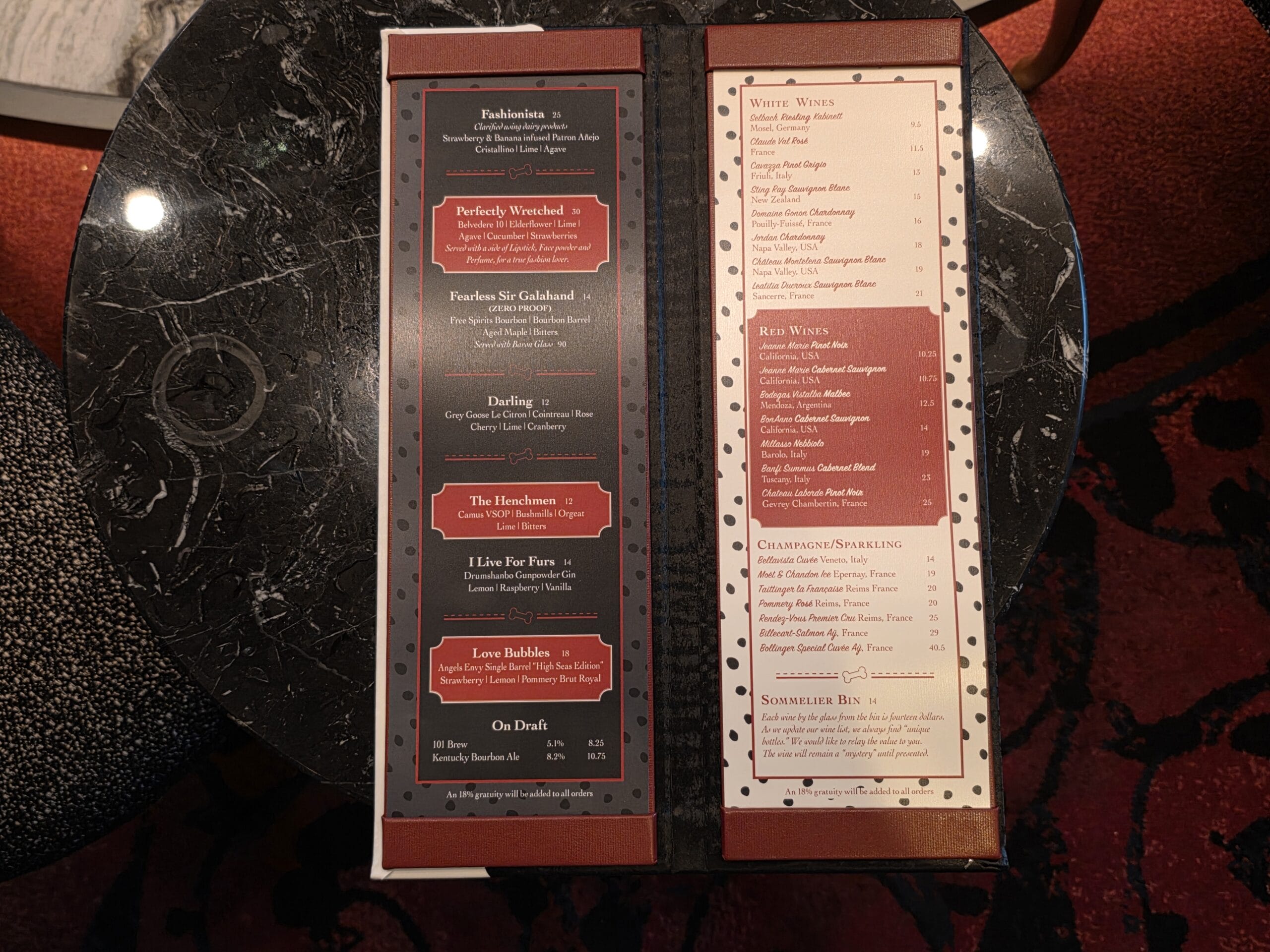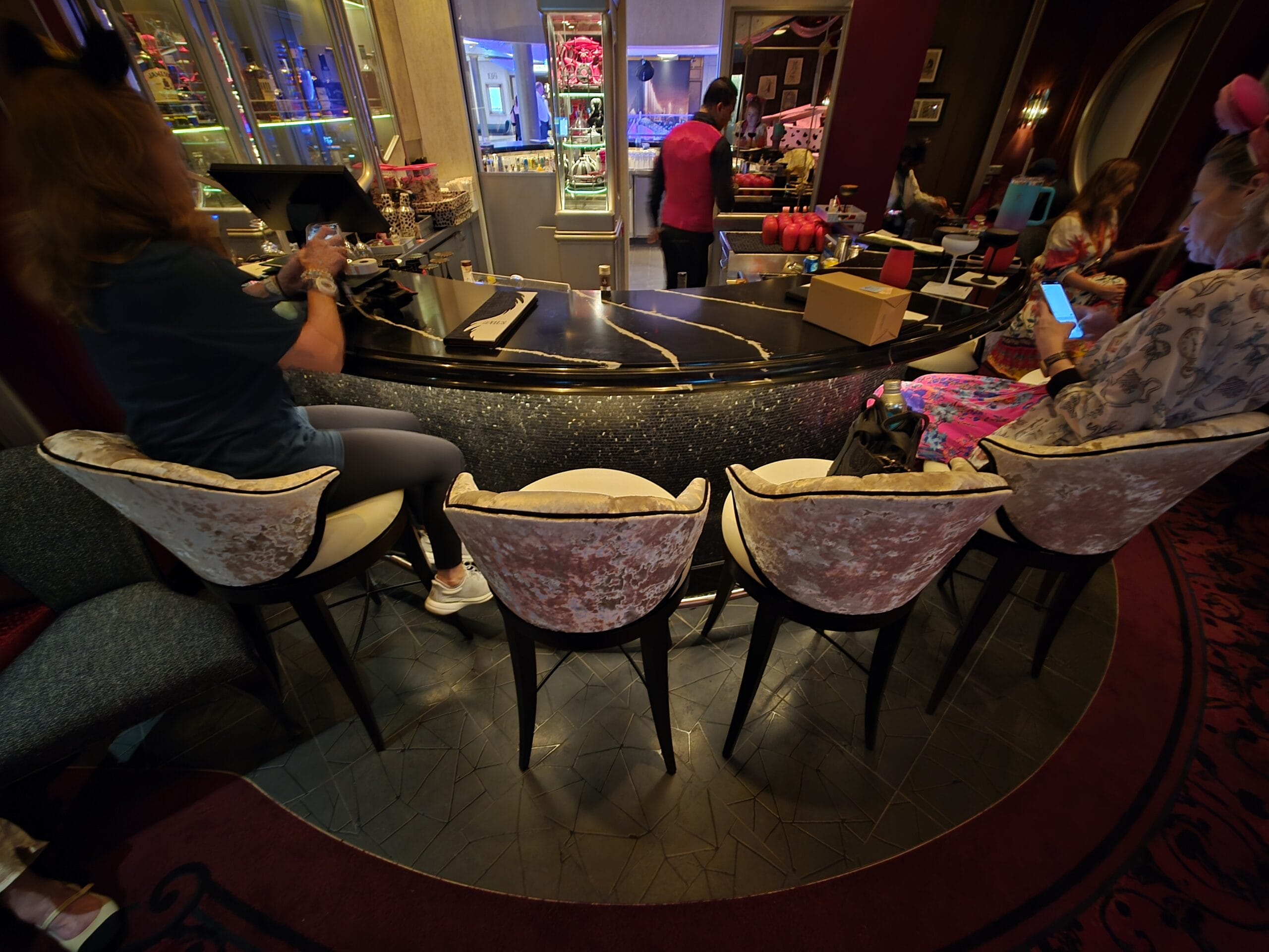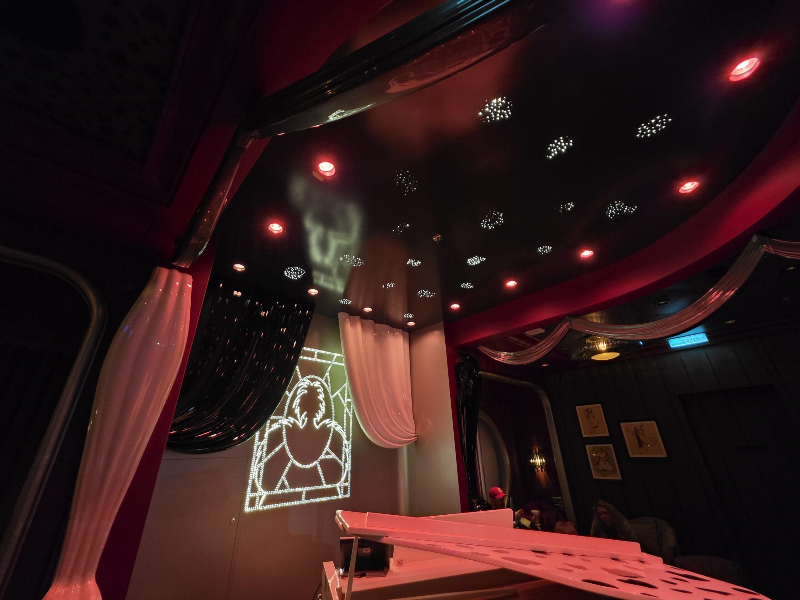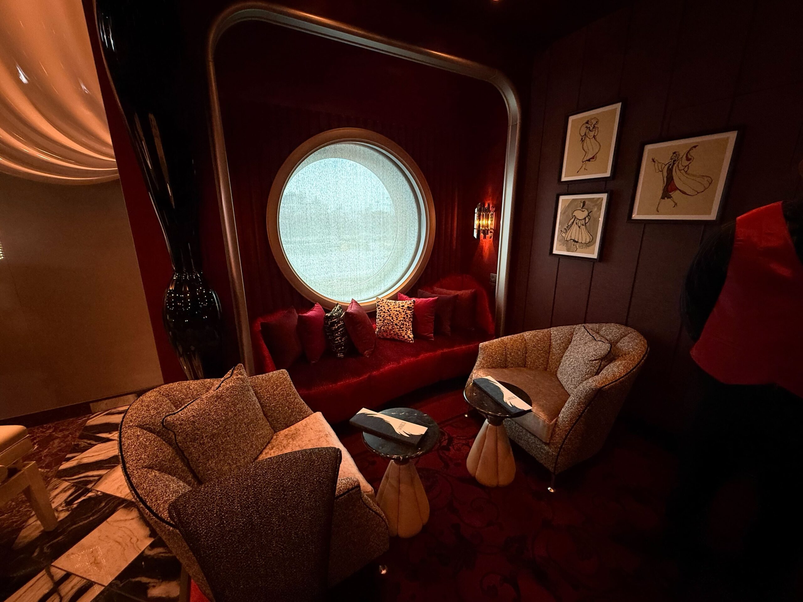 The piano lounge embodies the bold, high-fashion personality of Cruella de Vil from 101 Dalmatians. It feels like stepping into a swanky London lounge. The dominating color palette is red, black, and white.