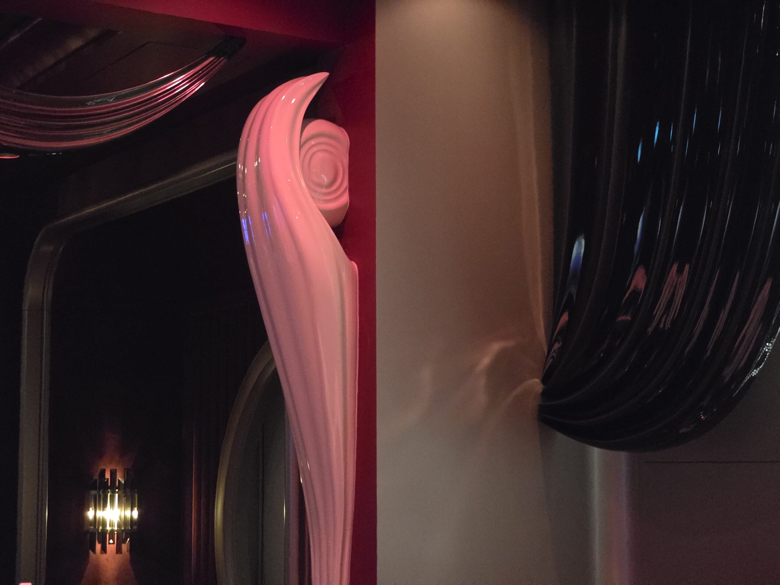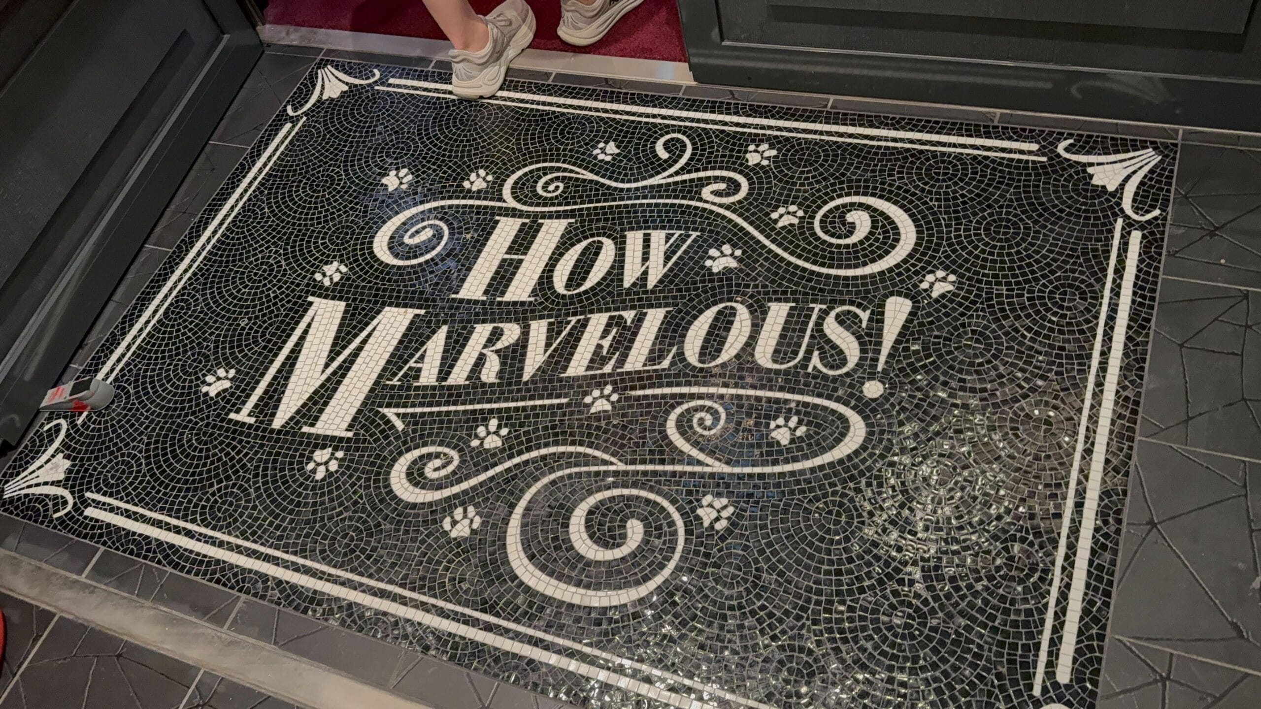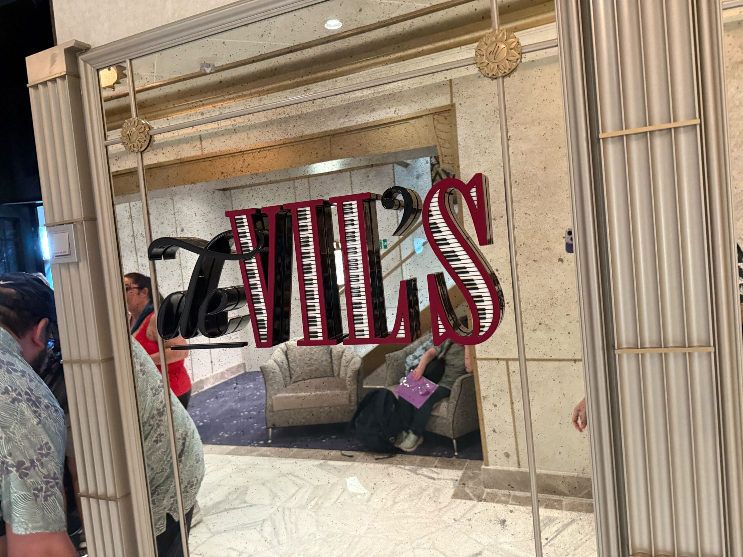 A floor mural outside the lounge reads “How Marvelous!” and a nearby mirror has “De Vil’s” with piano keys filling in the red-outlined letters.