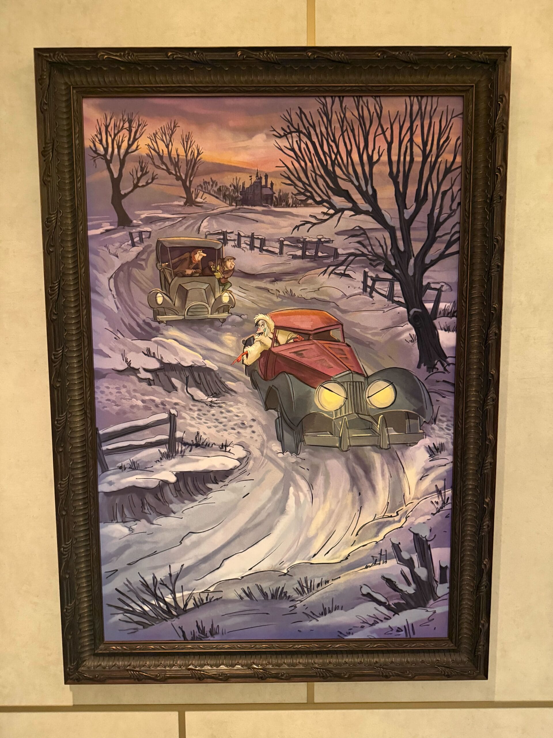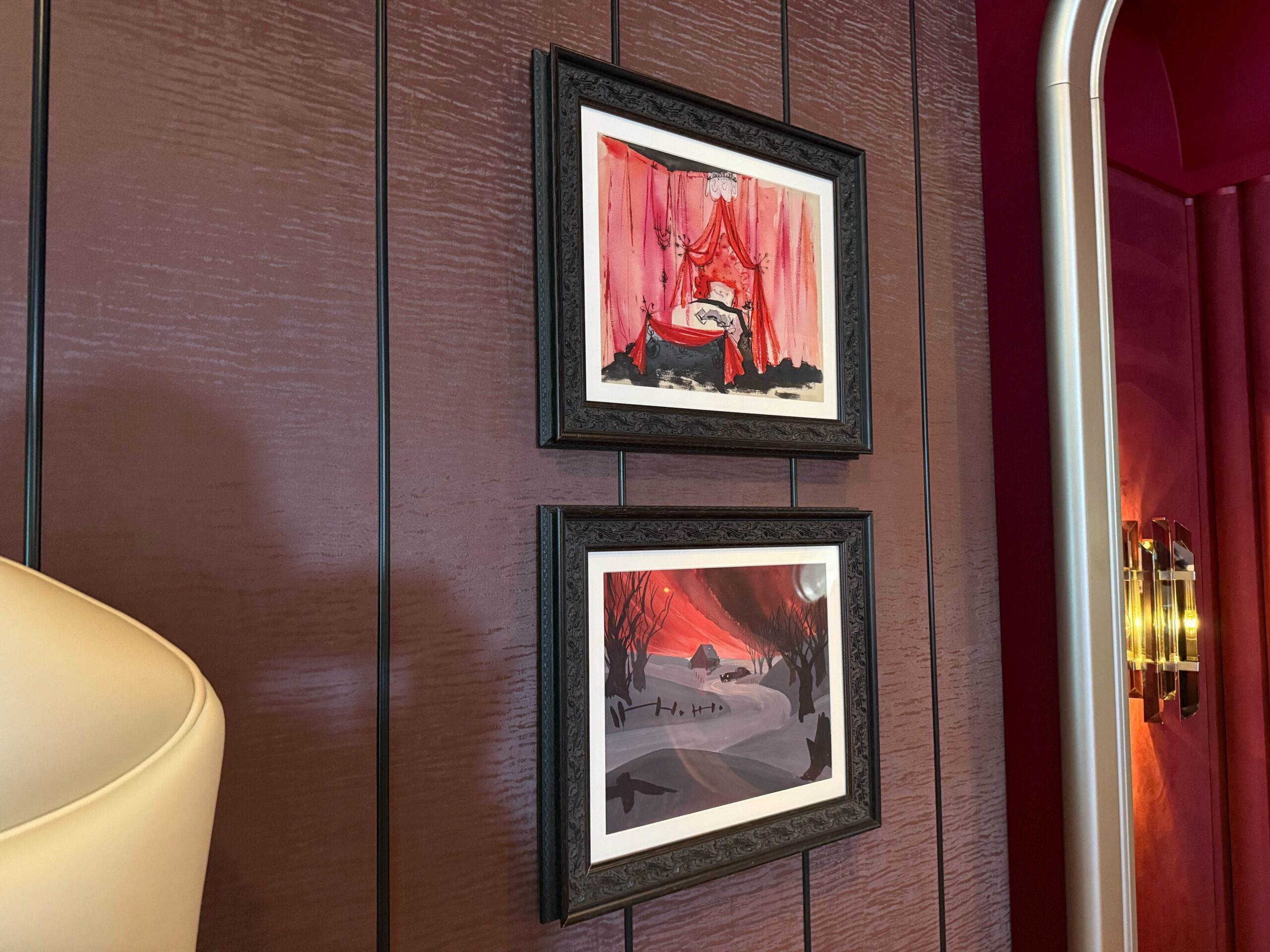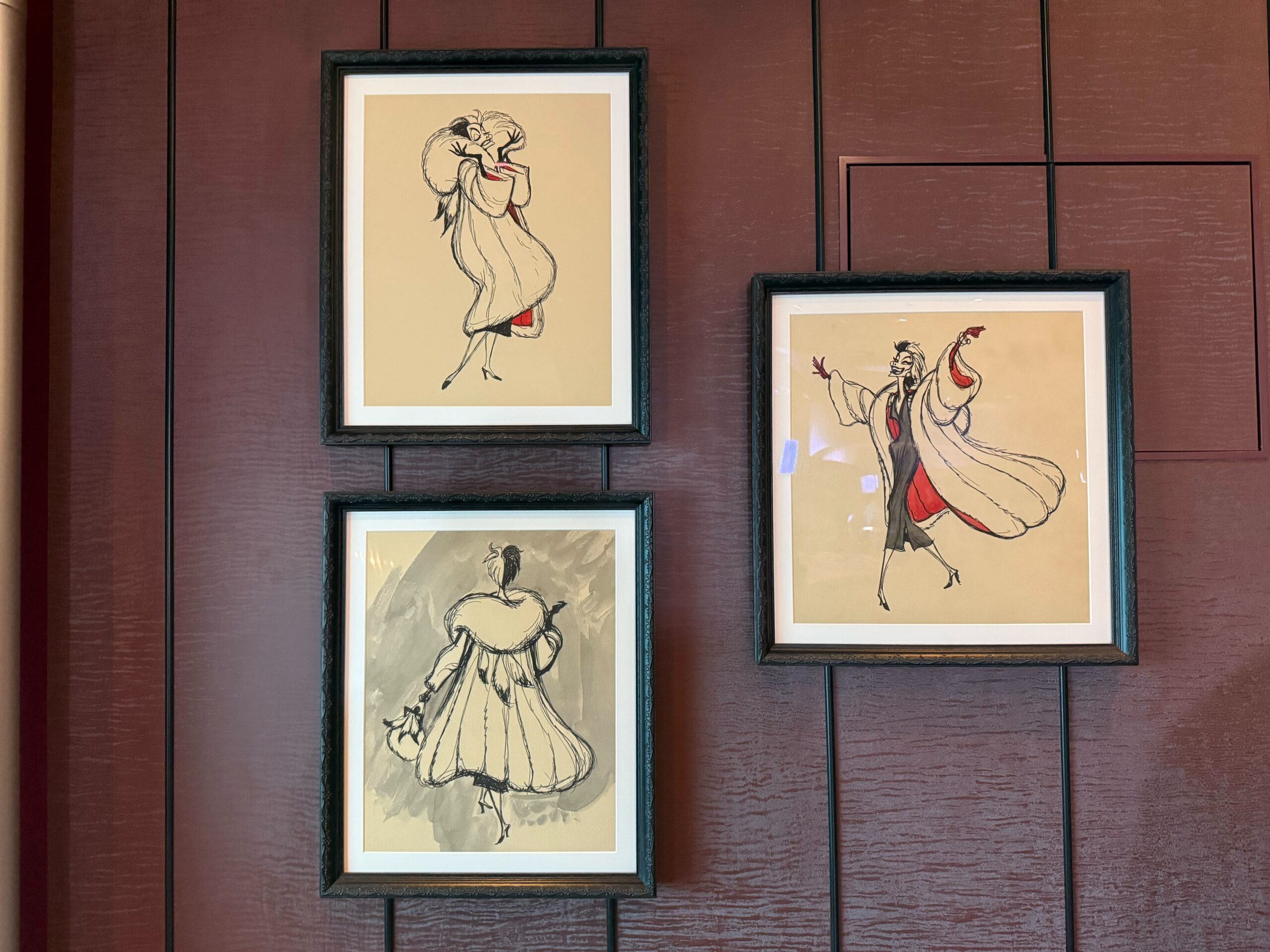 Several pieces of artwork line the burgundy paneled walls, including fashion sketches of Cruella and scenes from 101 Dalmatians.
