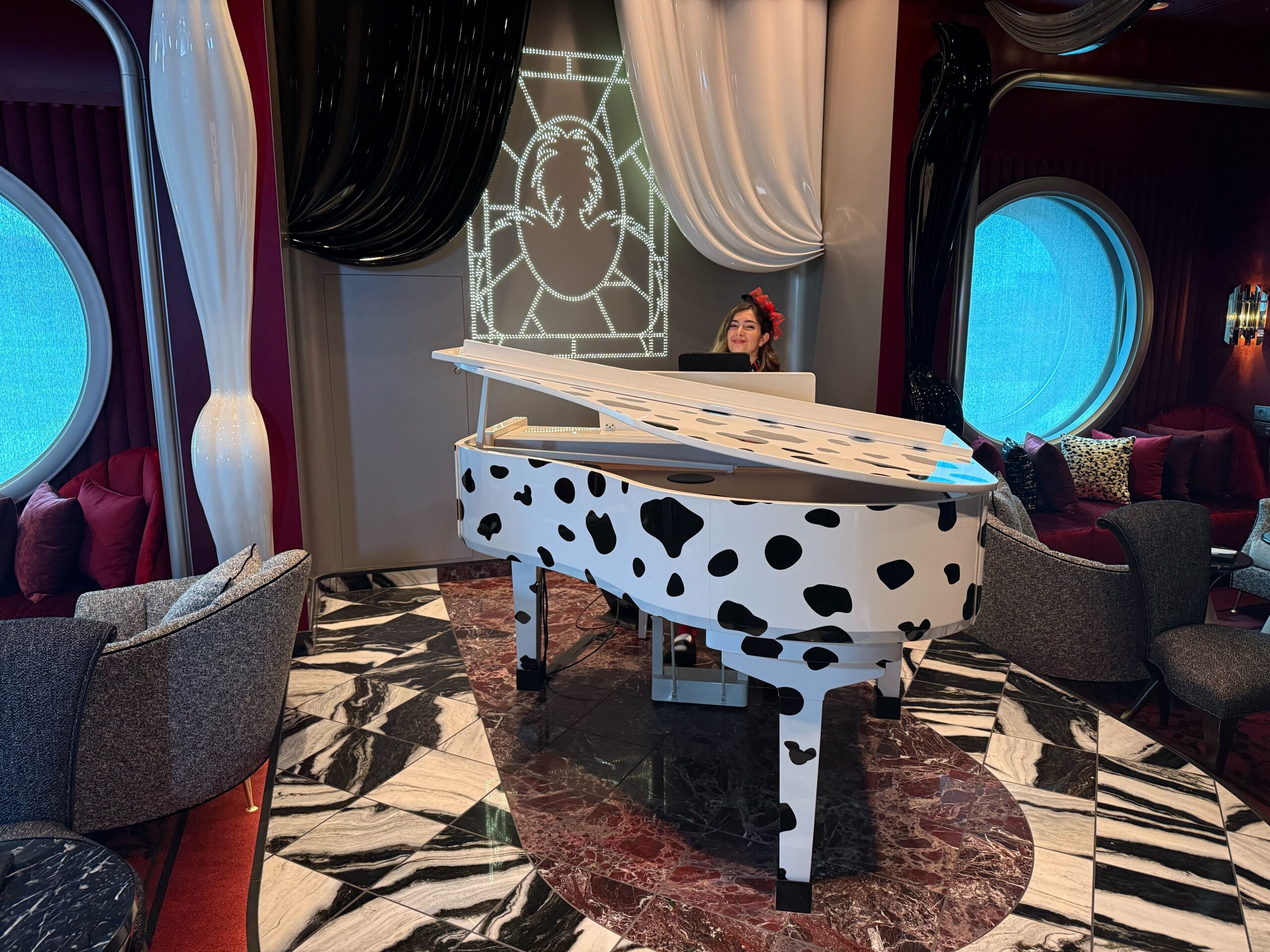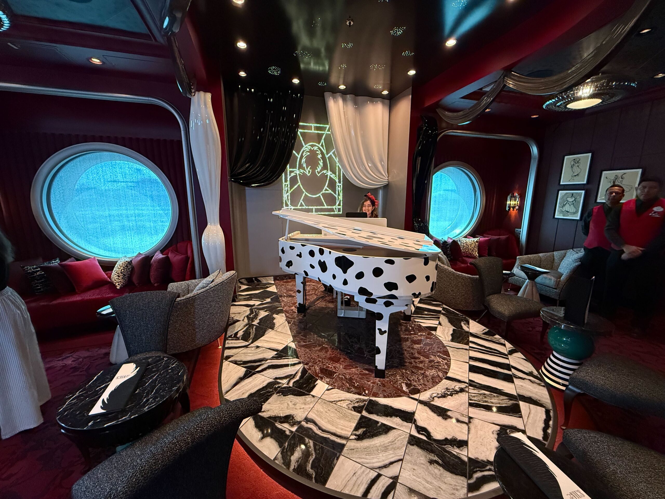 Step into 101 Dalmatians with the new De Vil’s Piano Lounge on the Disney Destiny cruise ship. The piano lounge is located on Deck 3 near the Grand Hall, and we got to take an in-person tour of the space.