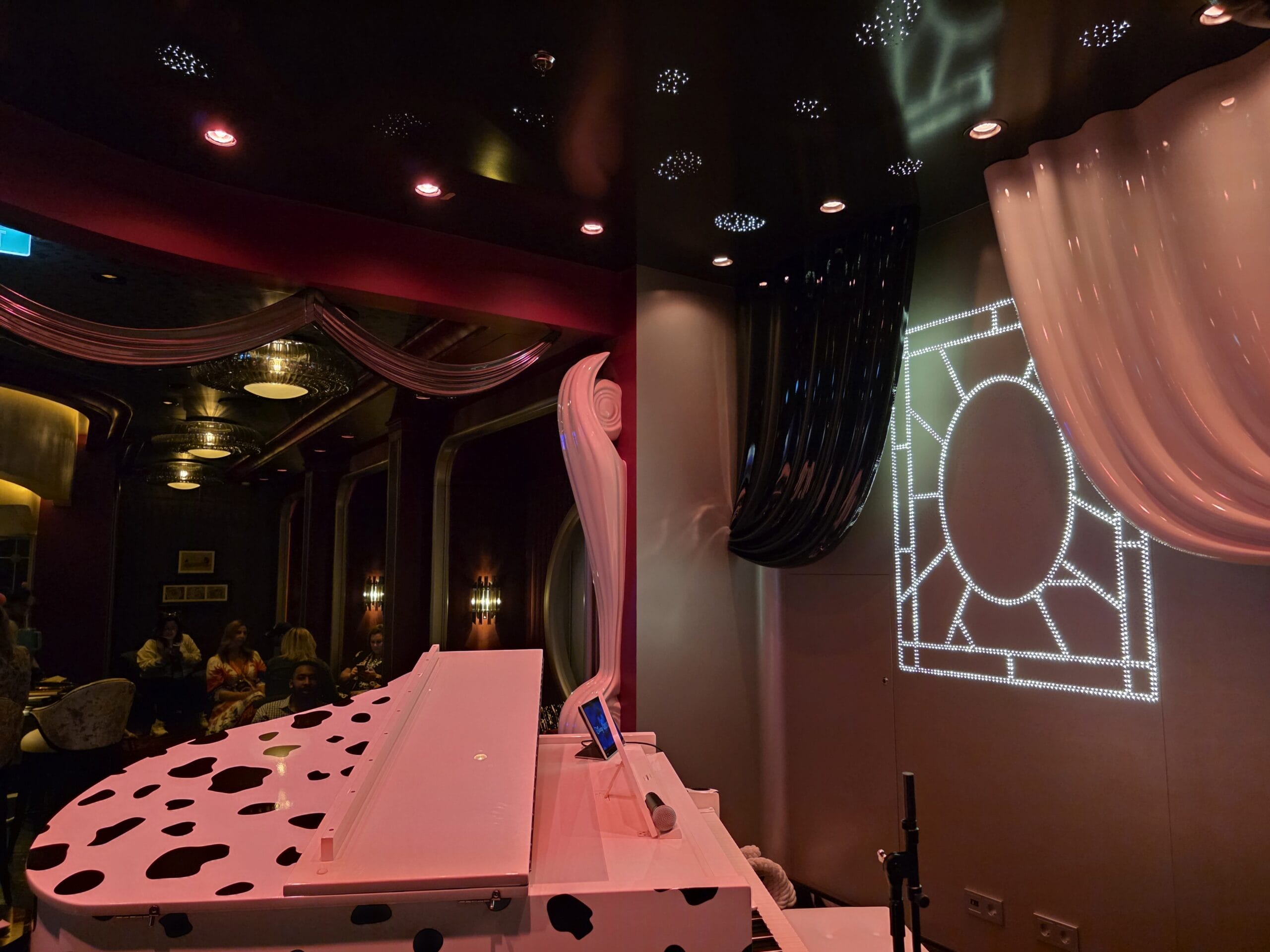 The centerpiece of the lounge is the Dalmatian-spotted piano, which stands on a small circular marble stage. The black and white designs look like piano keys. The black and white draped curtains behind the piano surround glowing wall art of Cruella herself.