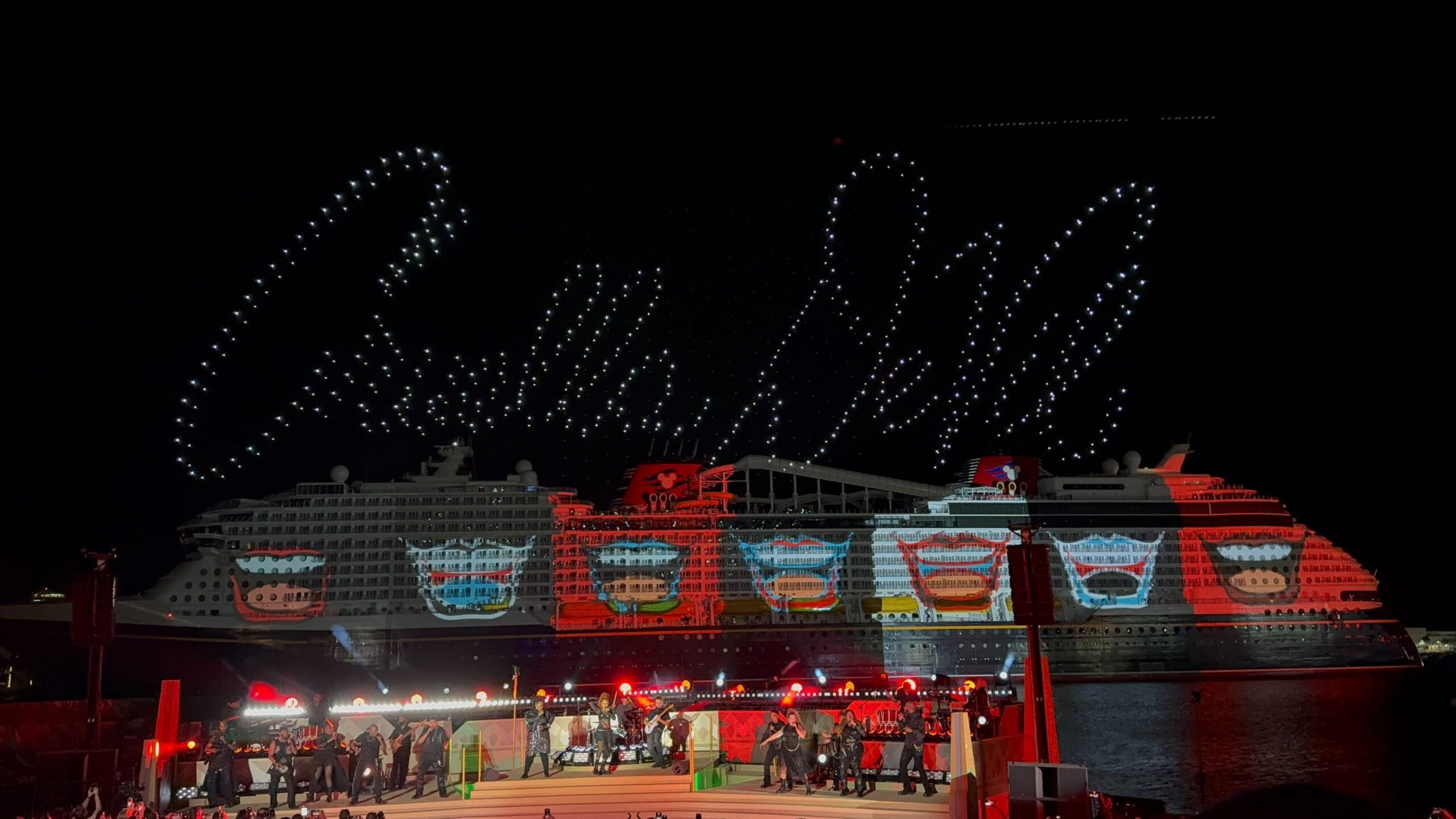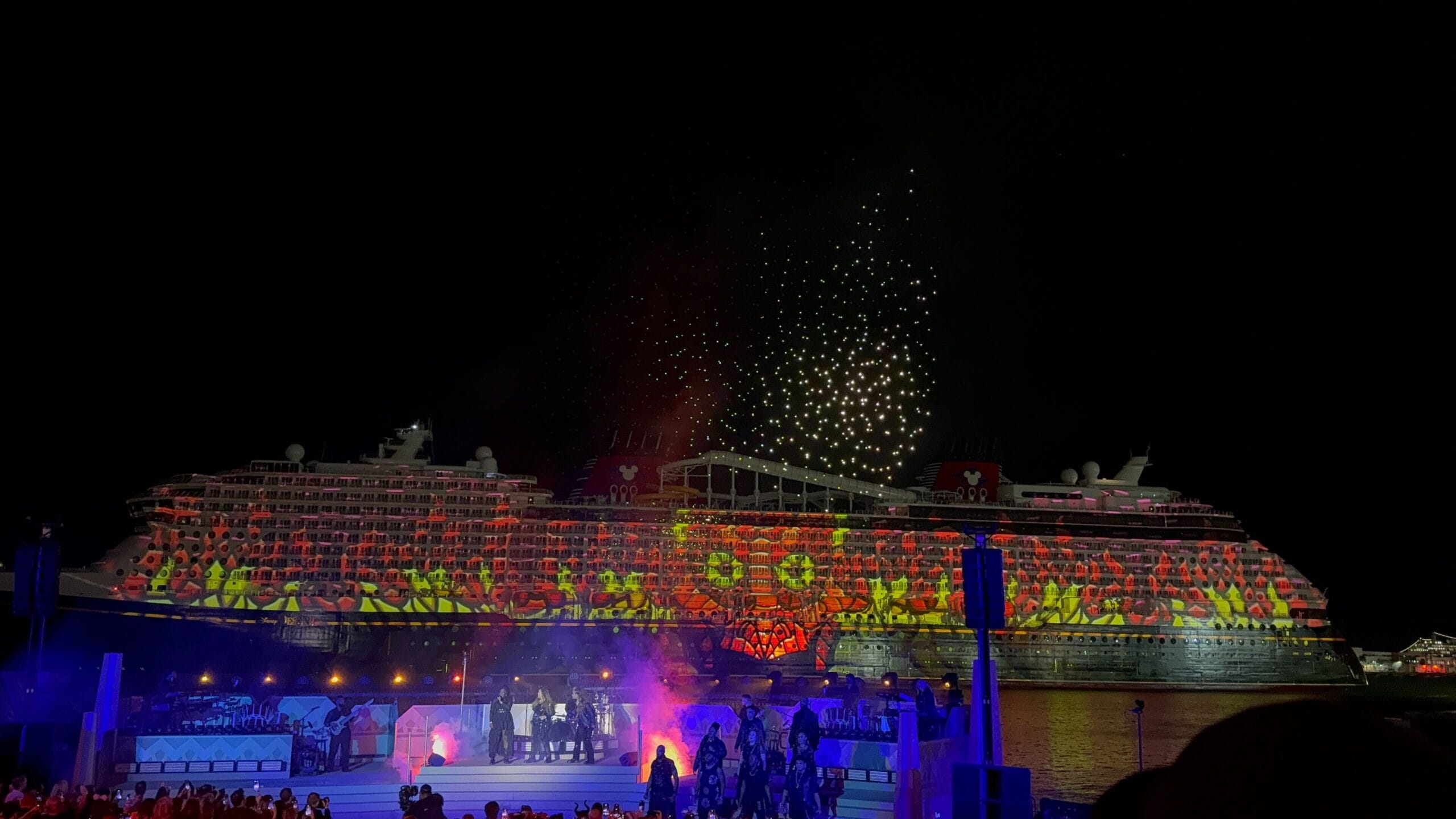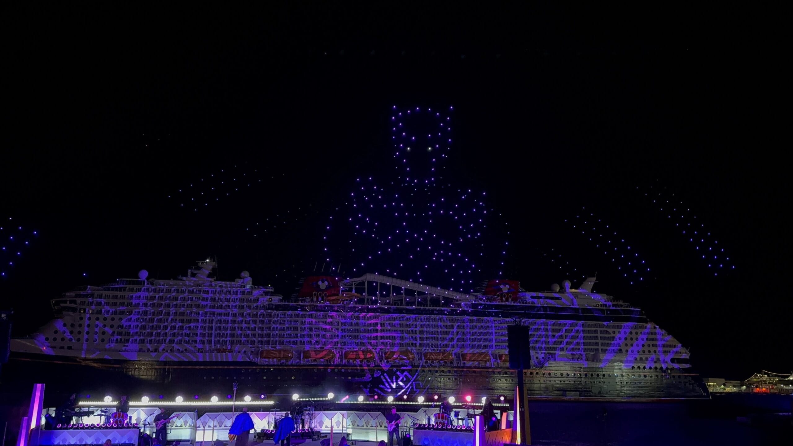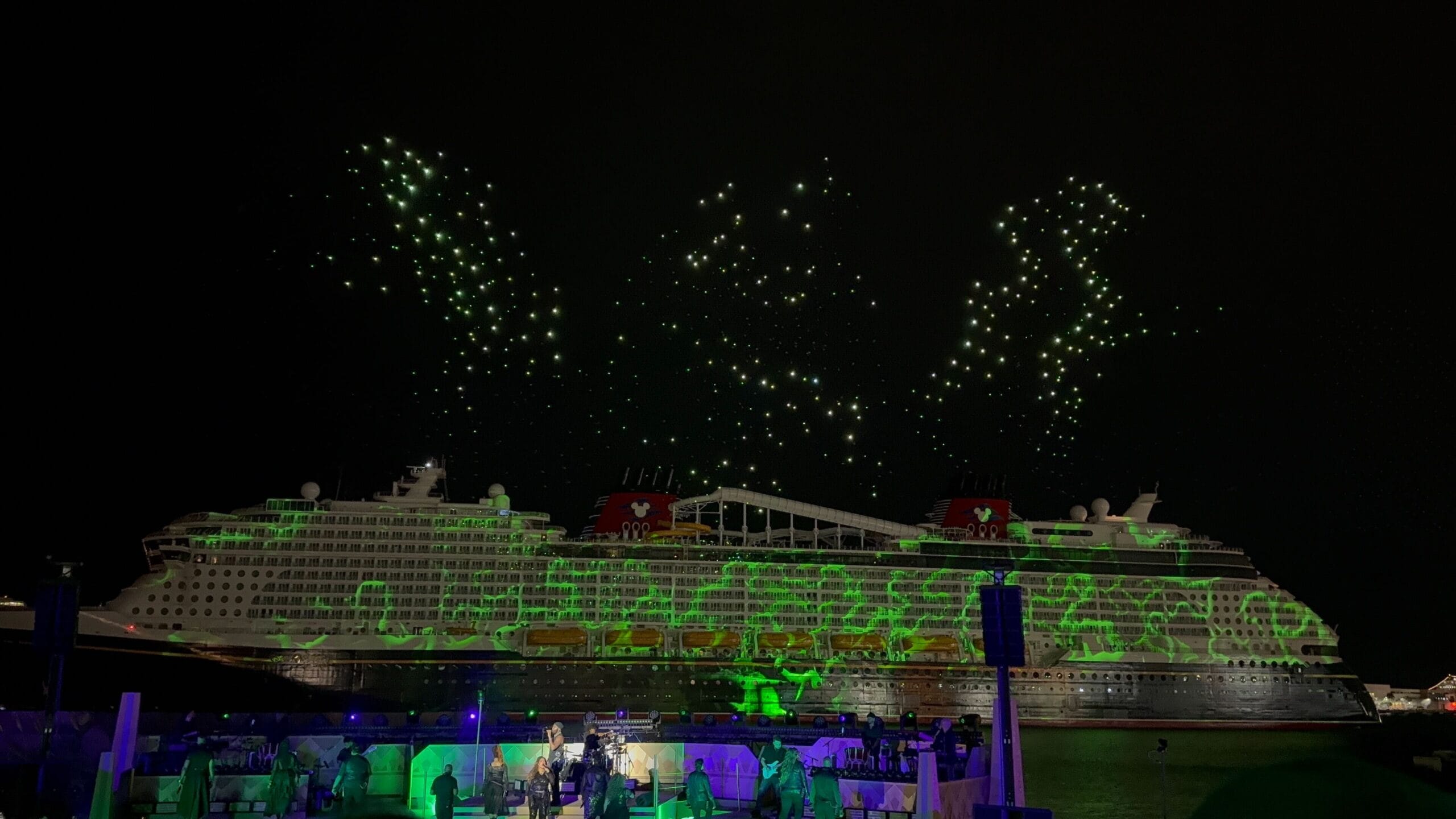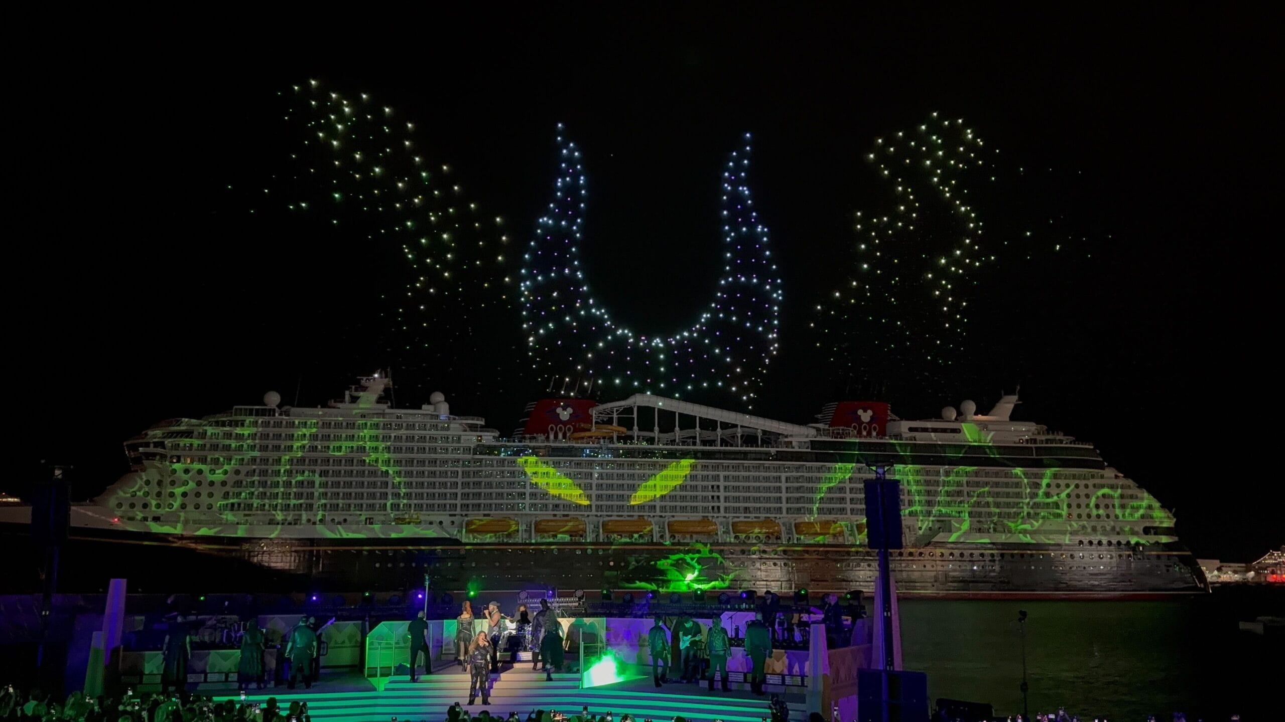 Things then took a fashionable shift as Cruella de Vil took over, covering the ship in all variety of spots as the band played her theme song and drones spelled her signature. De Vil’s is the ship’s piano lounge.
