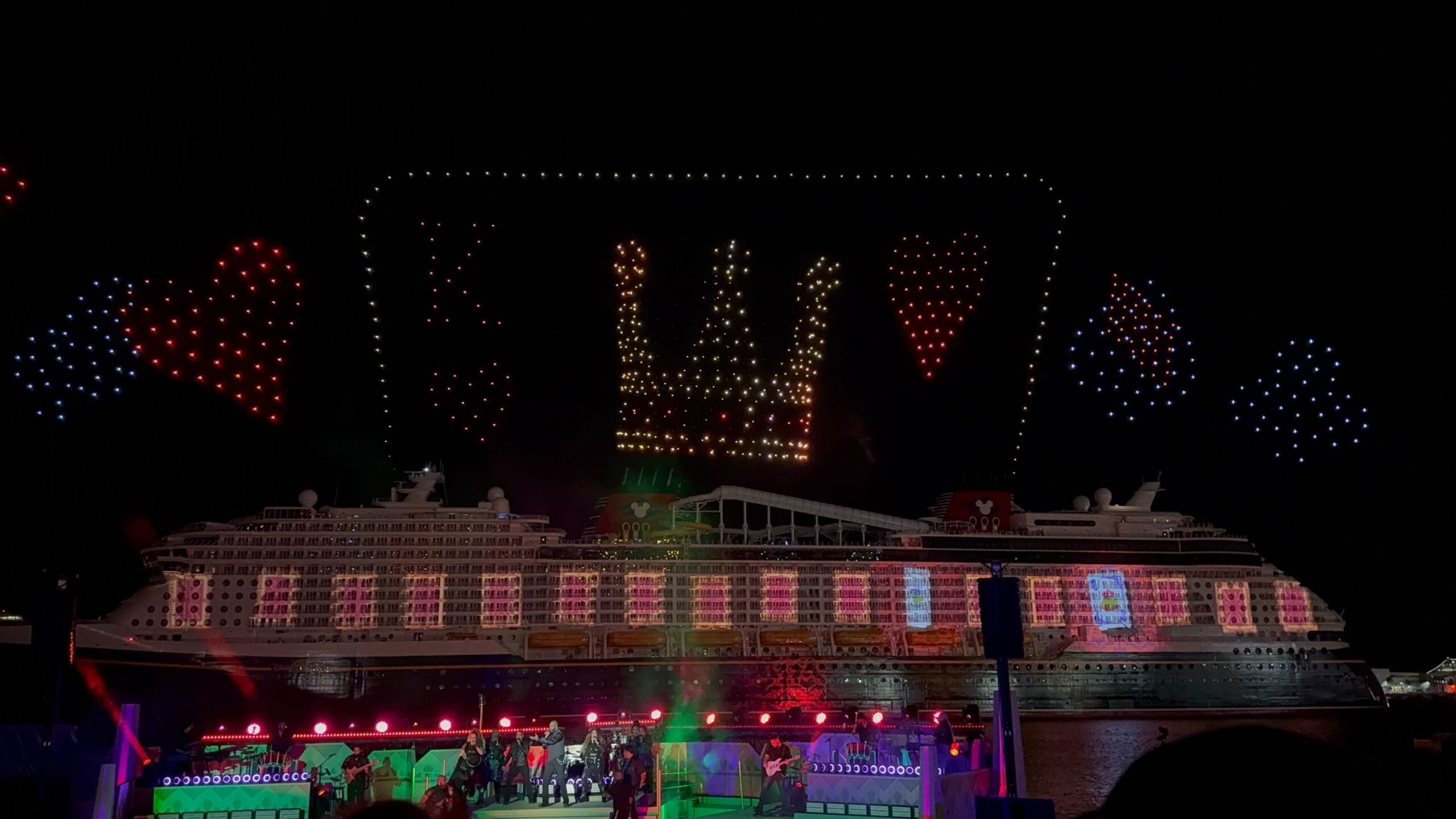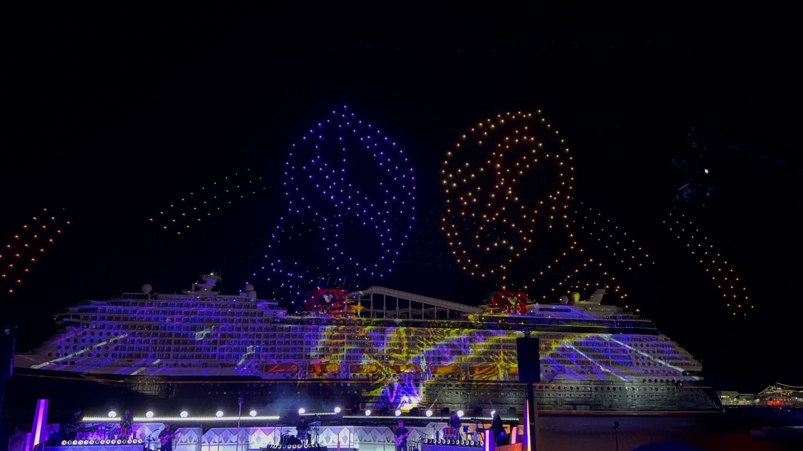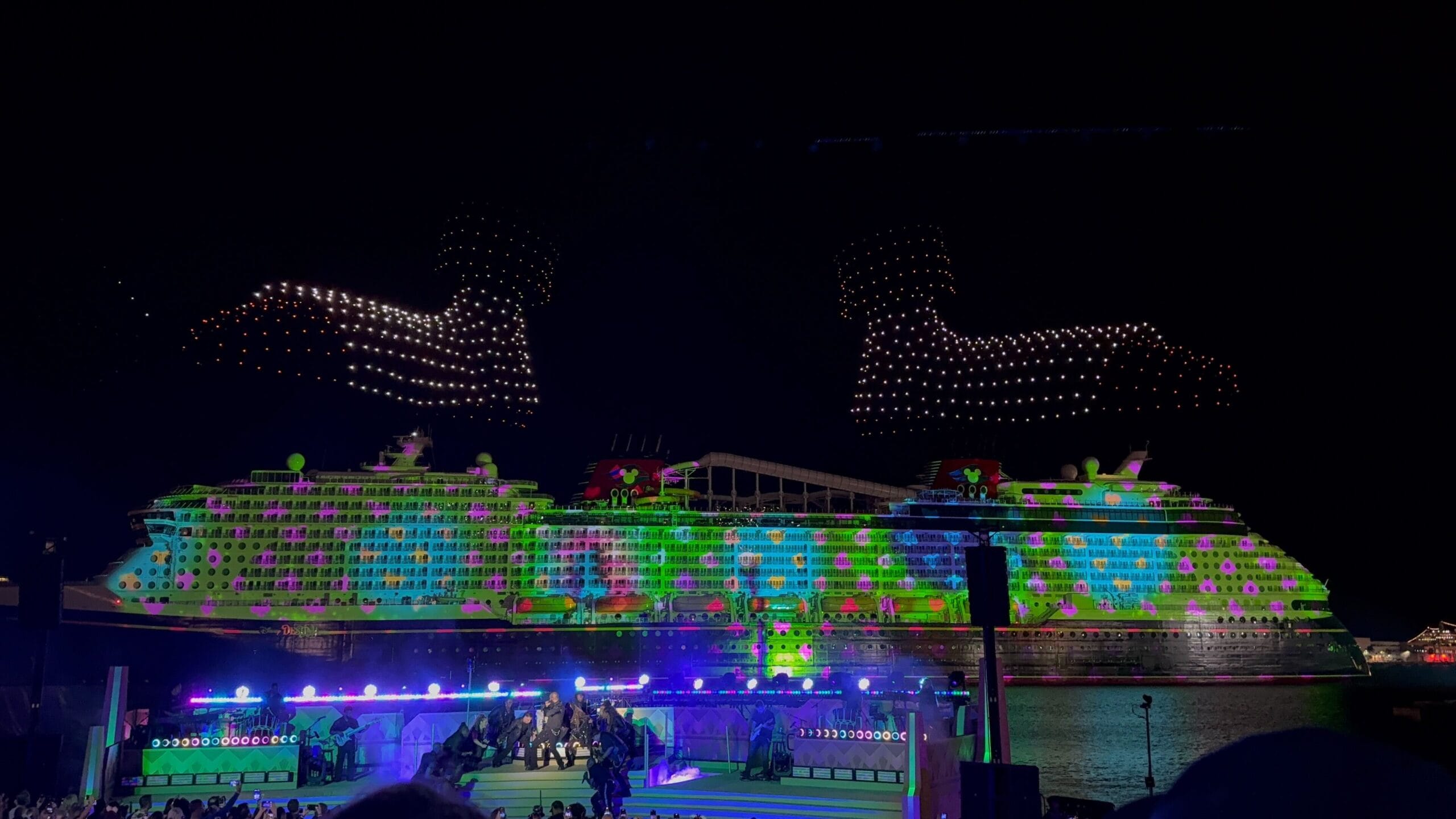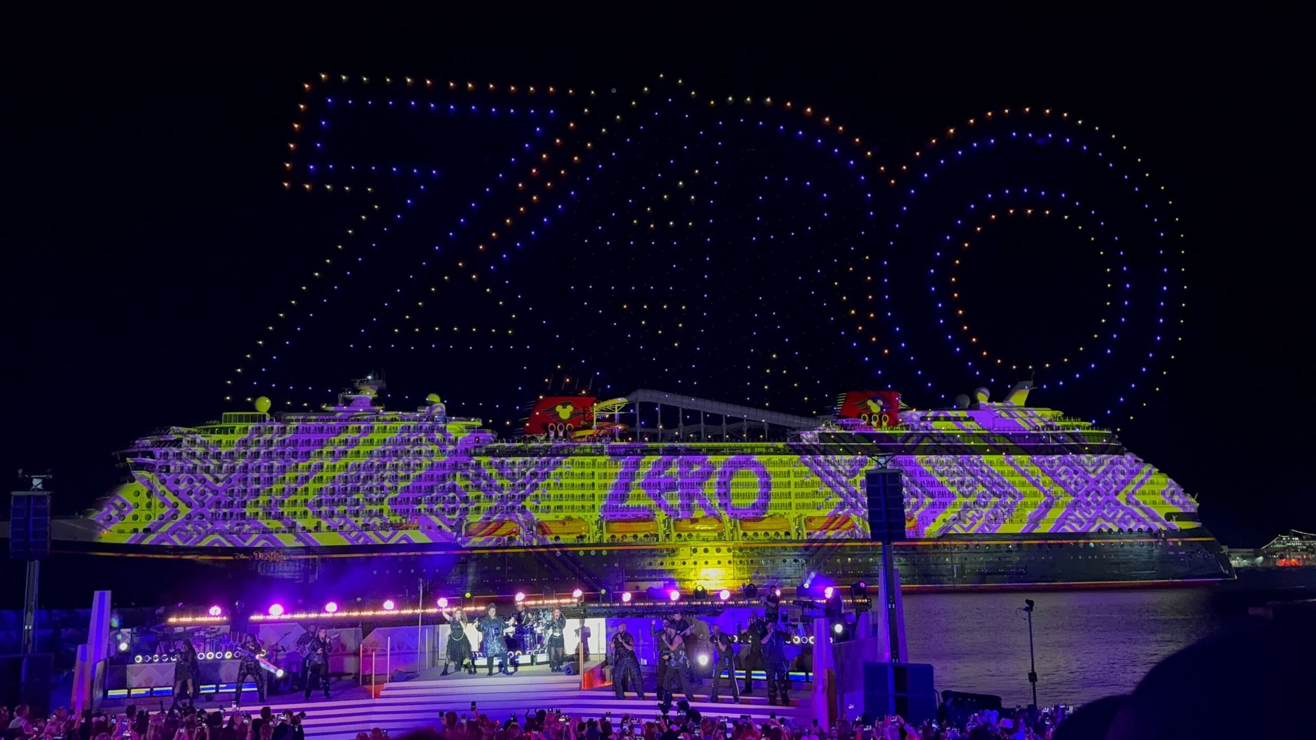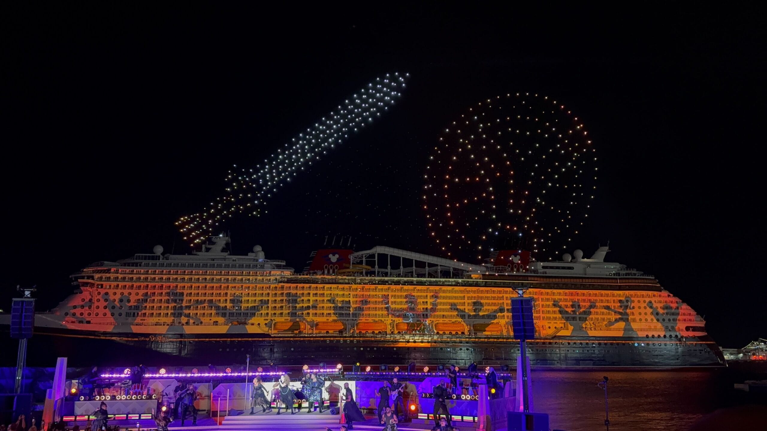 Things then took a fashionable shift as Cruella de Vil took over, covering the ship in all variety of spots as the band played her theme song and drones spelled her signature. De Vil’s is the ship’s piano lounge.