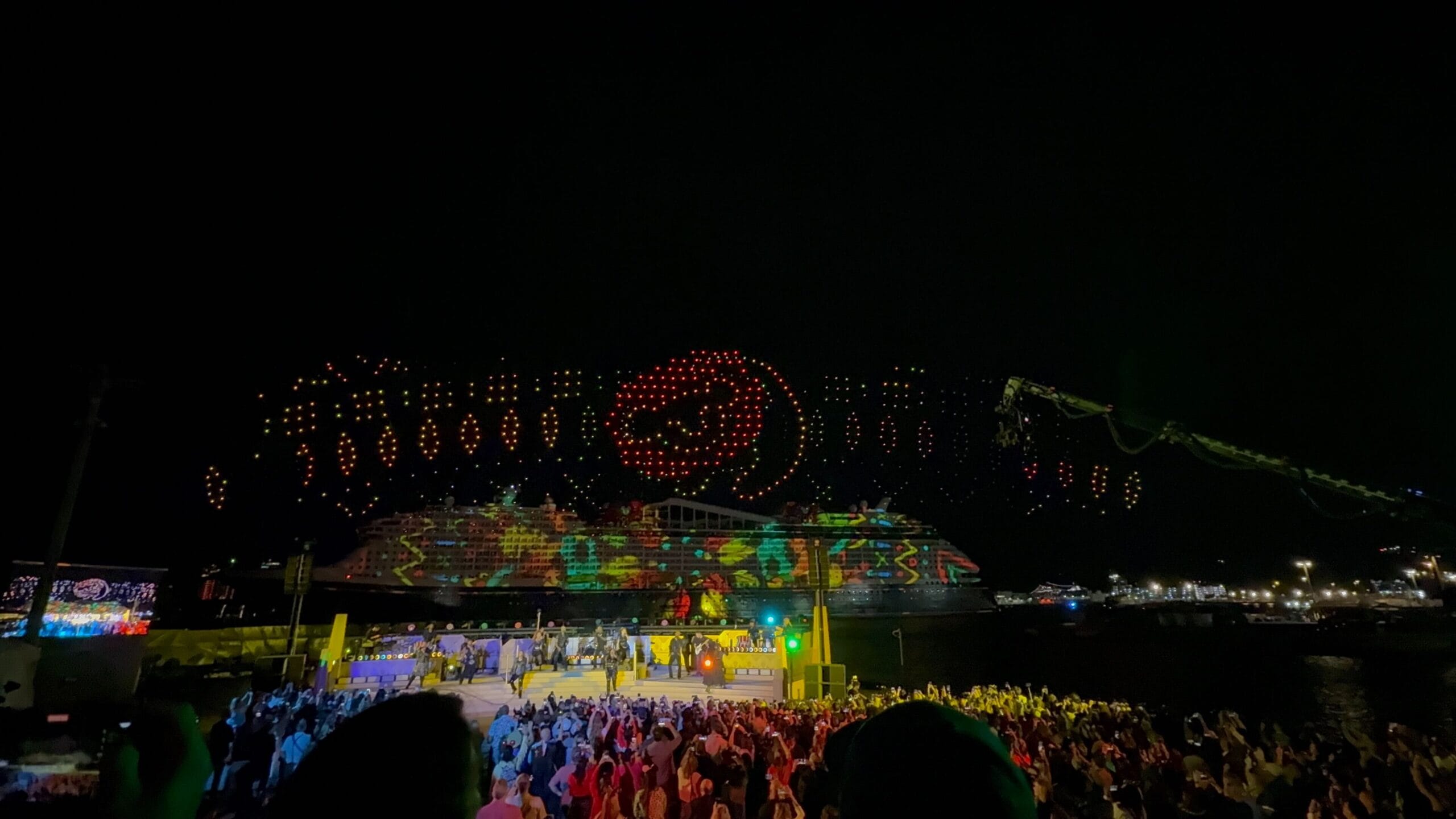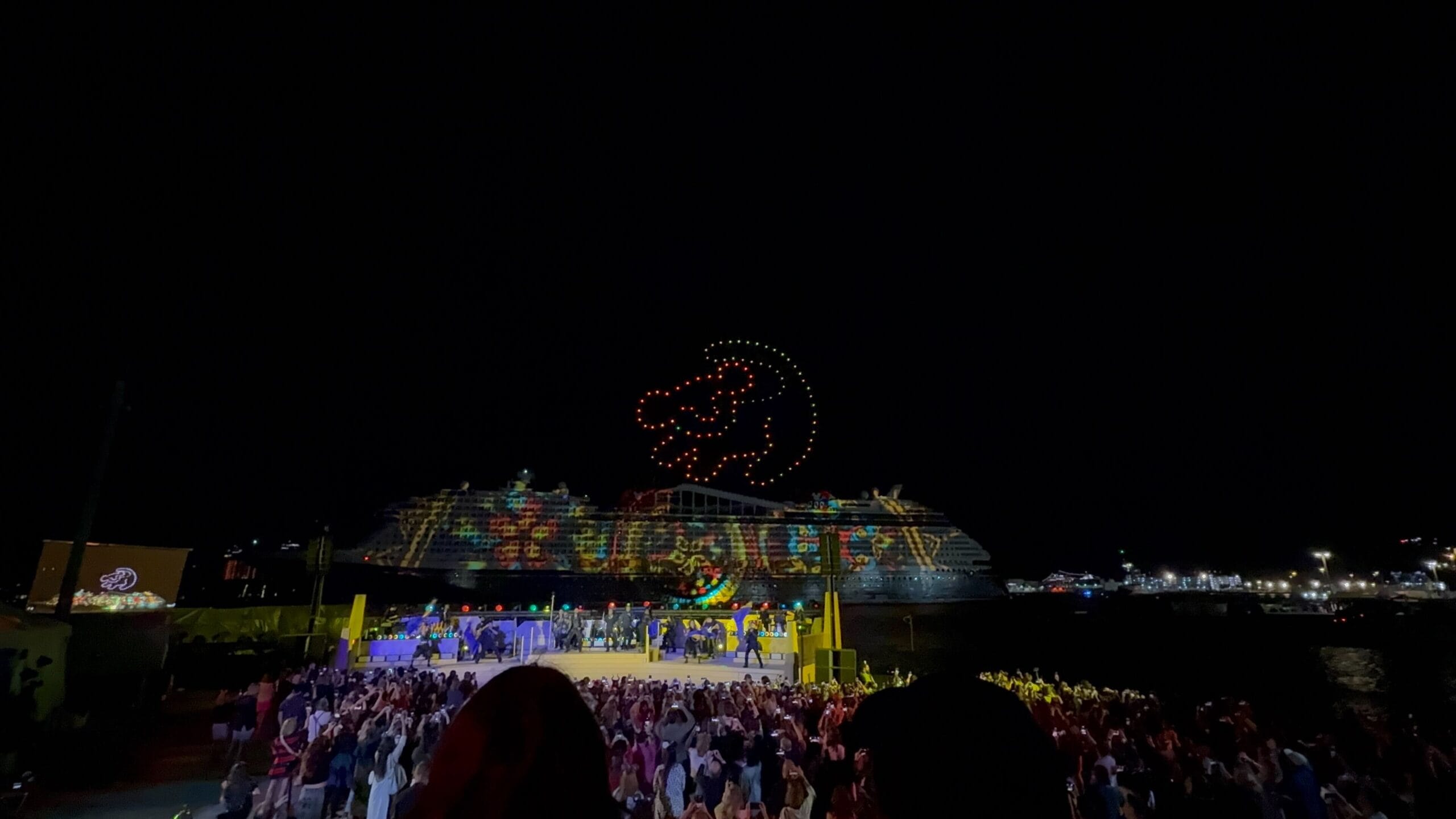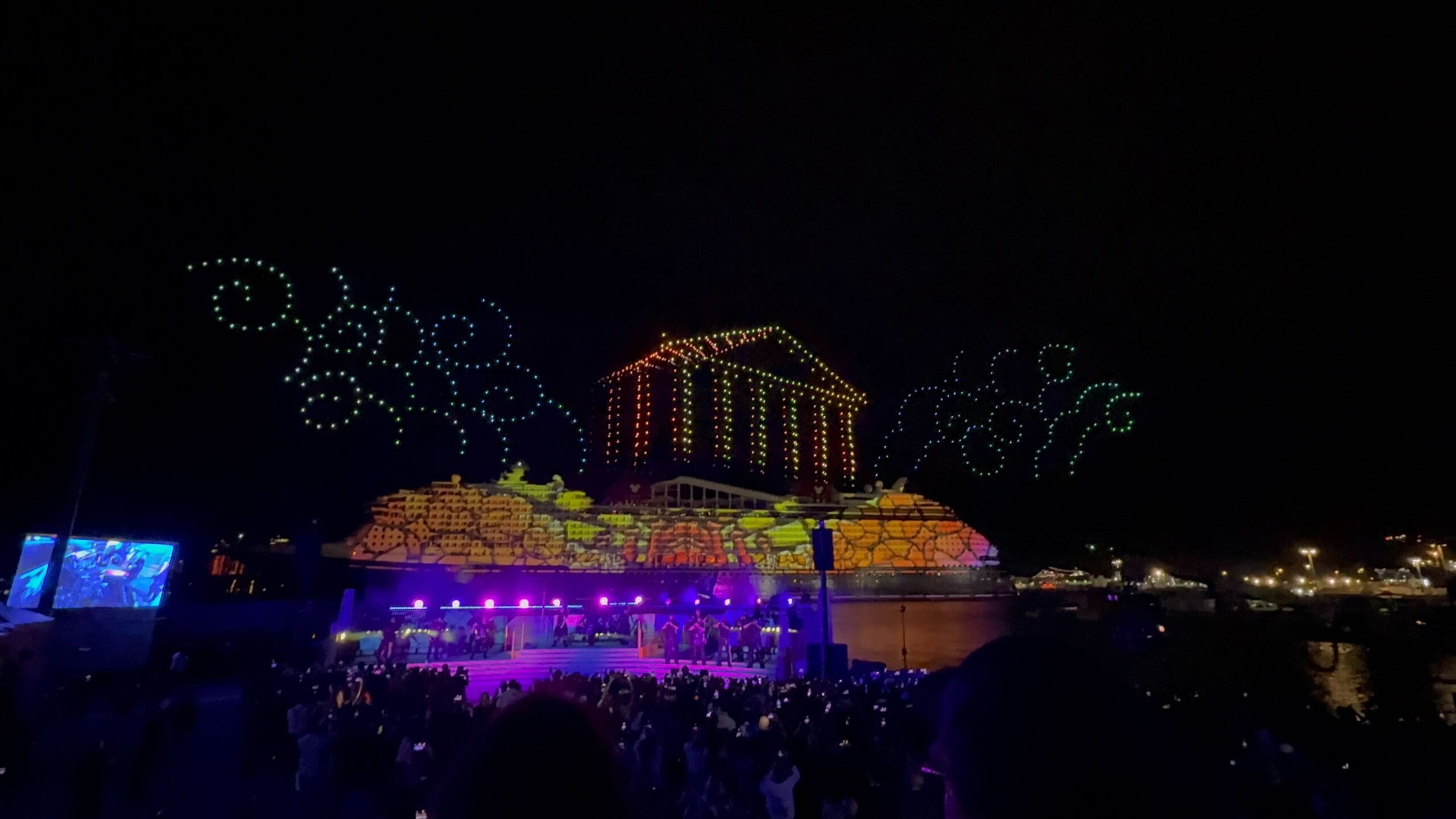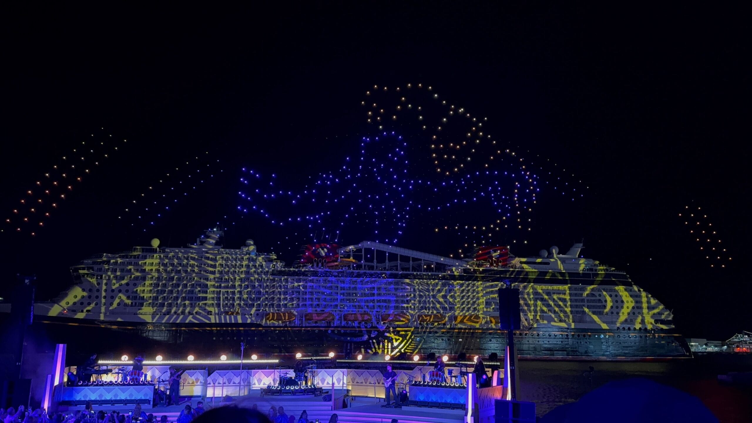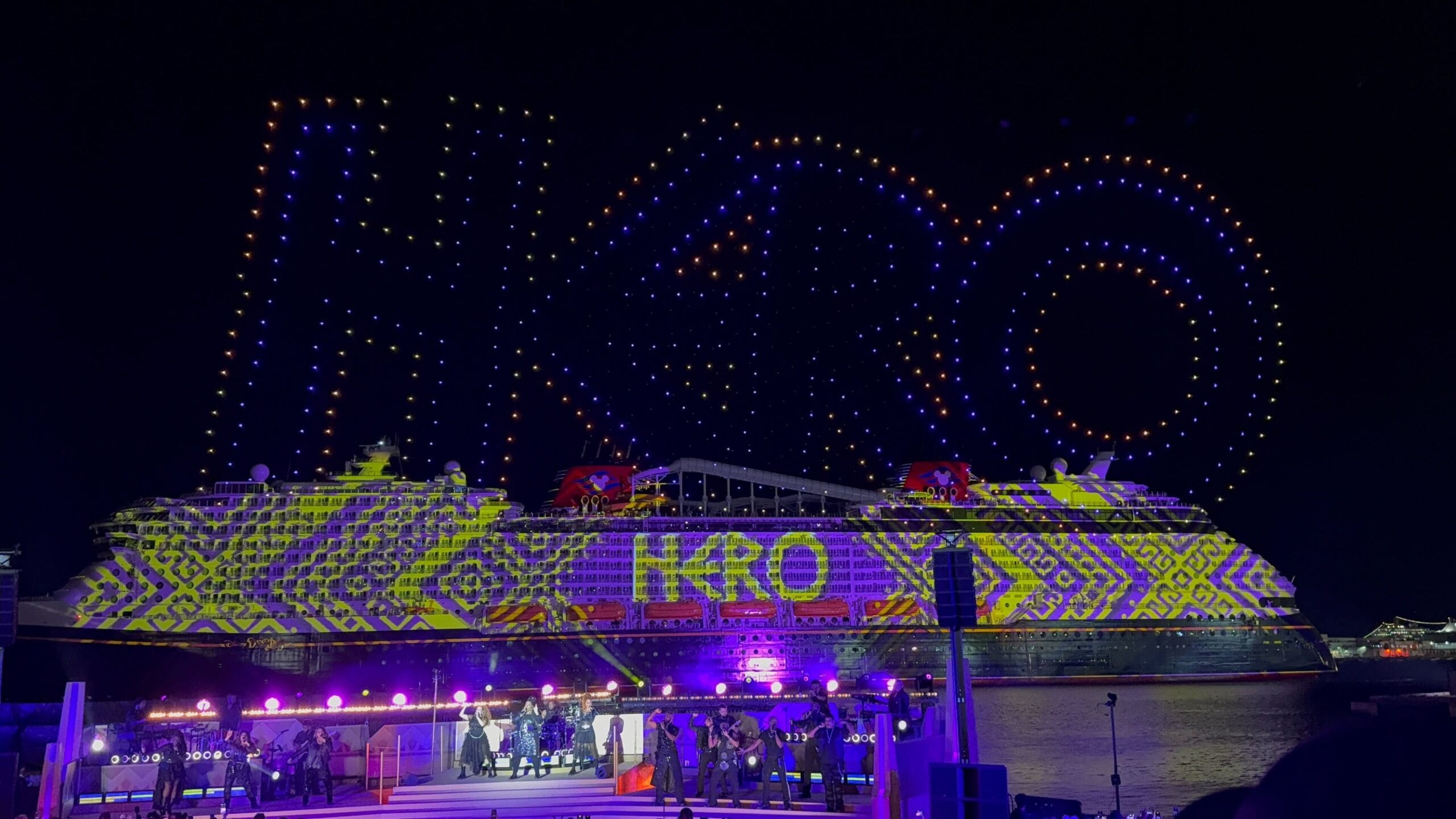 After projections and drones forming Hades and Mount Olympus, we got a rousing rendition of “Zero to Hero” with accompanying visuals and drone “fireworks.” Hercules is the Destiny’s exclusive Broadway-style show and the movie and characters are also featured all around the ship.