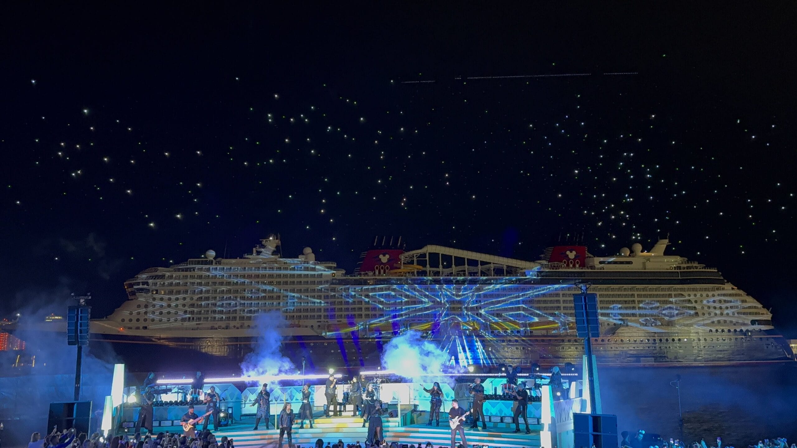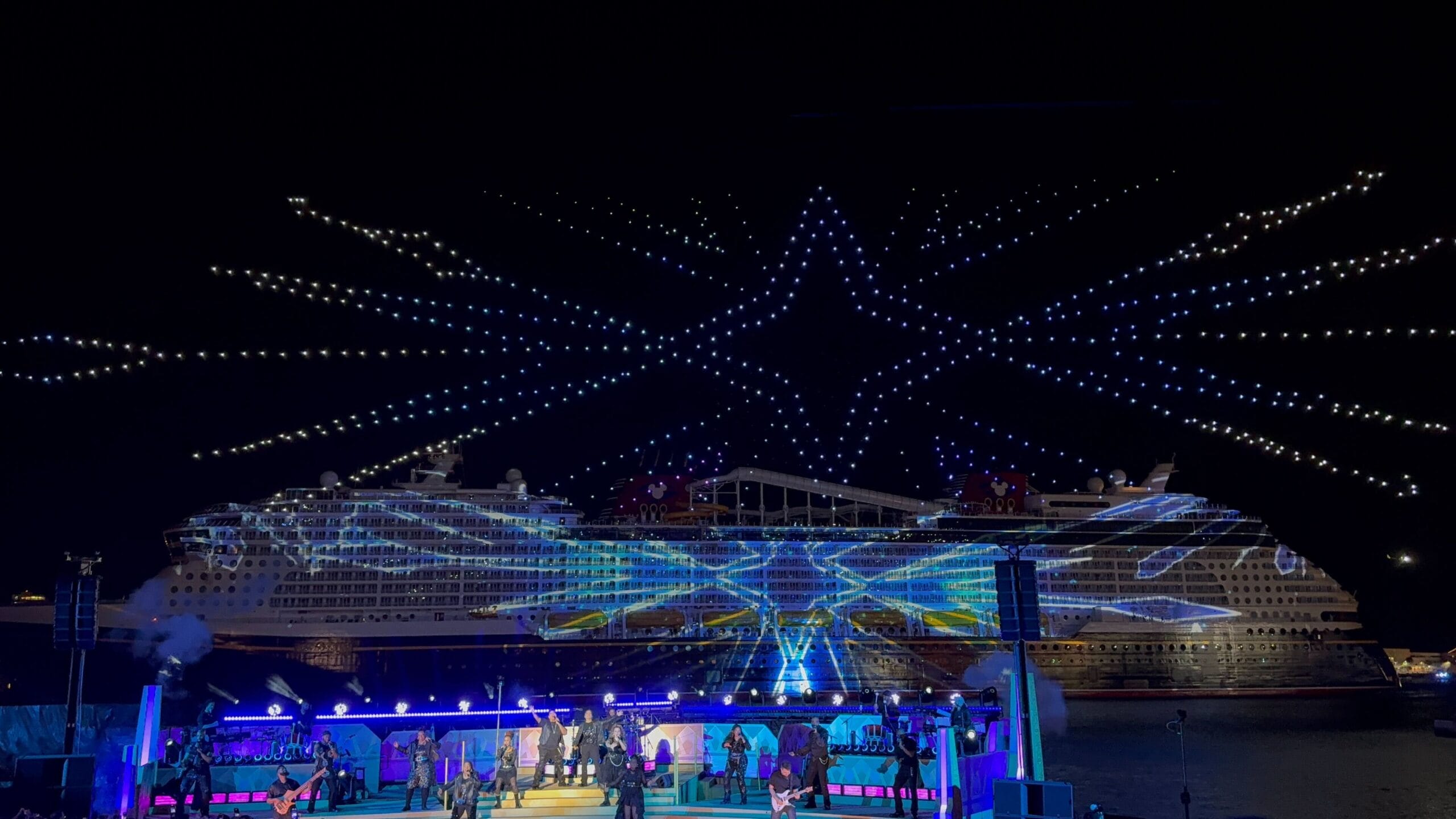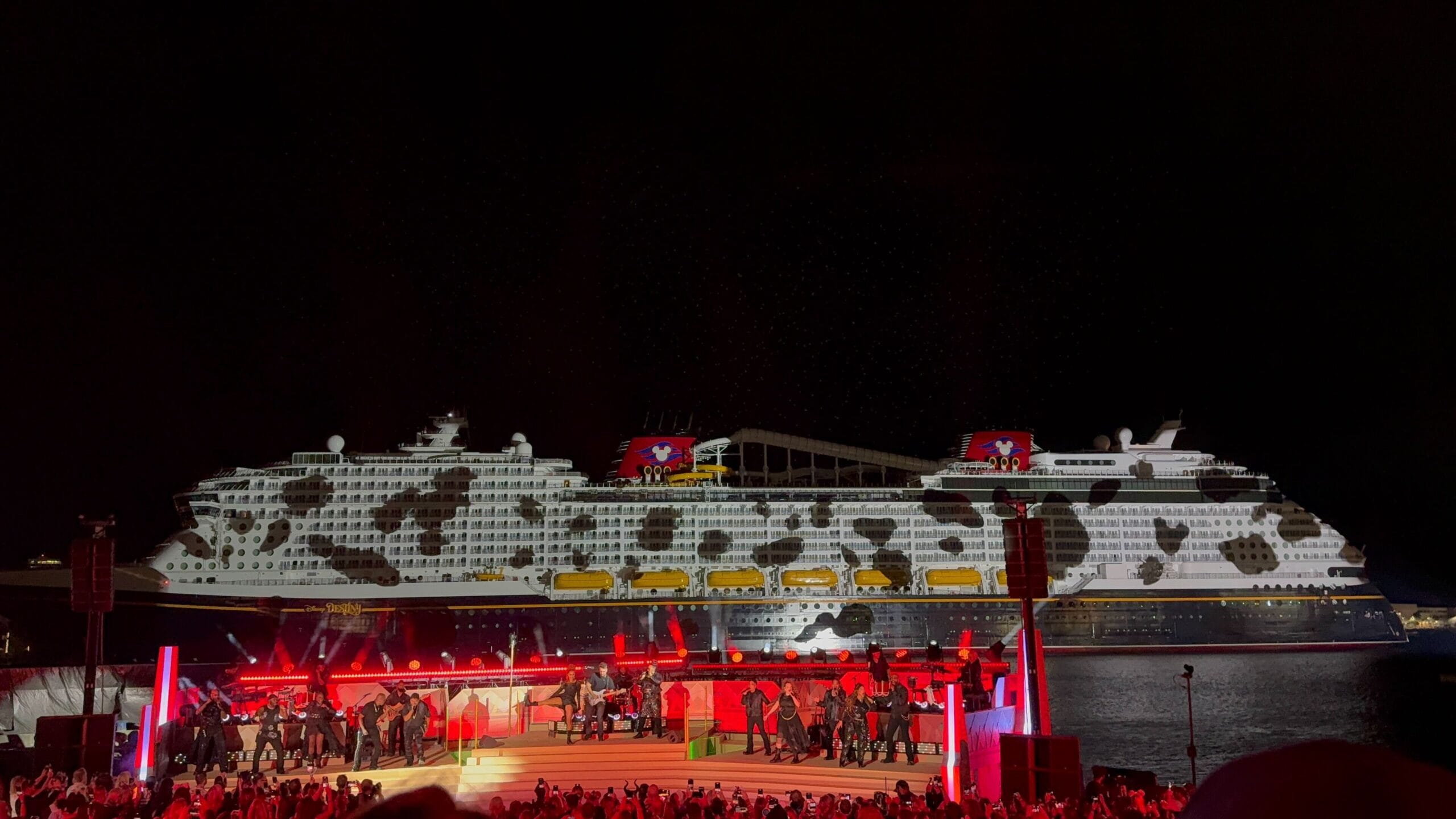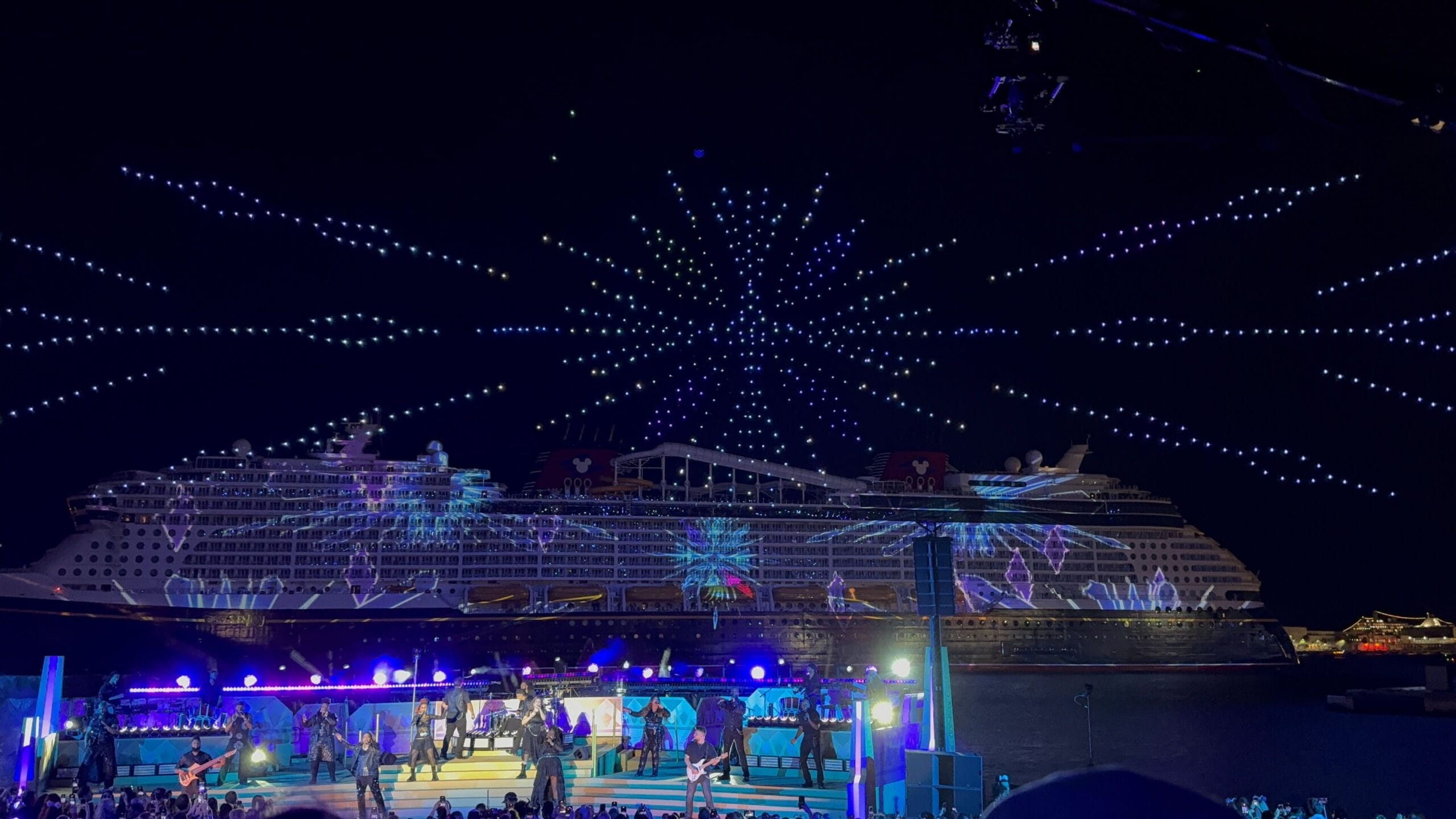 As the sky filled with icy stars, the singers performed a medley of “Into the Unknown” and “Let It Go.” Frozen is one of the Broadway-style shows being performed on the Destiny.