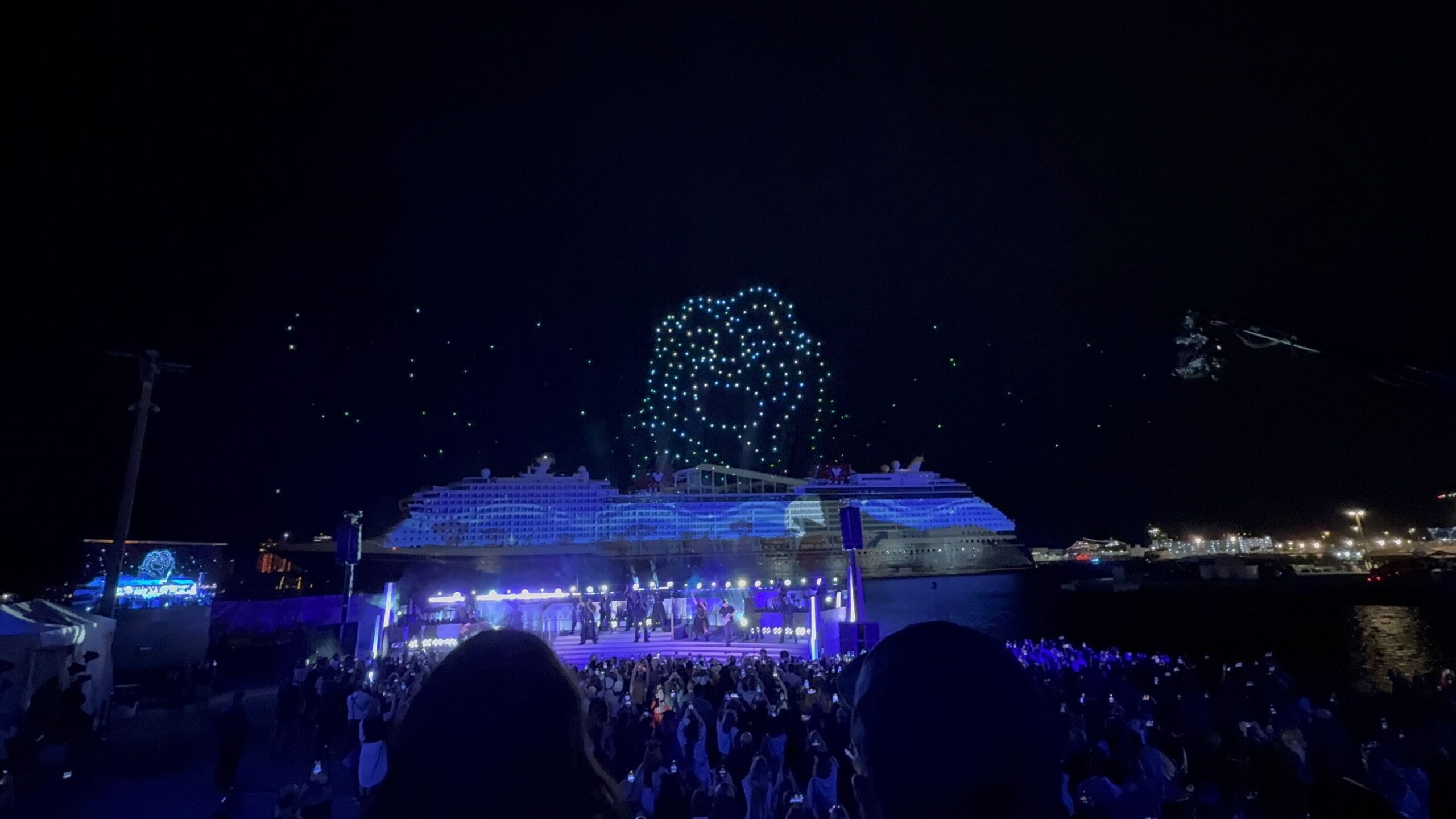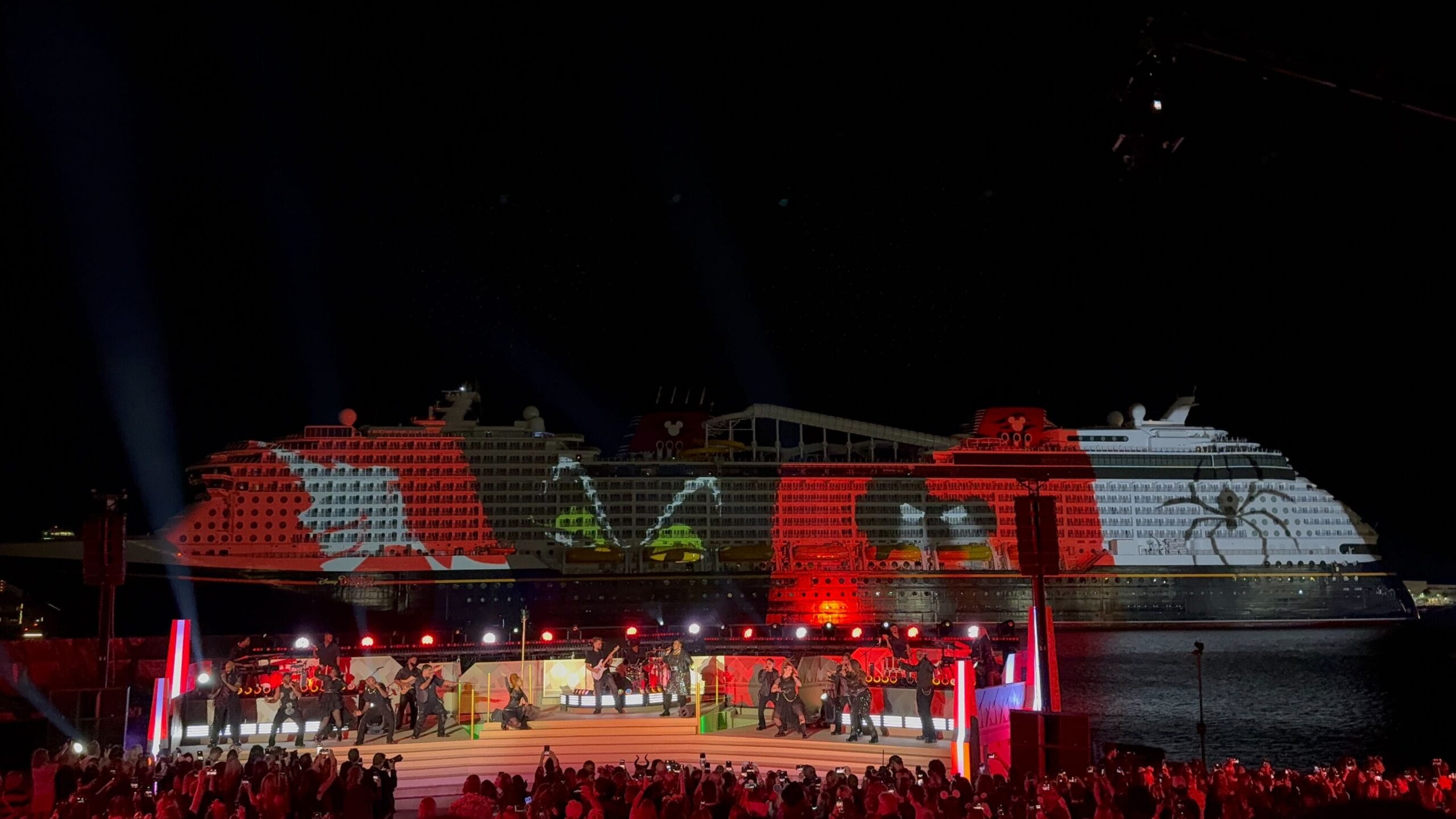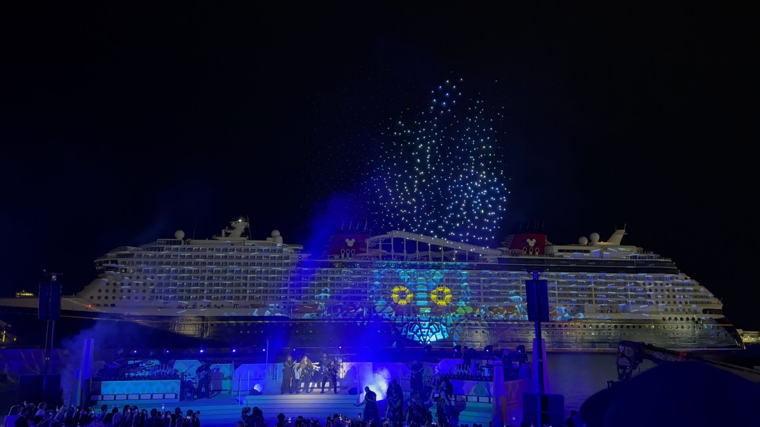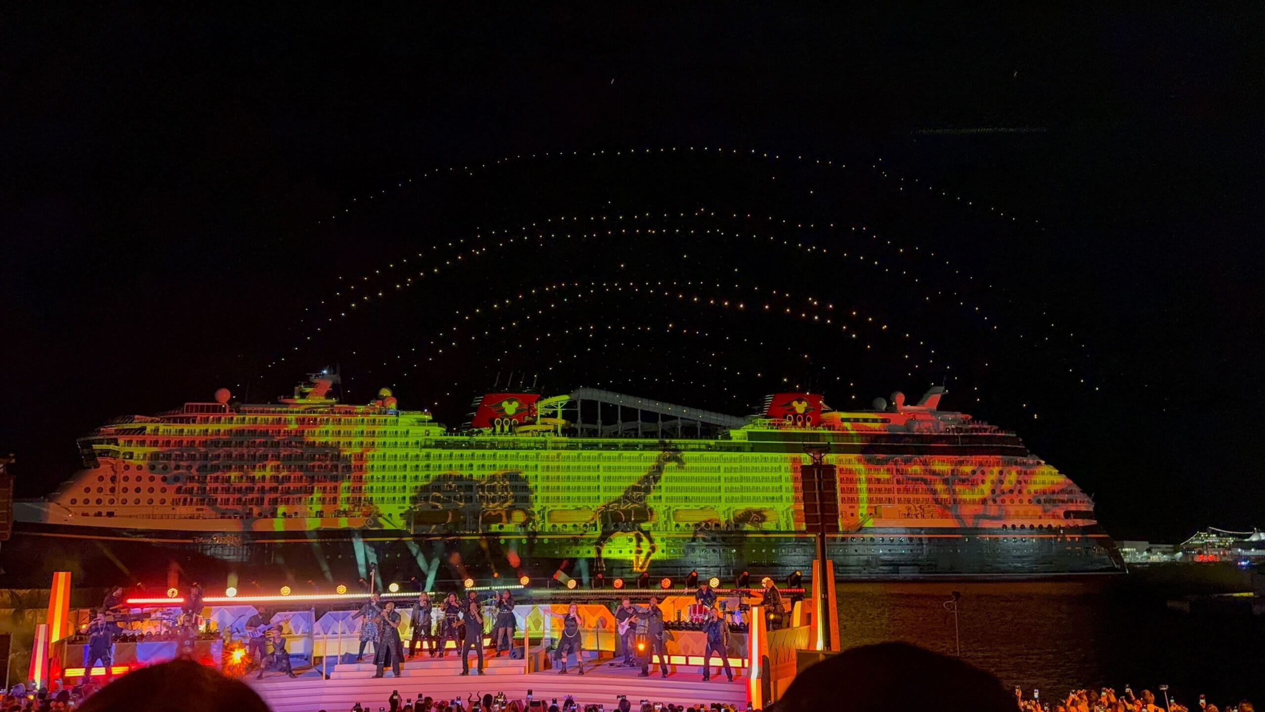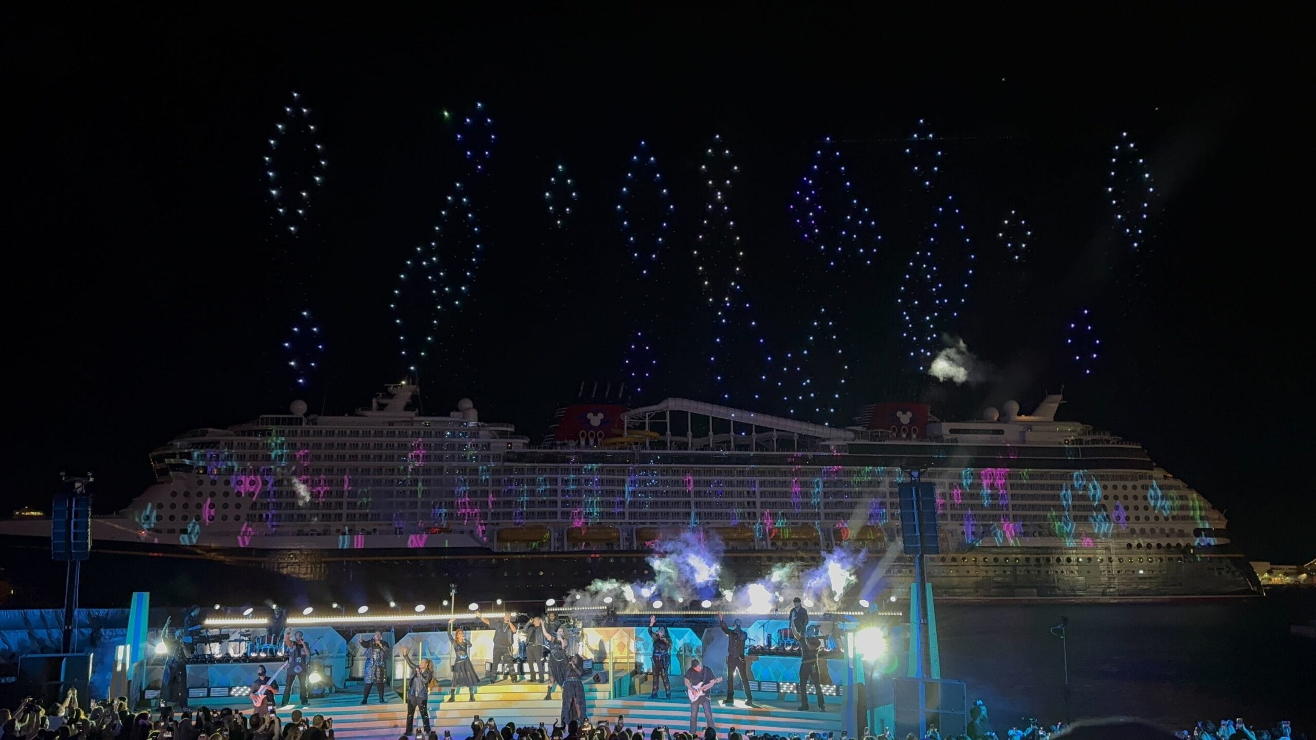 As the sky filled with icy stars, the singers performed a medley of “Into the Unknown” and “Let It Go.” Frozen is one of the Broadway-style shows being performed on the Destiny.