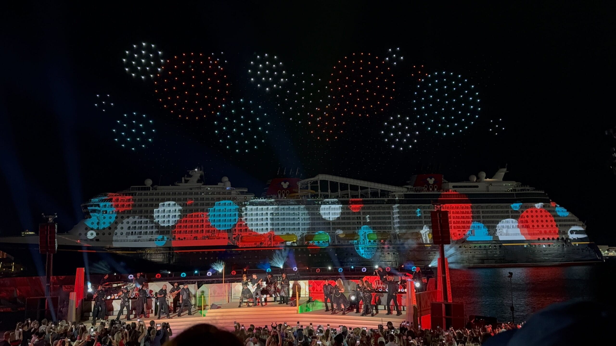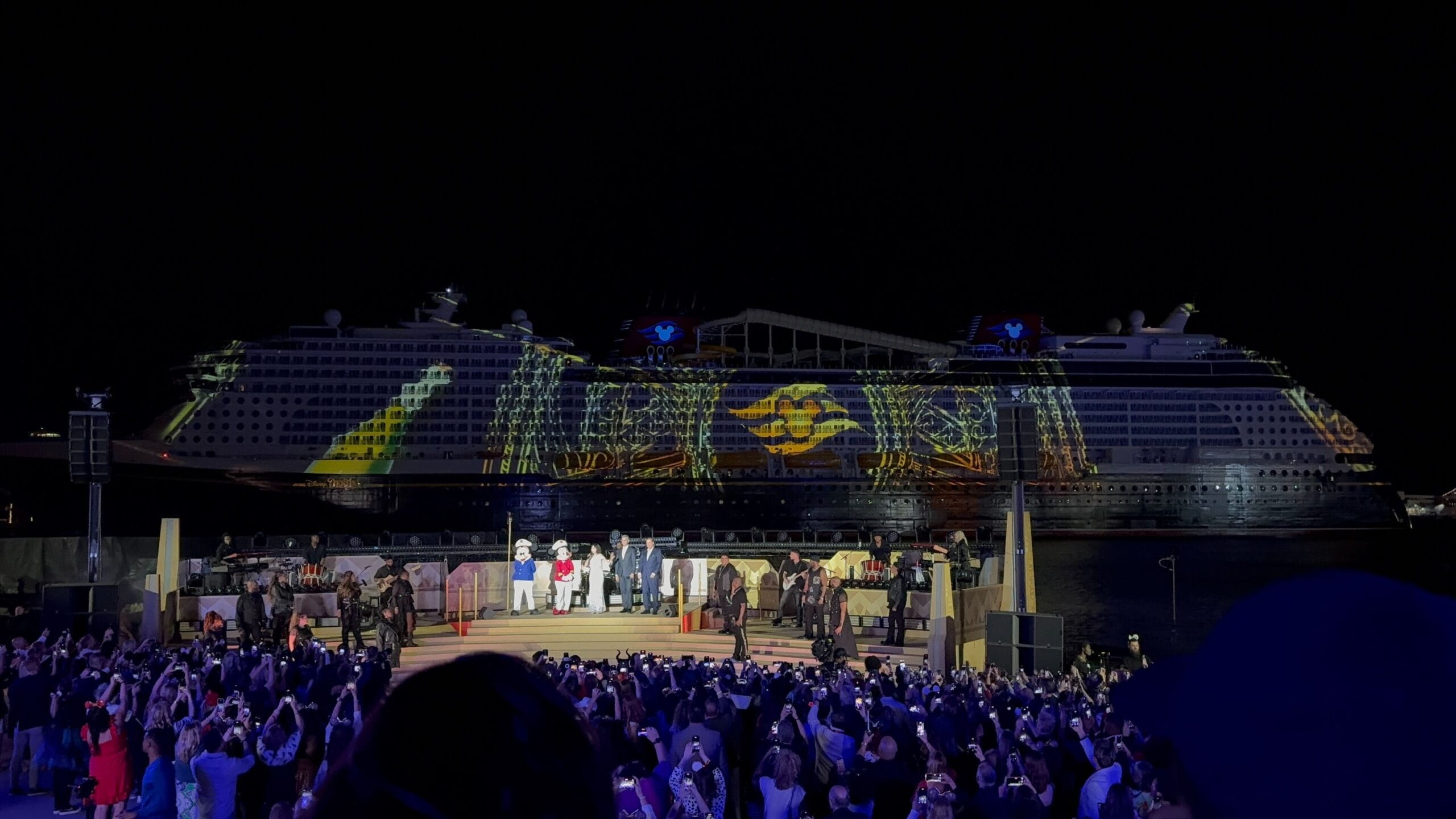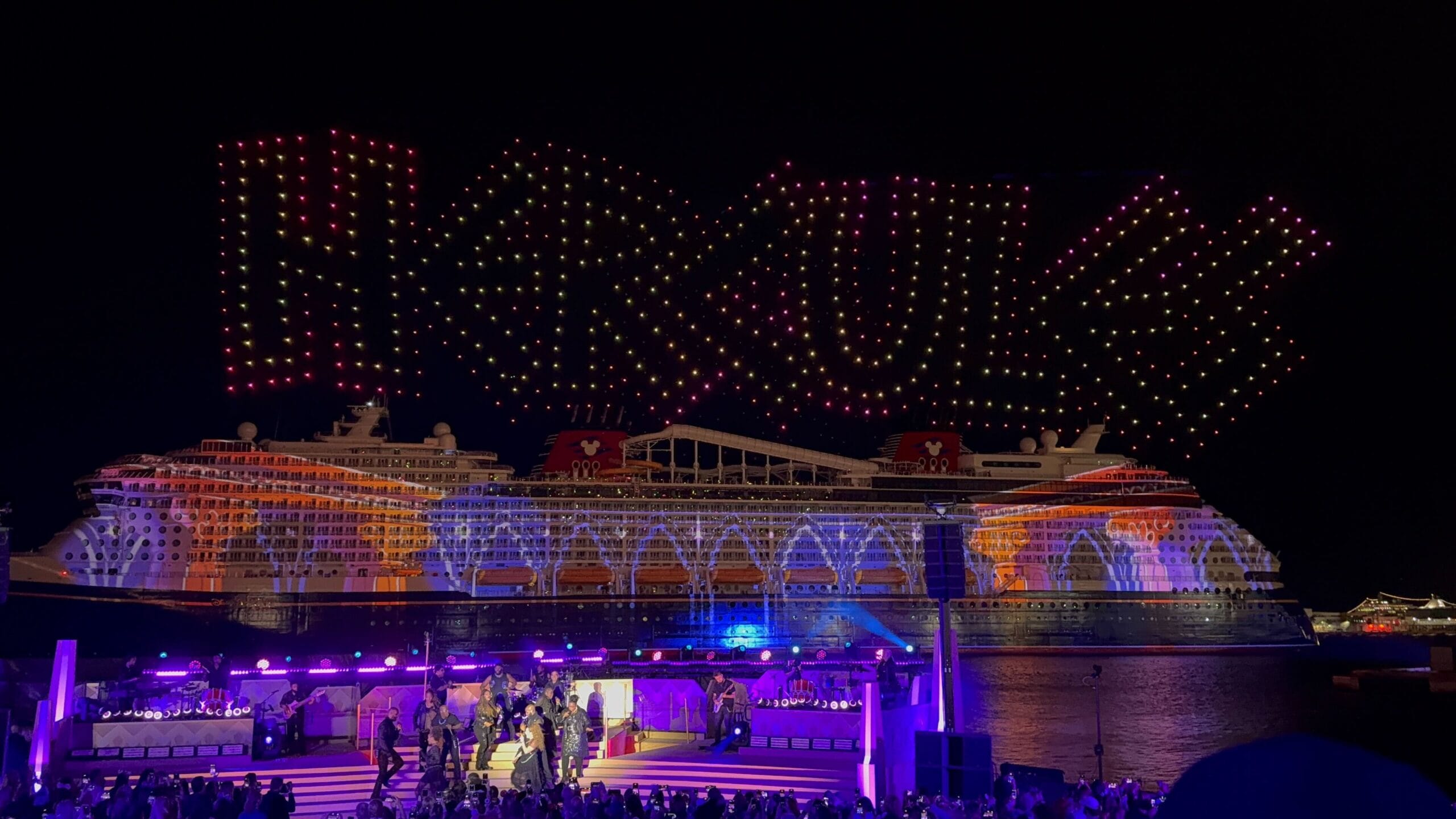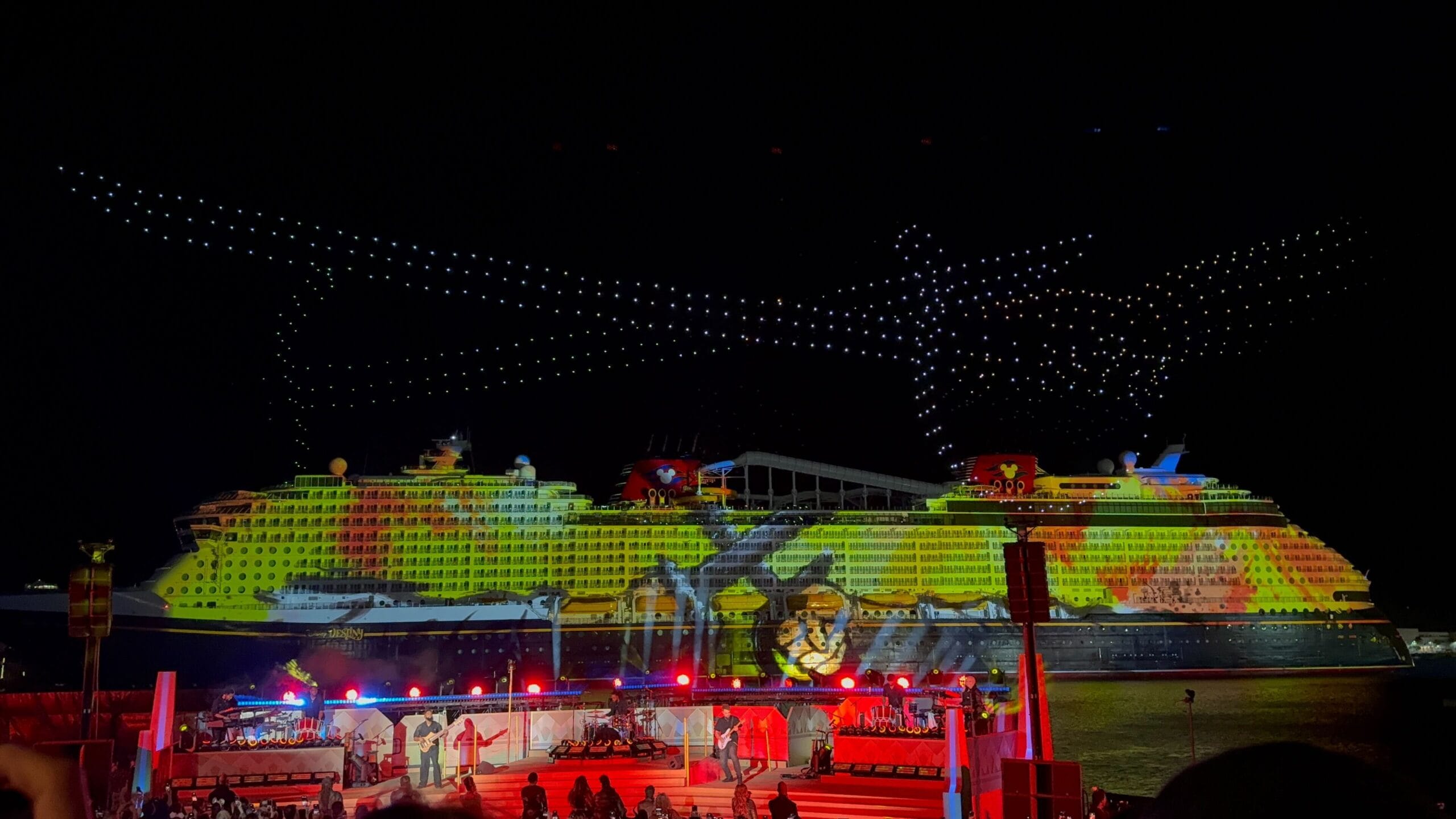 As the sky filled with icy stars, the singers performed a medley of “Into the Unknown” and “Let It Go.” Frozen is one of the Broadway-style shows being performed on the Destiny.