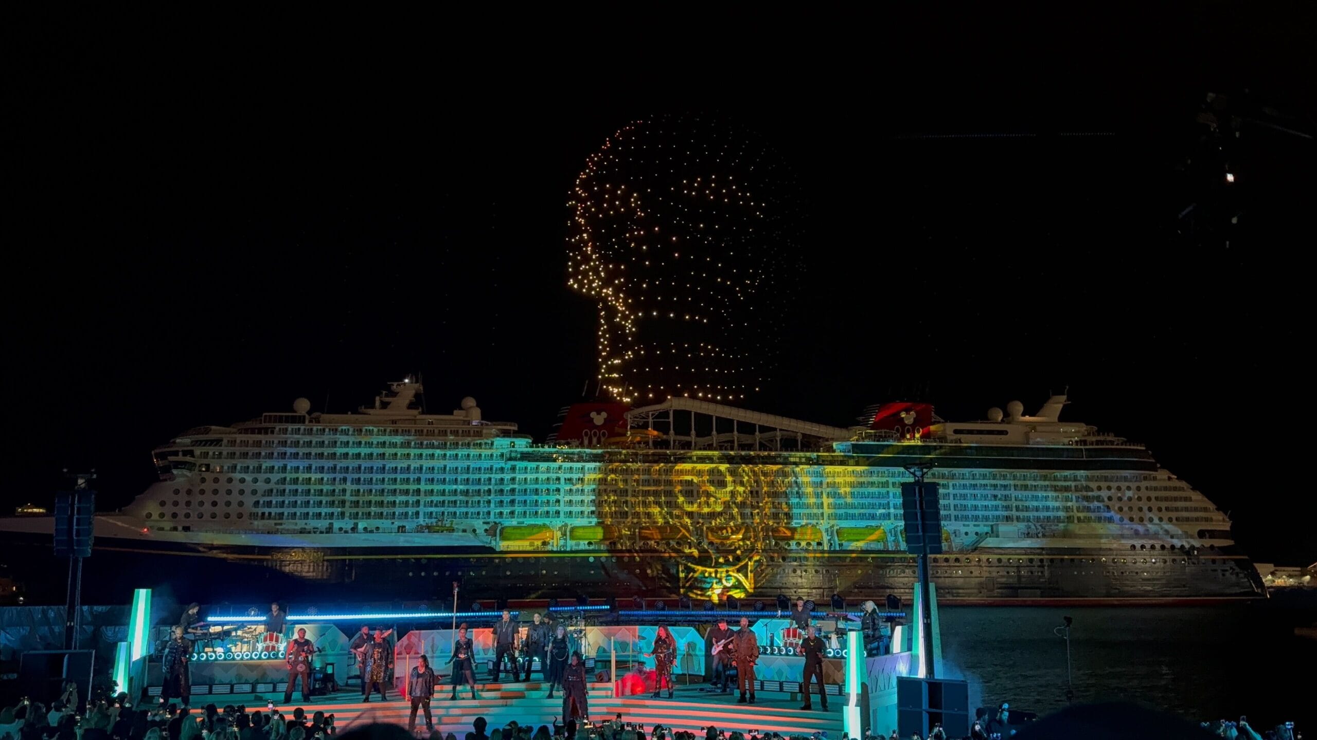 That kicked off a live show featuring drones, ship projections, singers, musicians, and performers taking us through the Heroes & Villains stories we’ll find aboard the Disney Destiny, starting with Black Panther for the Wakanda-themed Grand Hall with its T’Challa statue.