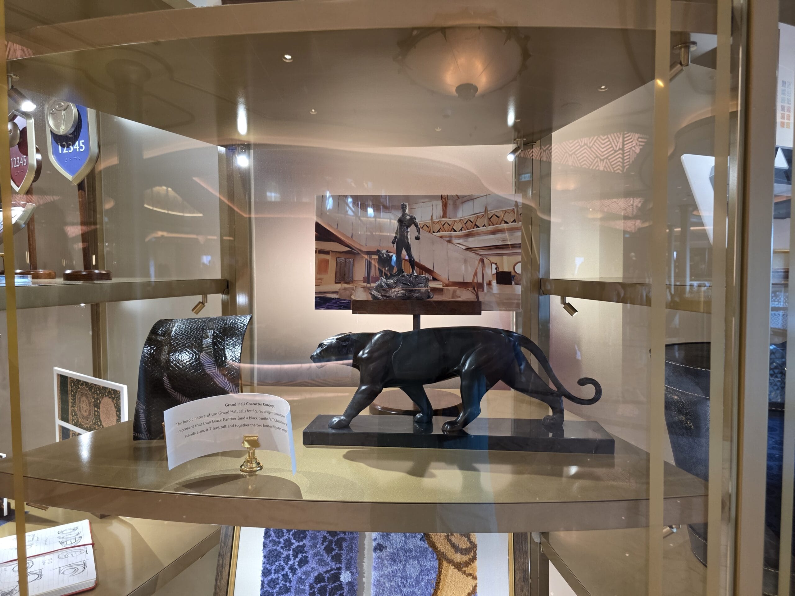 Each Disney Cruise Line ship has a character statue in the atrium. The Disney Destiny’s bronze statue depicts Black Panther.