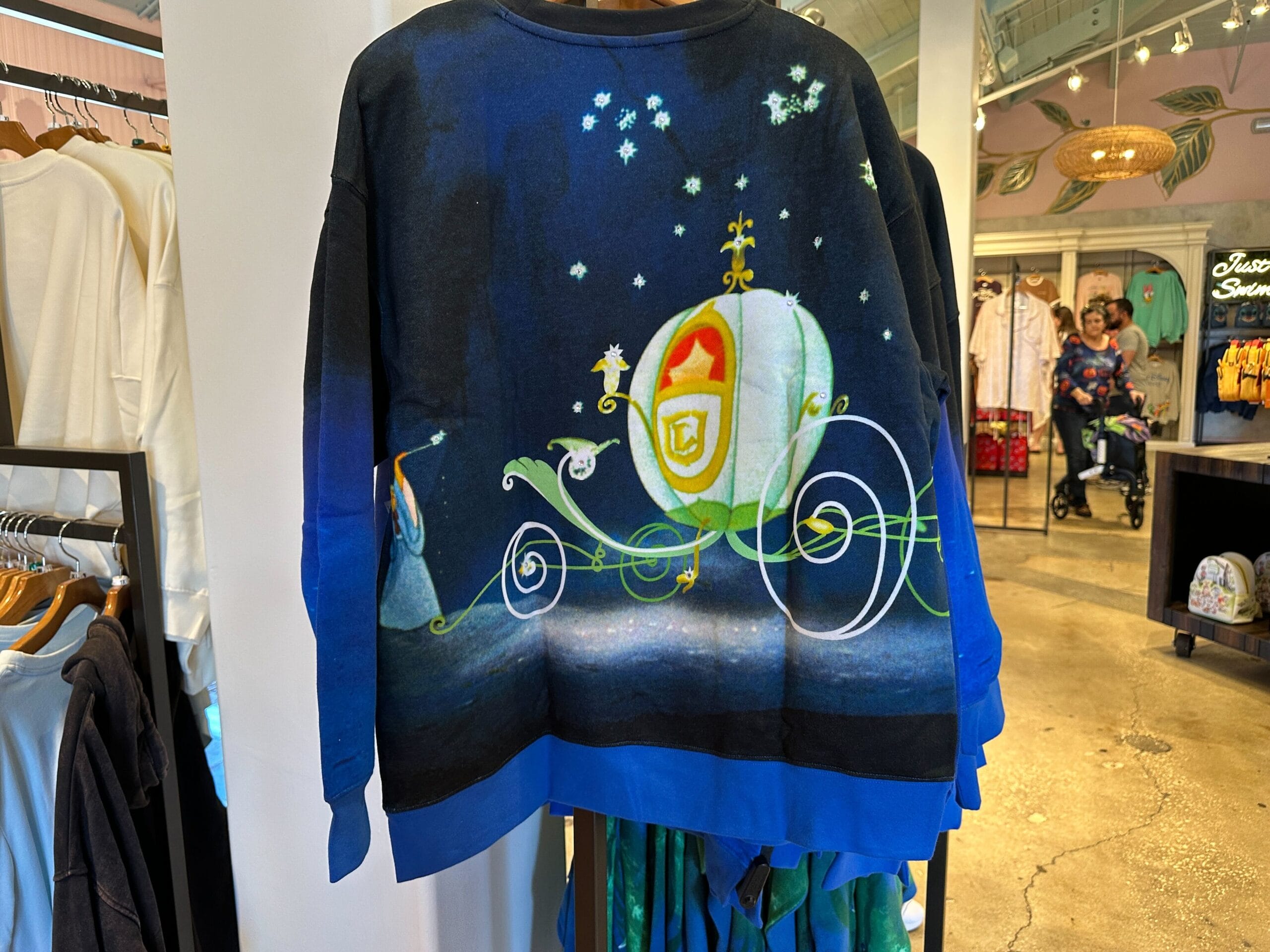 The back of the sweater features the Fairy Godmother using her magic to turn the pumpkin into a carriage.