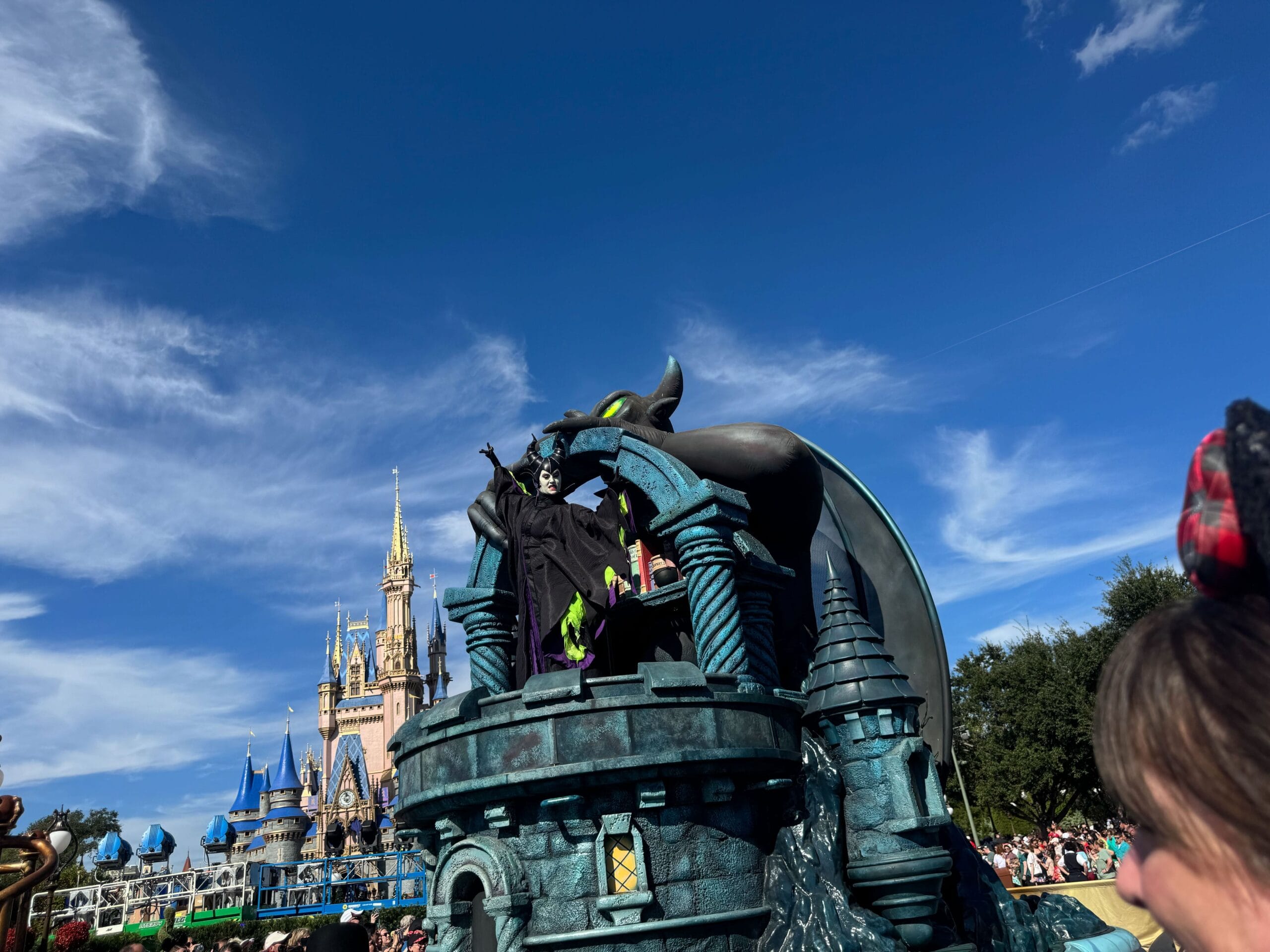 Following the characters on the ground was a float with Maleficent. She stands upon a tower with Chernobog behind her.