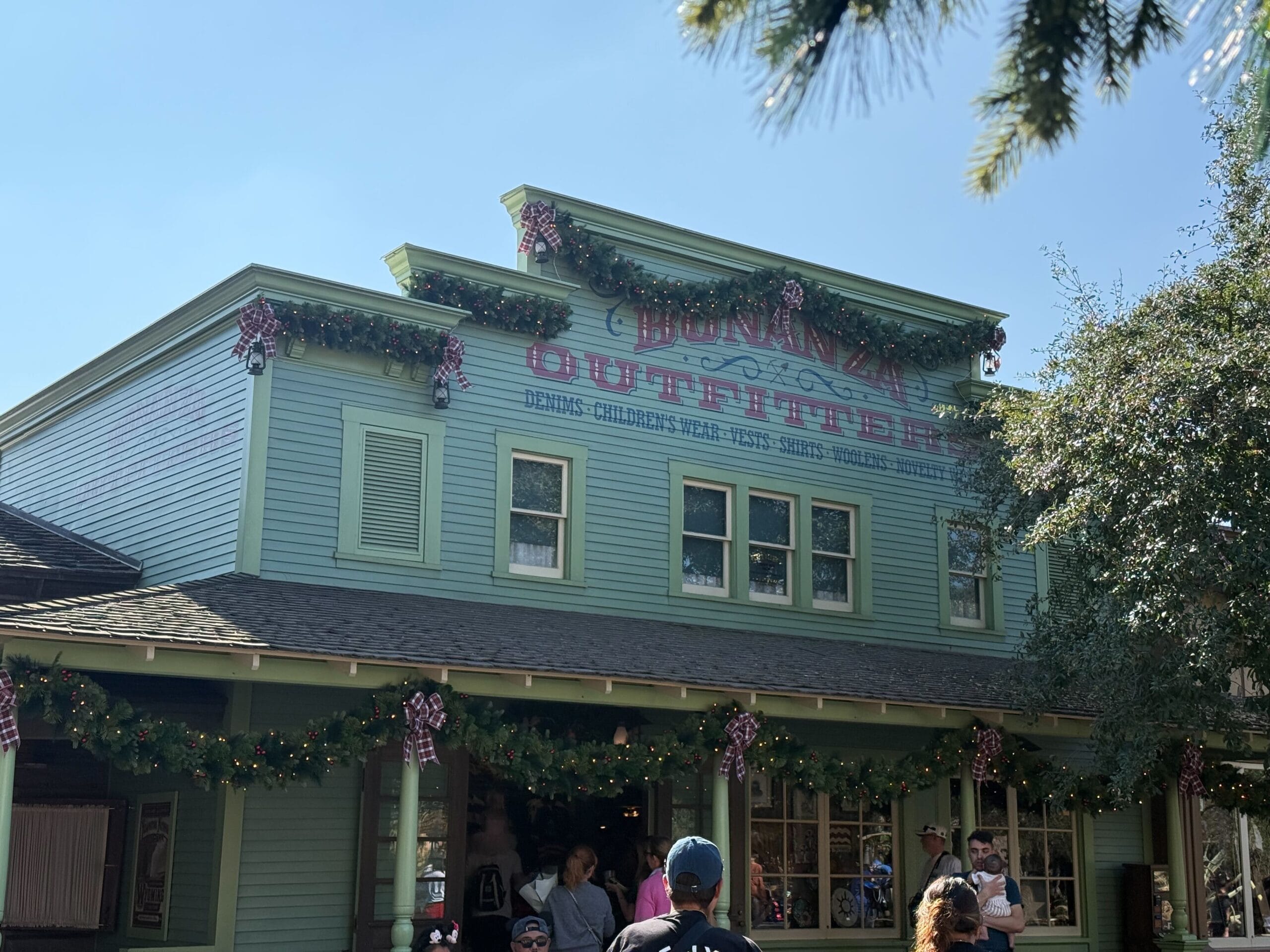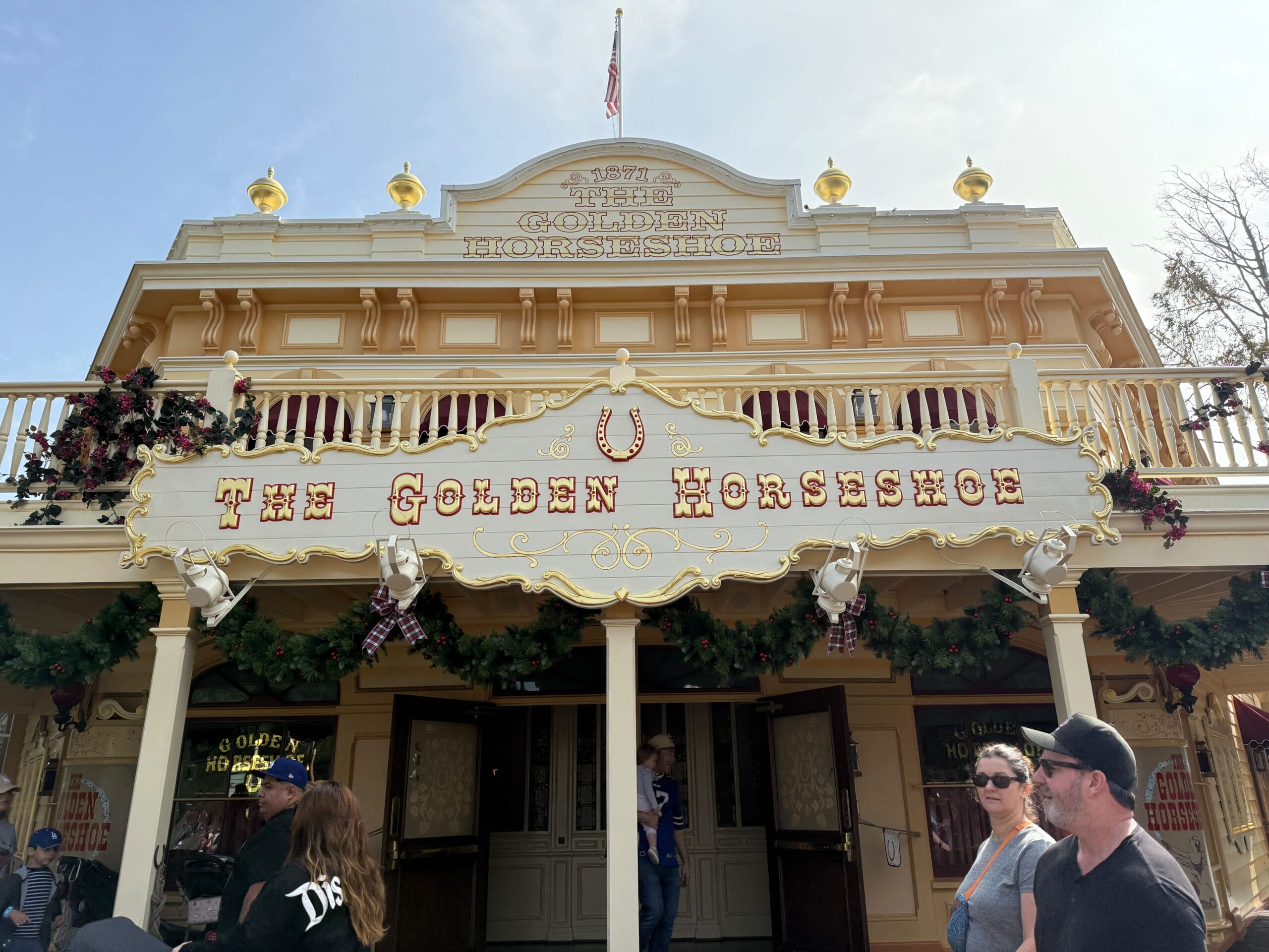 There is garland across the front of The Golden Horseshoe. Additional festive branches are also on the façade, running through the balcony railings around the sign.