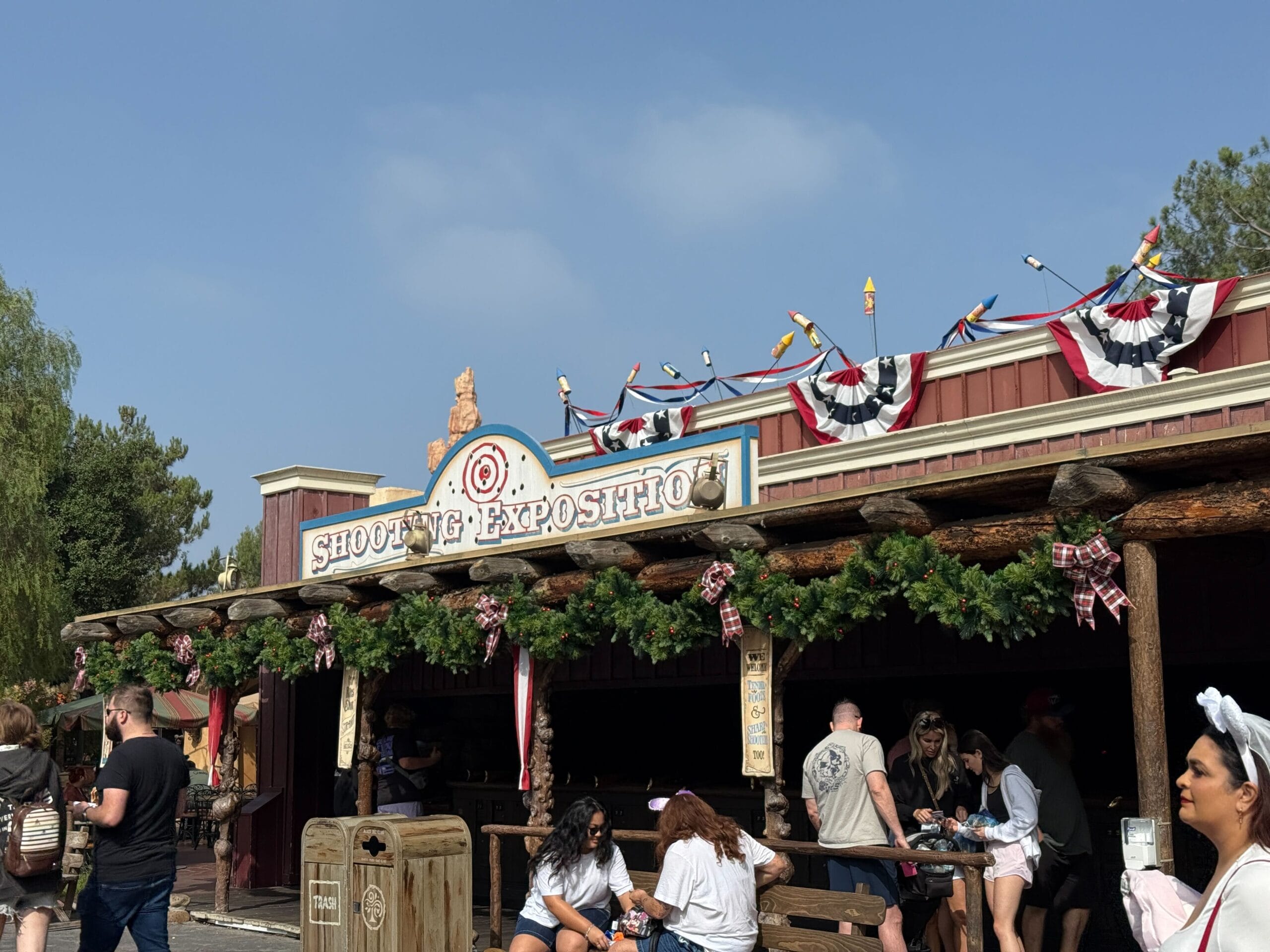 Garland runs along the overhang of the Frontierland Shooting Exposition. Red plaid bows are placed every few feet, where the garland is attached to the overhang.