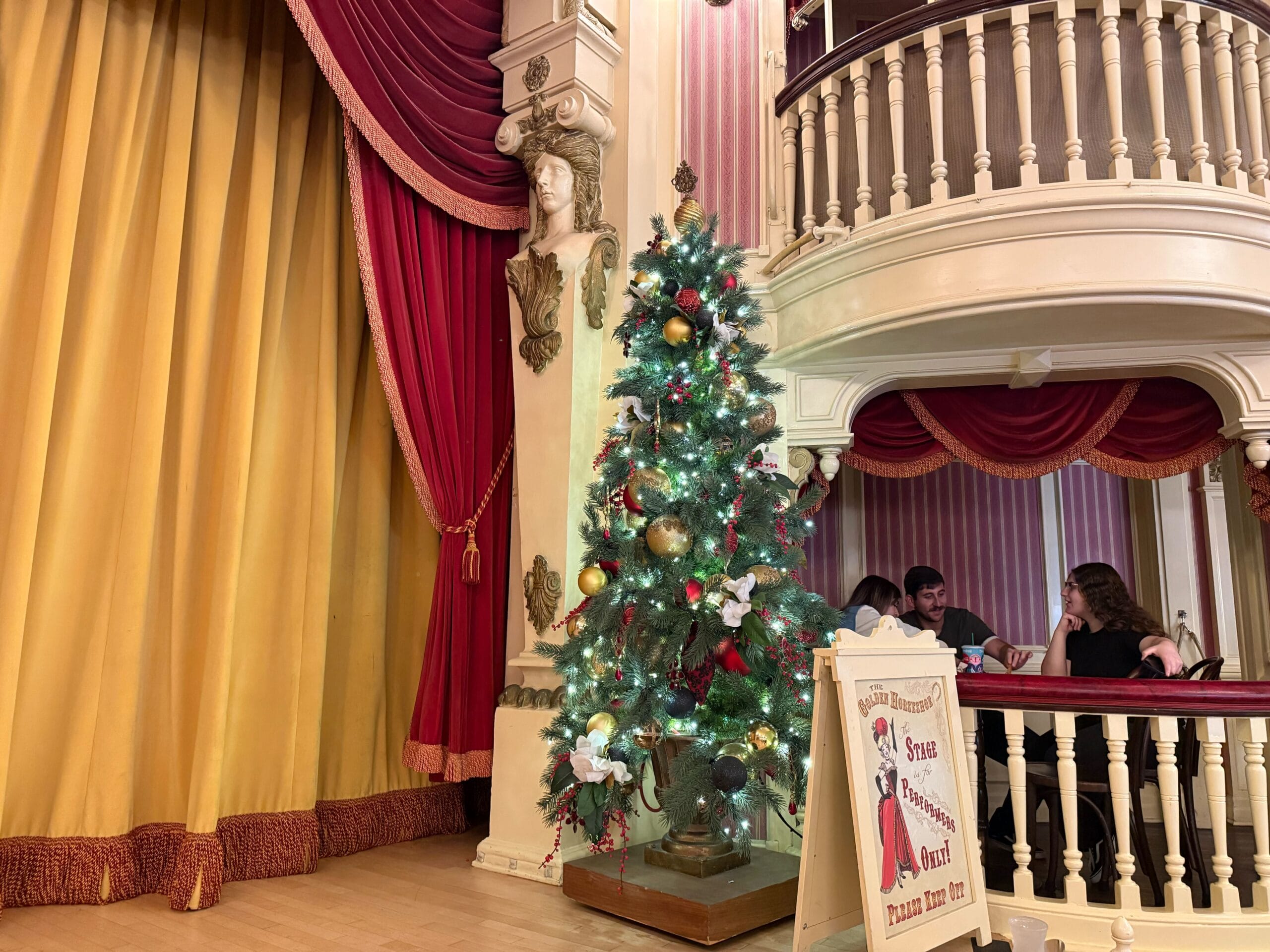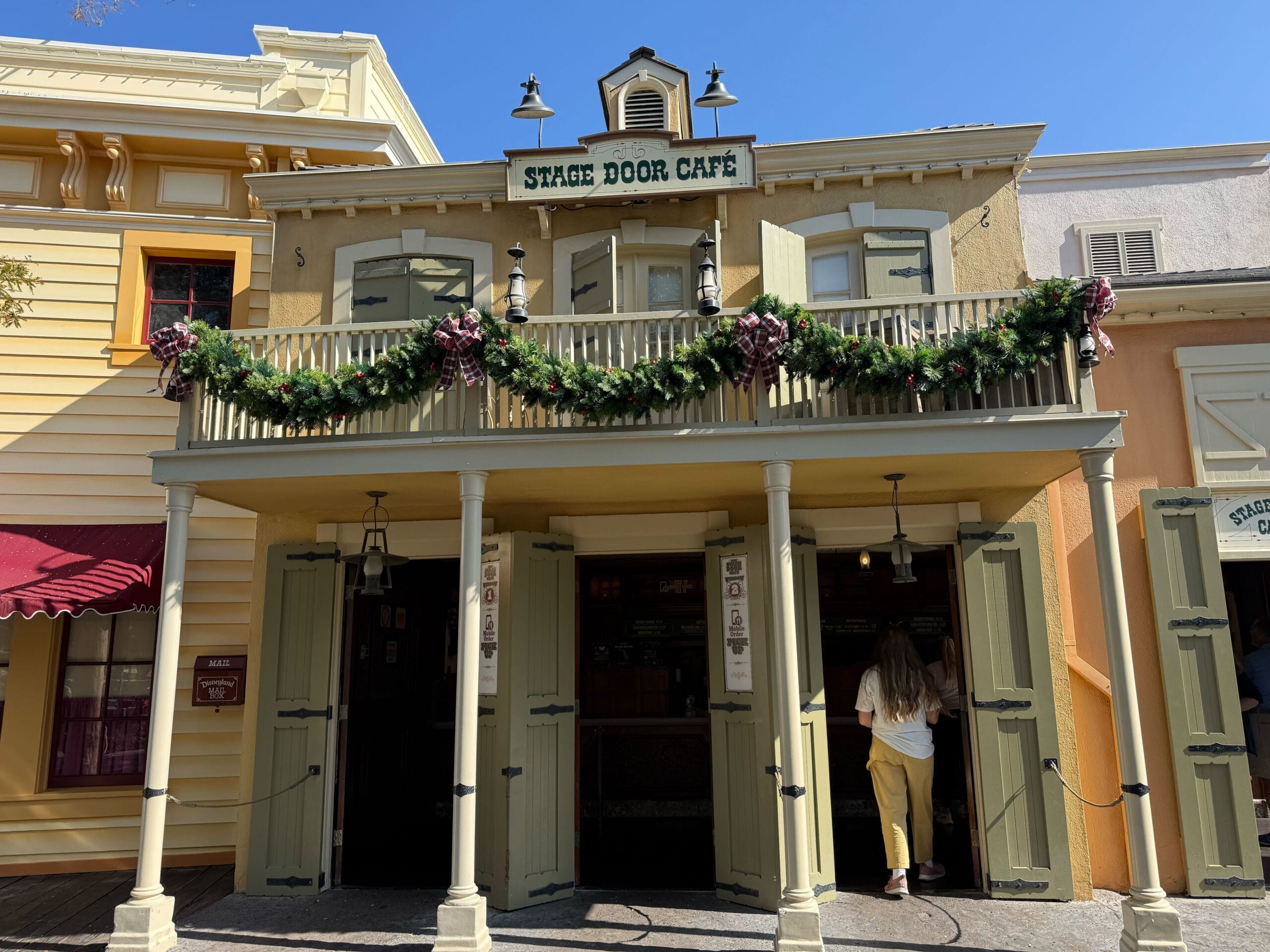 Lastly, garland is placed across the second floor balcony of Stage Door Café.