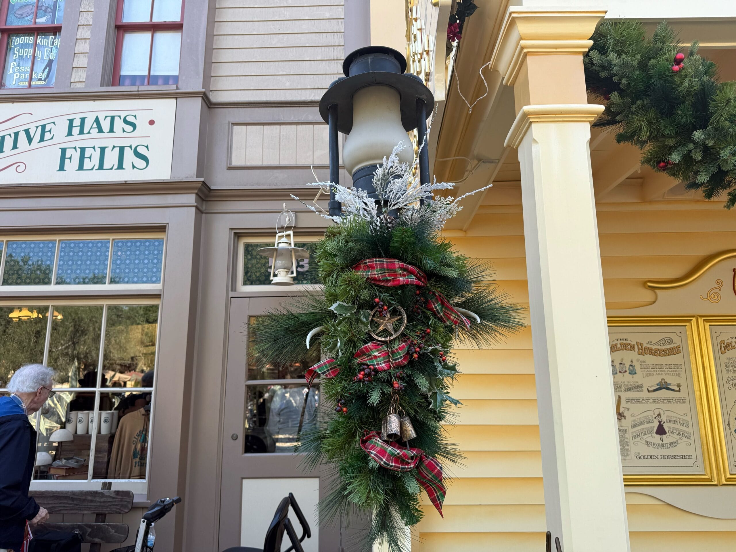 Lampposts throughout Frontierland have garland decorations strung with red plaid ribbons. They also feature red berries, white antlers, golden bells, and more adornements.