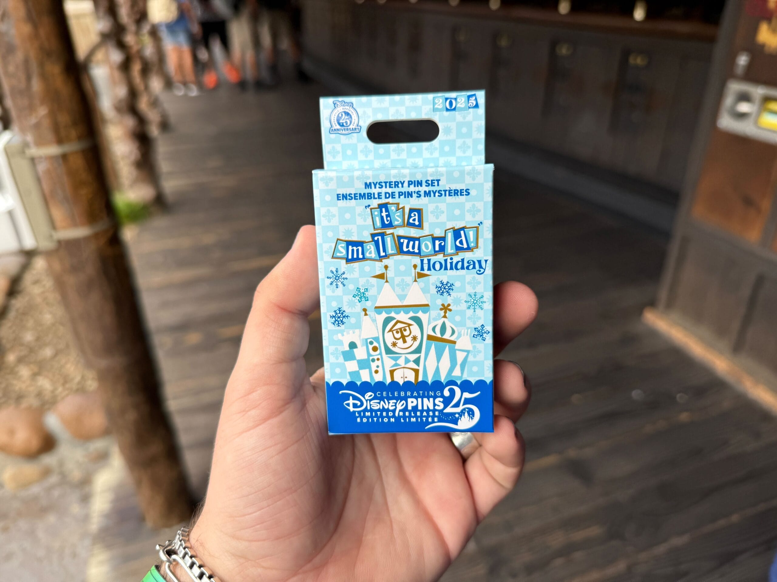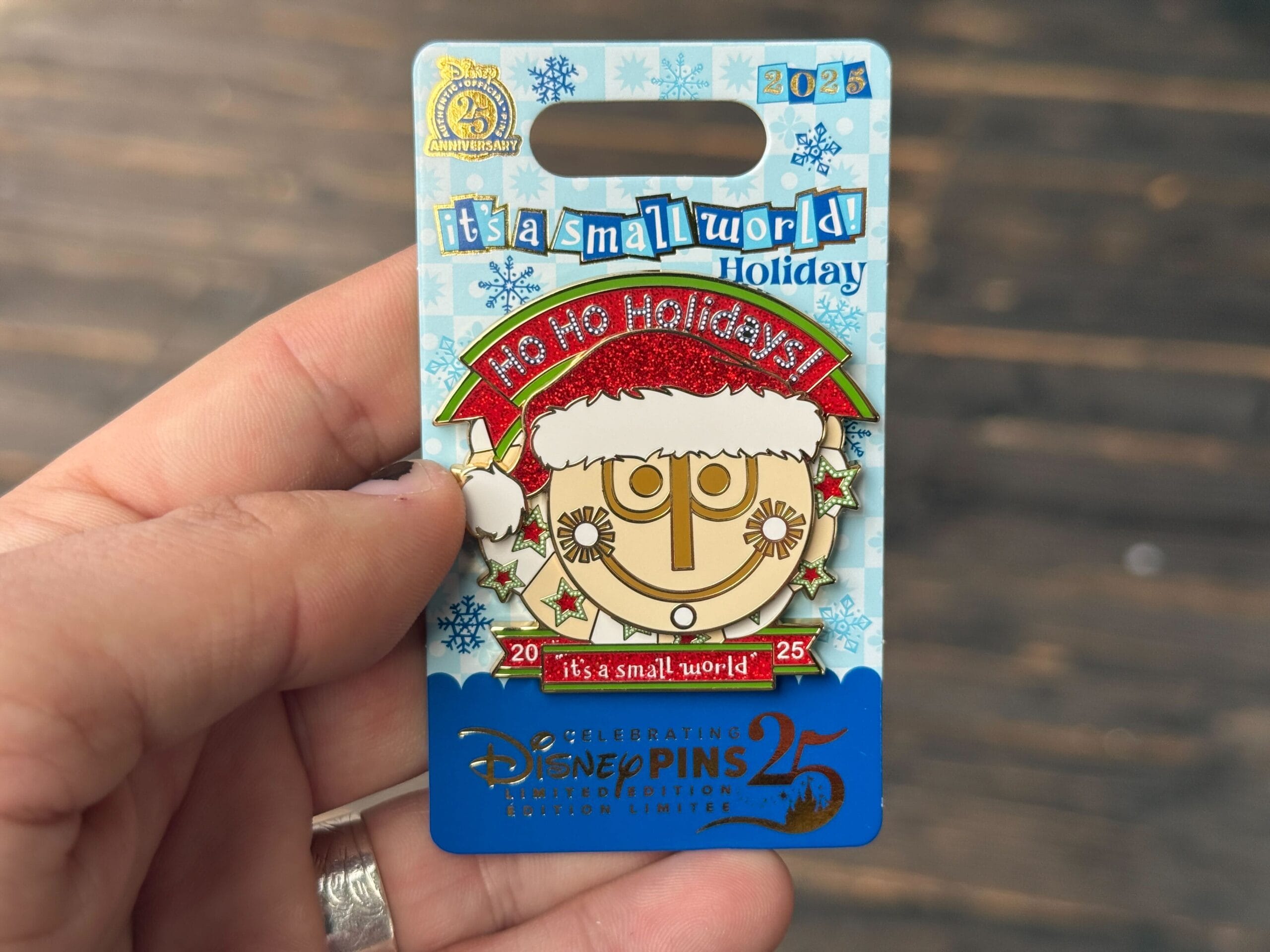 The attraction’s famous clock face is pictured in a sparkly Santa hat with red and green stars around it. “Ho Ho Holidays!” is across the top and “it’s a small world 2025” is at the bottom.