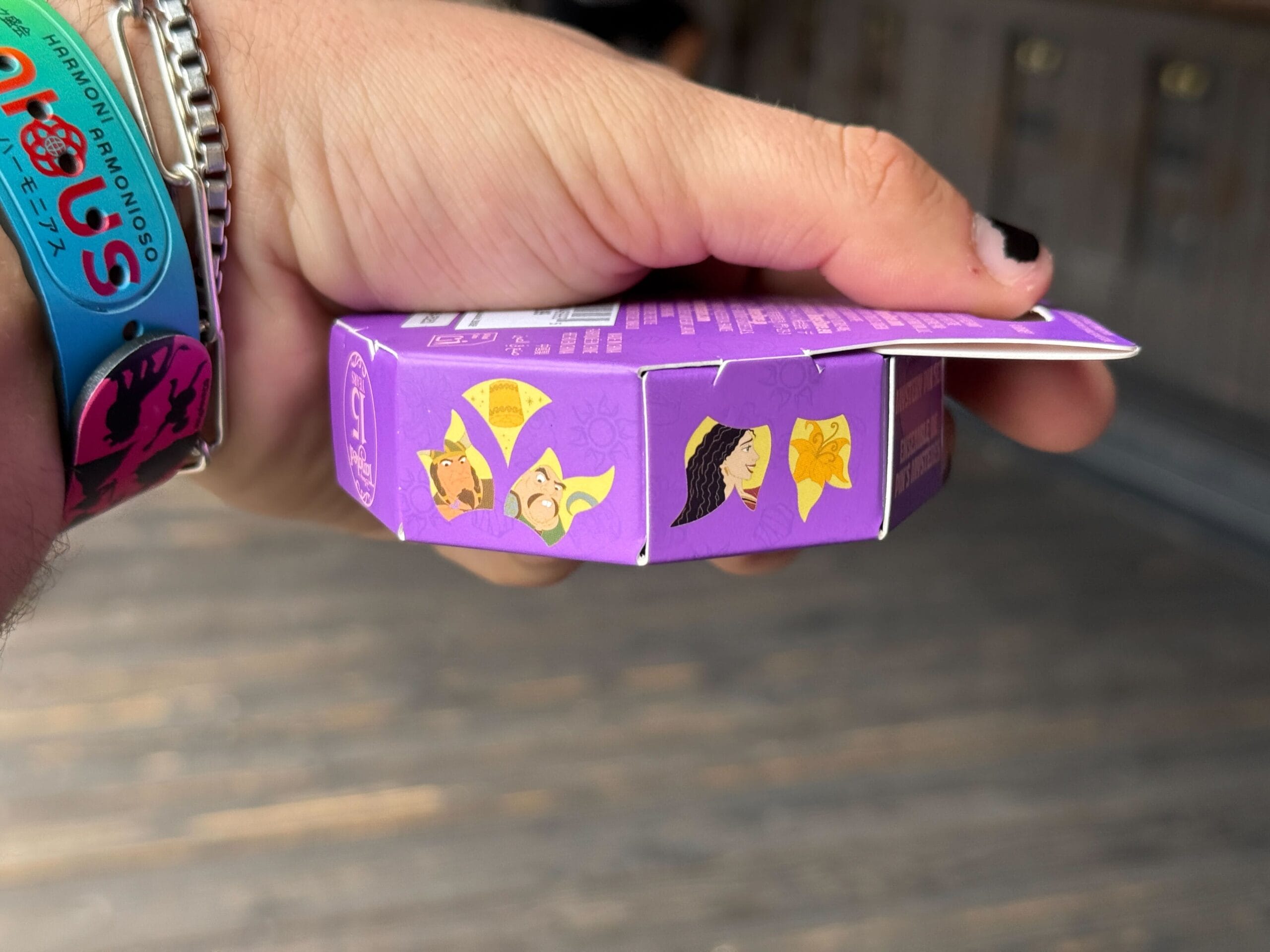 The mystery set includes 10 pins that create the Corona sum symbol. They feature Rapunzel, Flynn, Mother Gothel, Pascal, Maximus, thugs, a lantern, the Sundrop Flower, and Rapunzel’s crown. Each box contains 2 randomly selected pins.