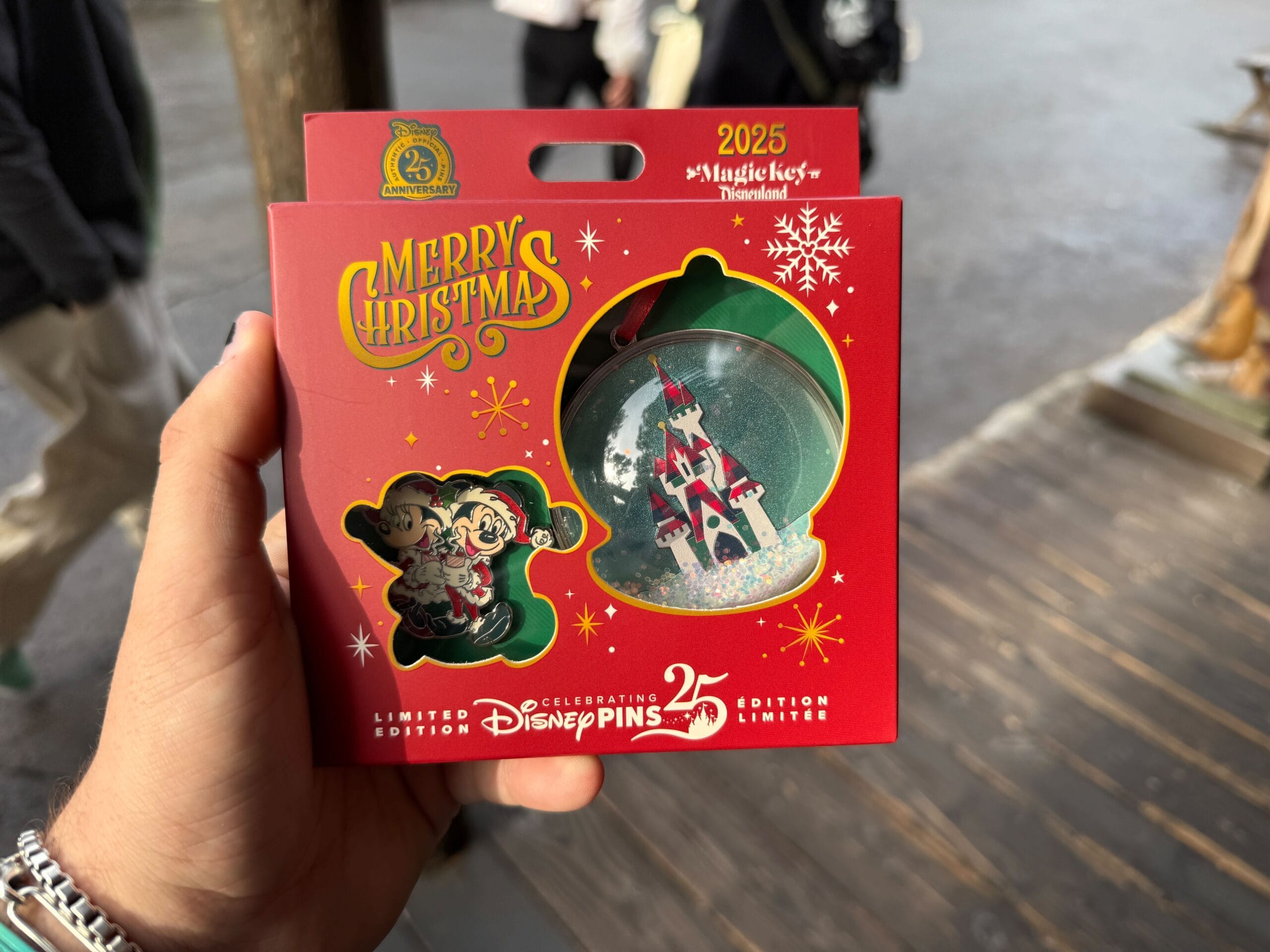 Magic Key holders can enjoy this exclusive set including a snow globe ornament and a pin. The ornament depicts a red and green version of Sleeping Beauty Castle. Mickey and Minnie are in their Santa outfits on the pin. It’s limited edition of 1,500.