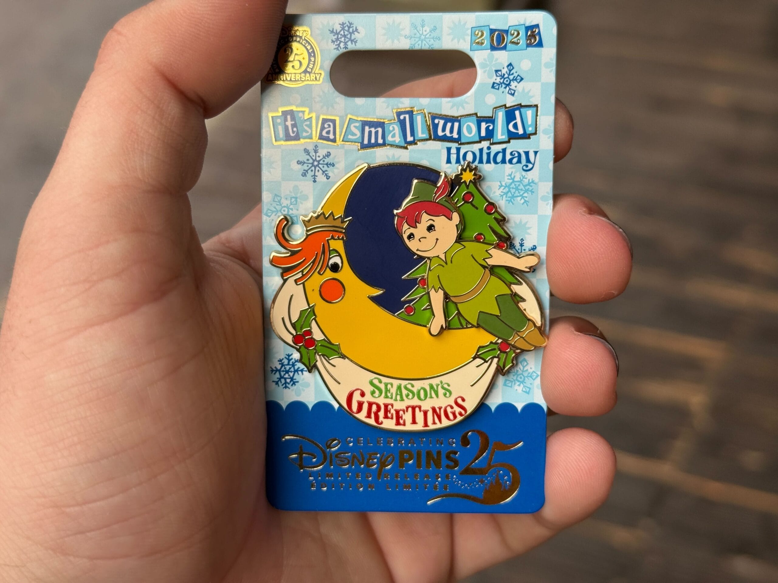 Peter is also showcased on this pin, flying in front of a Christmas tree and crescent moon. “Season’s Greetings” is on a banner design along the bottom.
