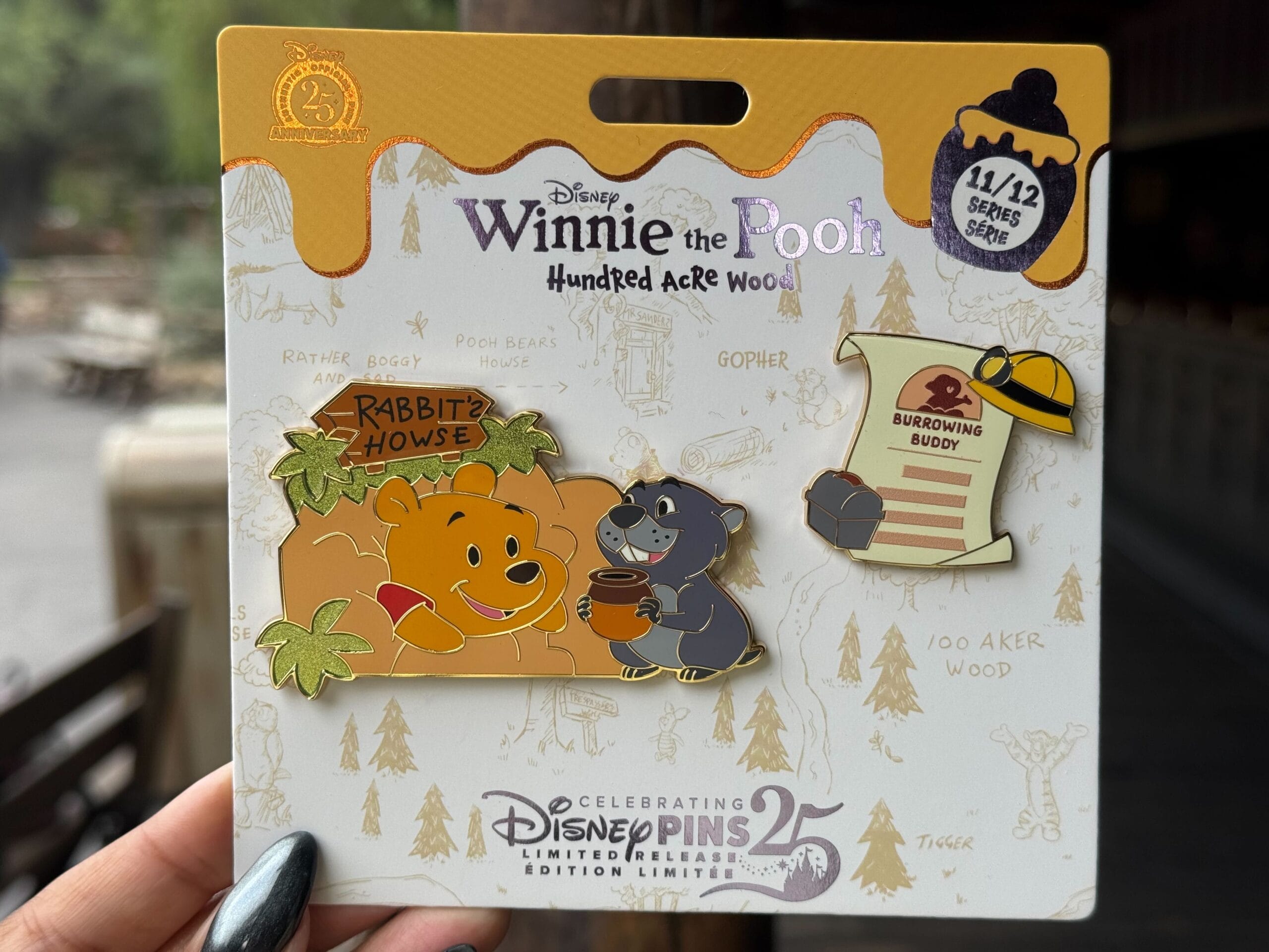 This is set 11/12 in the Winnie the Pooh Hundred Acre Wood series. One pin depicts Pooh bear stuck in the doorway of Rabbit’s house alongside Gopher with honey pot. The second pin is a storybook page titled “Burrowing Buddy.”