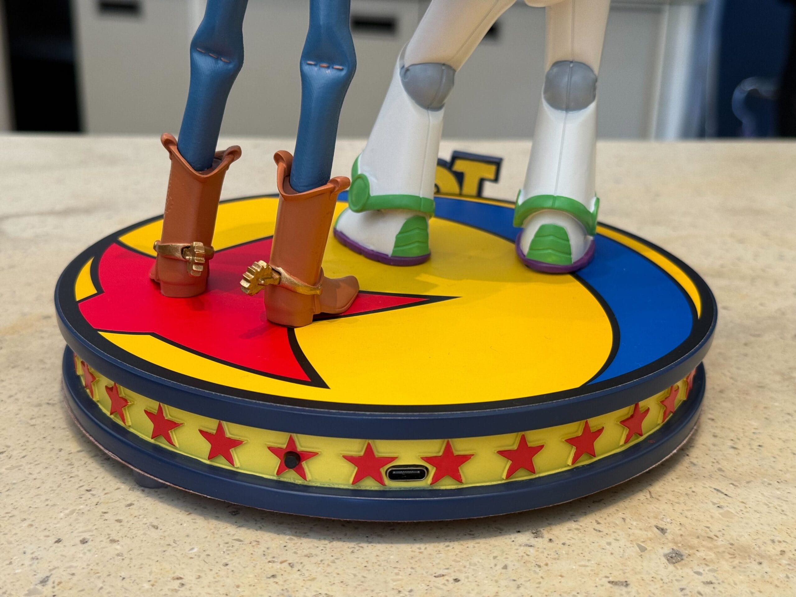 There is a USB charging port on the back of the base. It plays “You’ve Got a Friend in Me” music.