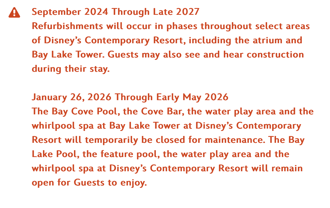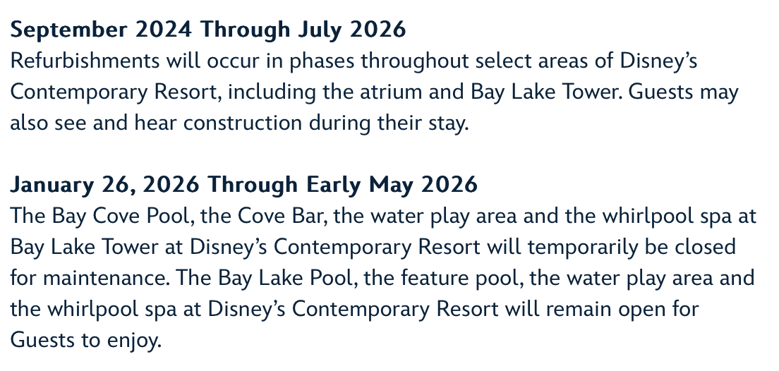 The Bay Cove Pool, the Cove Bar, the water play area and the whirlpool spa at Bay Lake Tower at Disney’s Contemporary Resort will temporarily be closed for maintenance. The Bay Lake Pool, the feature pool, the water play area and the whirlpool spa at Disney’s Contemporary Resort will remain open for Guests to enjoy.