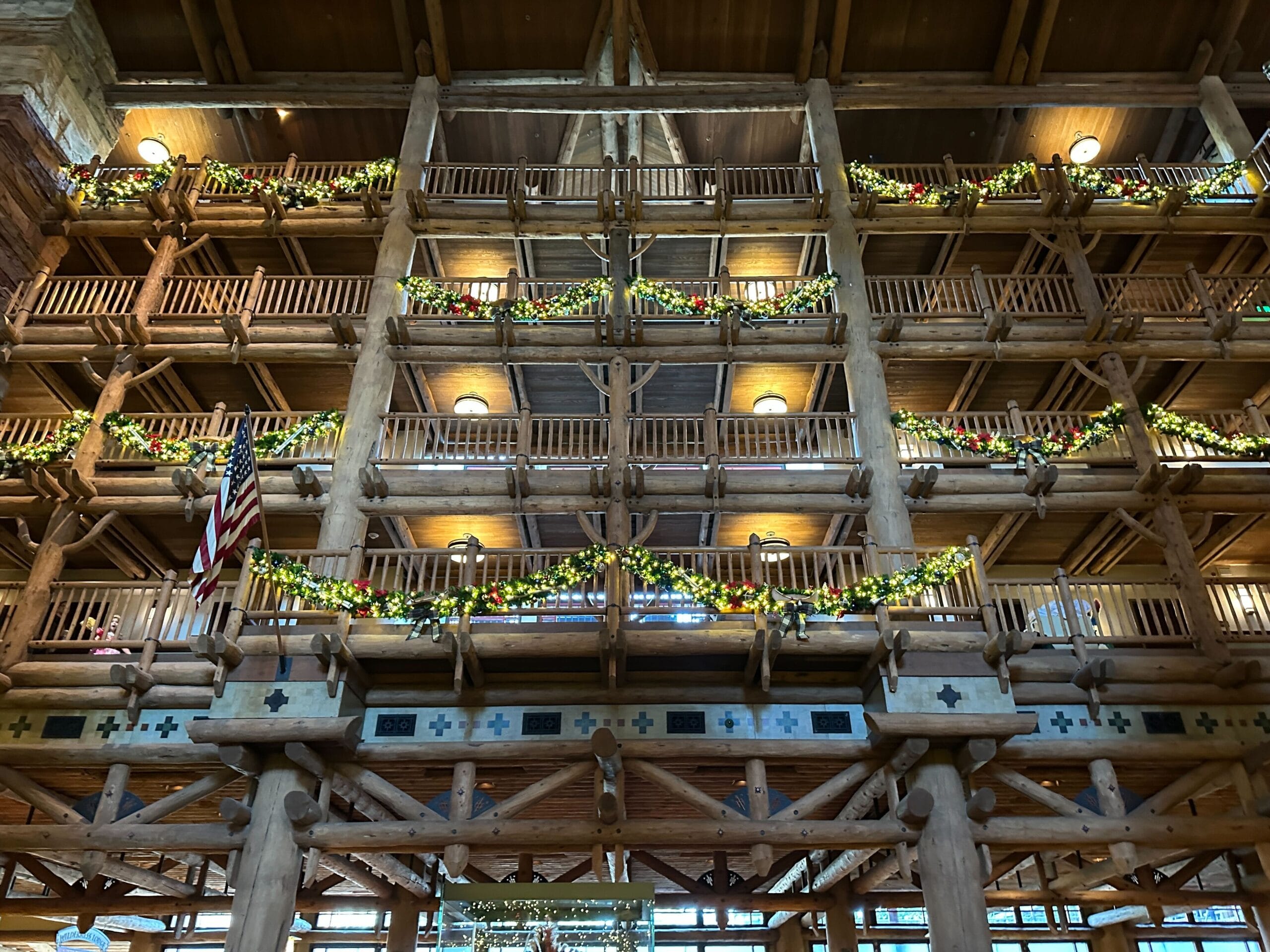 Light-up garland hangs from the balconies overlooking the lobby. These have buffalo check bows, red flowers, and other adornments.