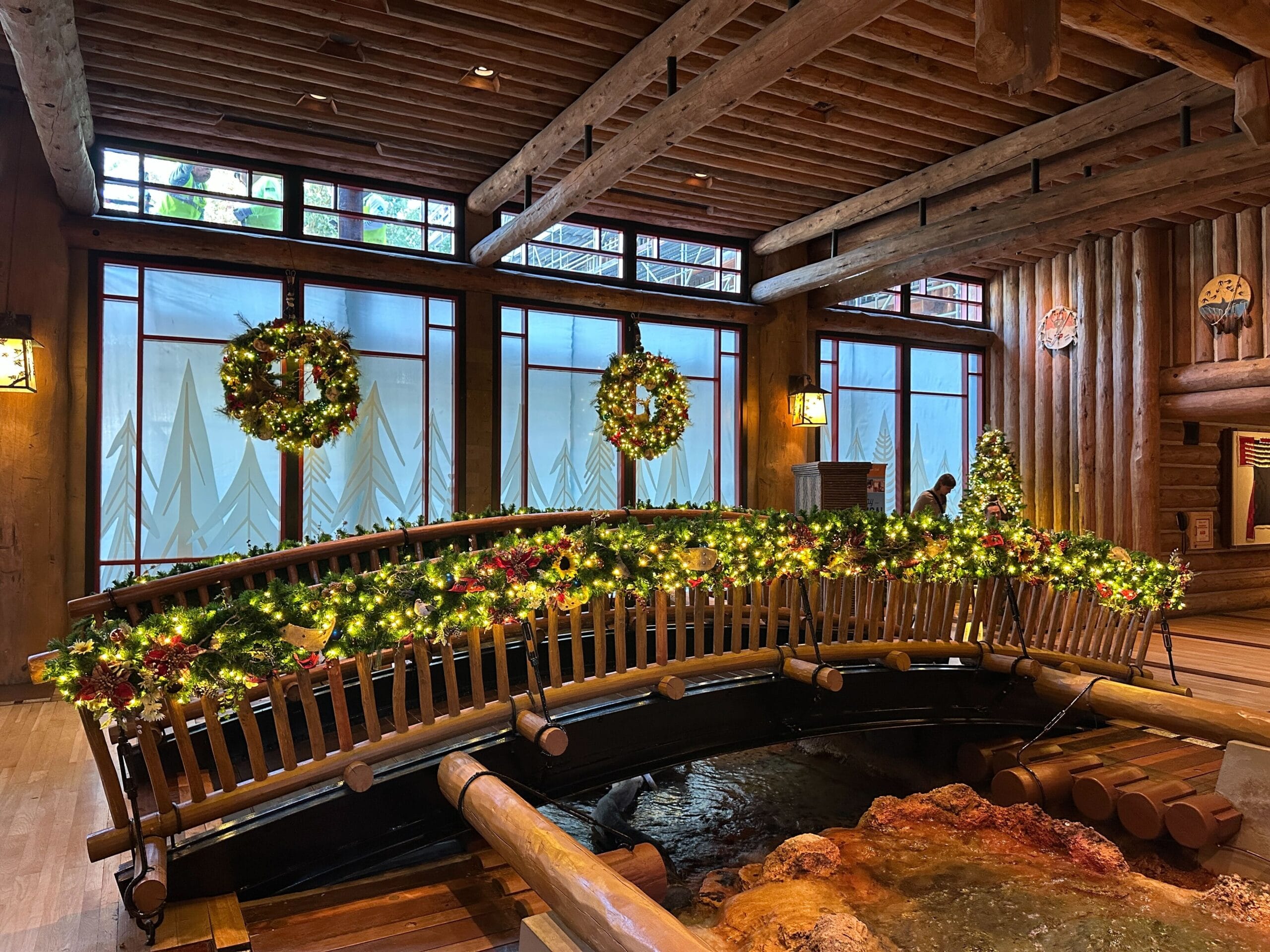 On the windows at the back of the lobby of wreaths featuring animal figurines. The bridge over a small indoor creek has matching garland on its railings.