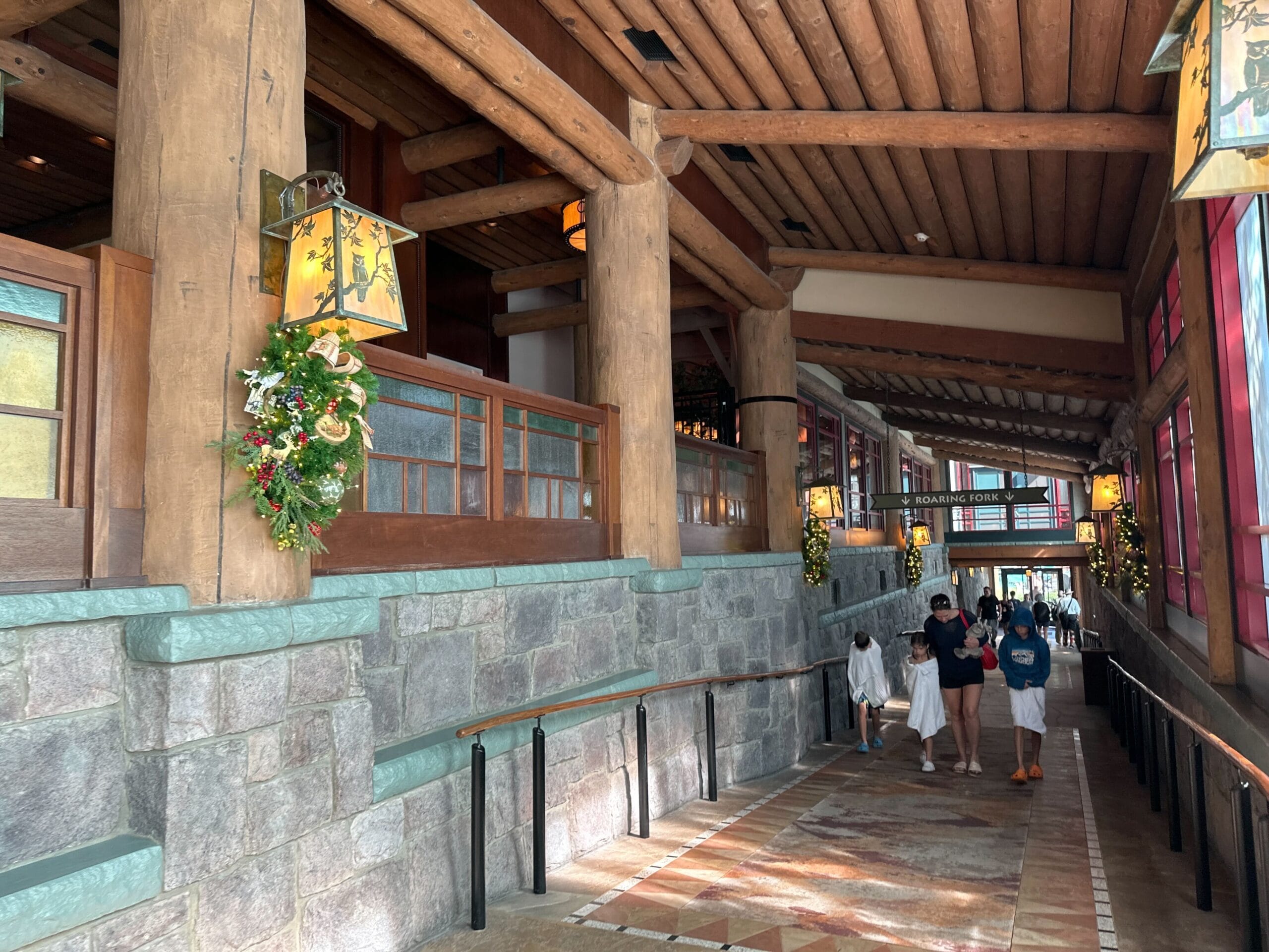 In the hallway leading to Roaring Fork, decorations hang below each wall lamp.