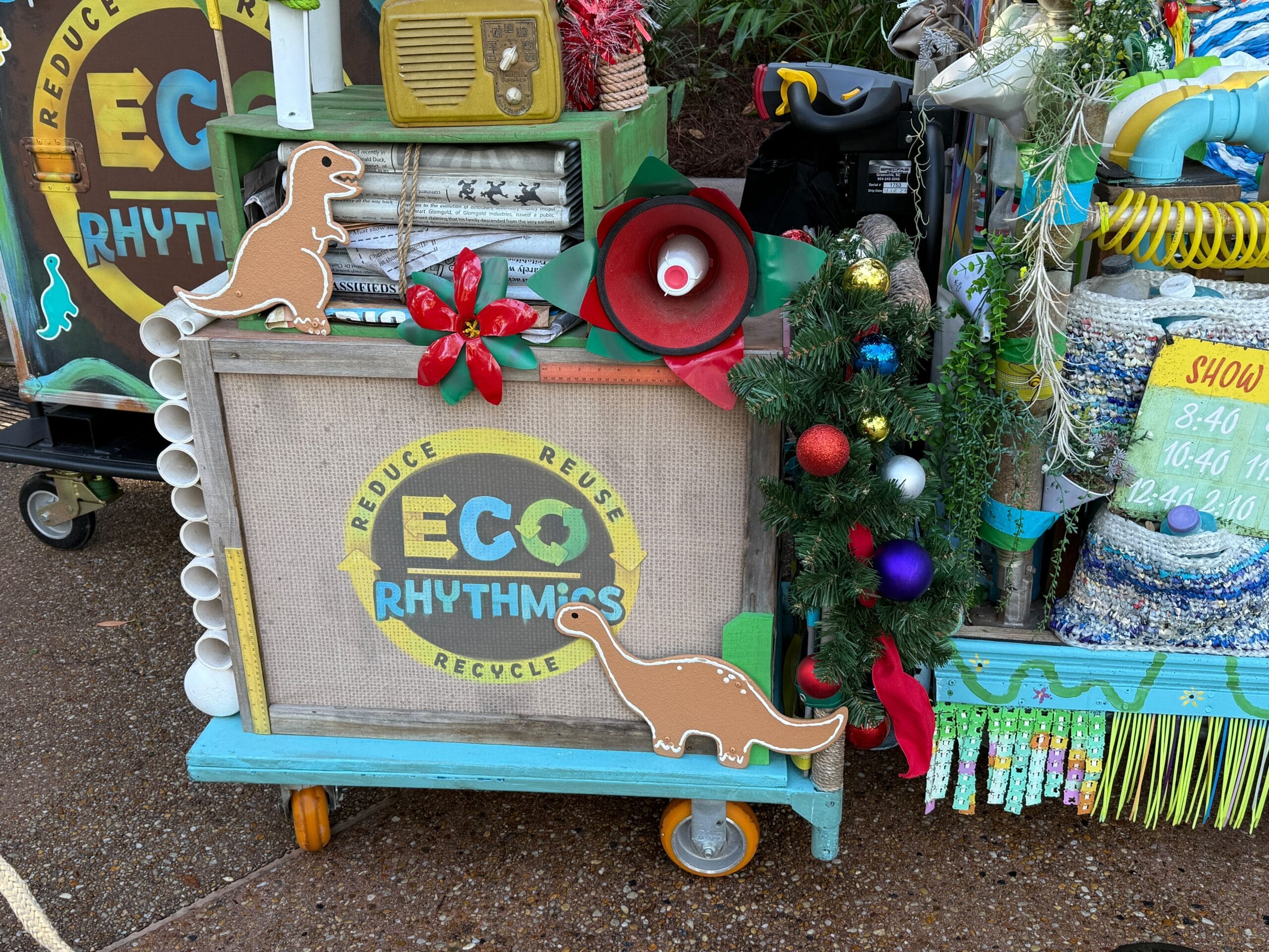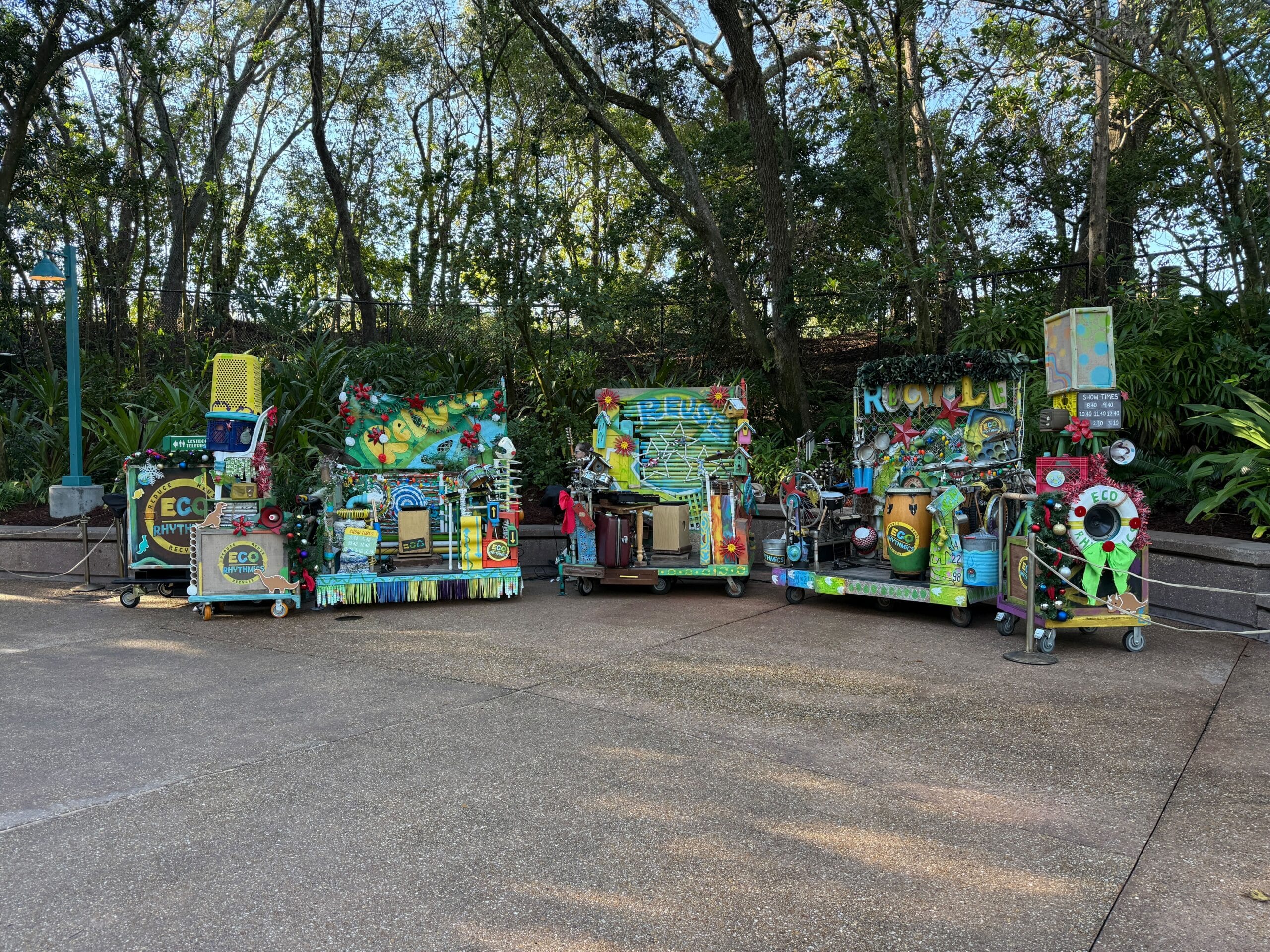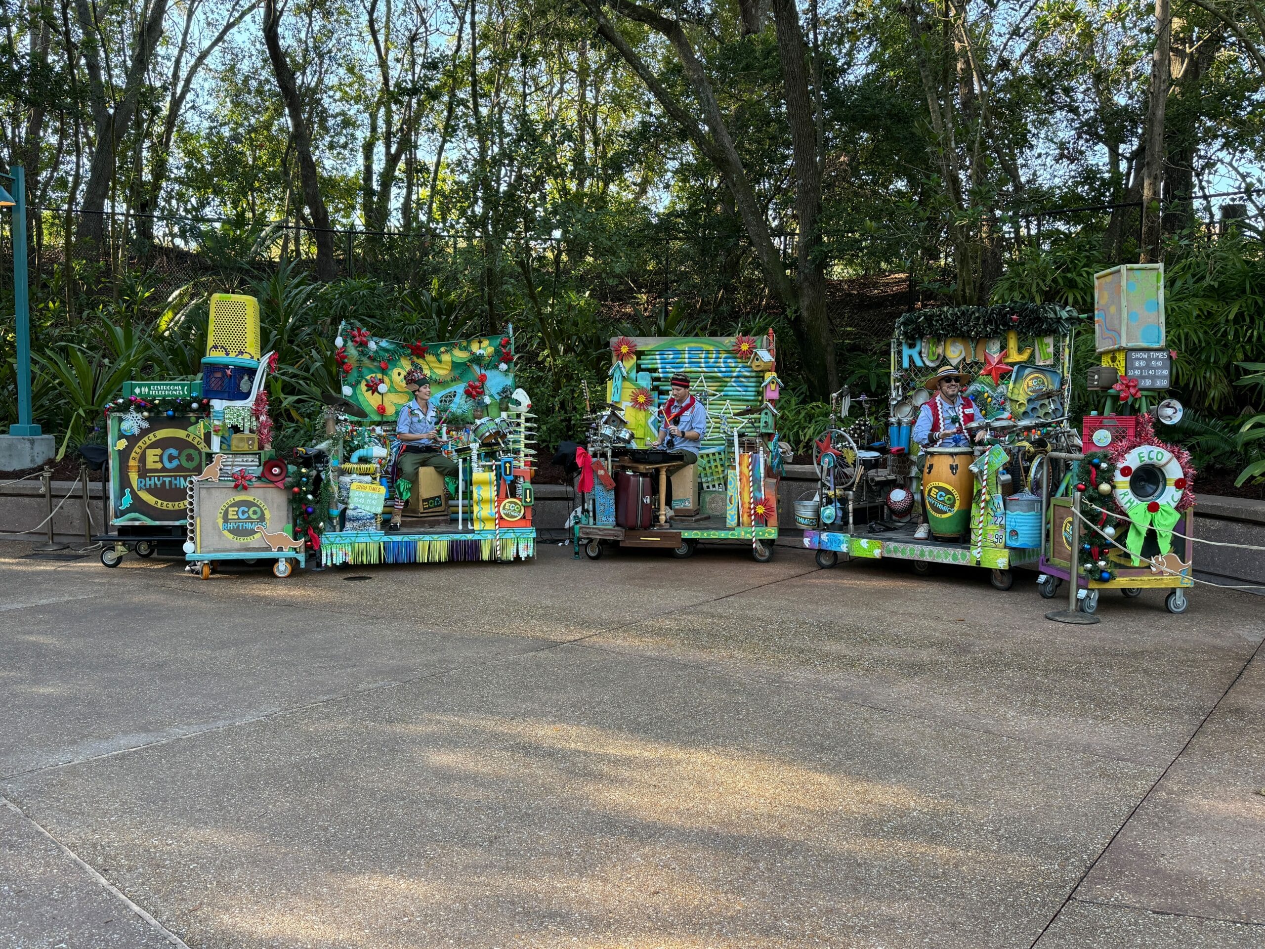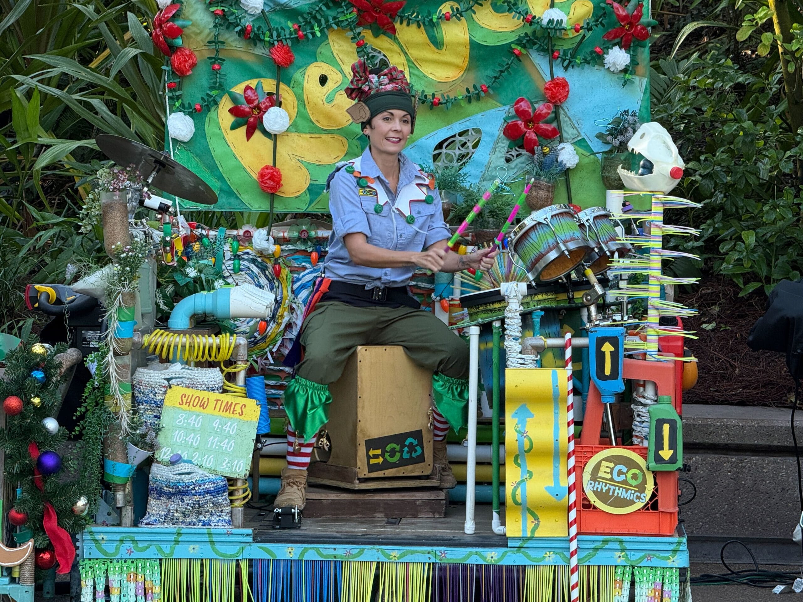 The ECORHYTHMiCS perform a high-energy, percussion show at Animal Kingdom promoting conservation. Their holiday set debuted today, which includes props, costumes, and a holiday song.
