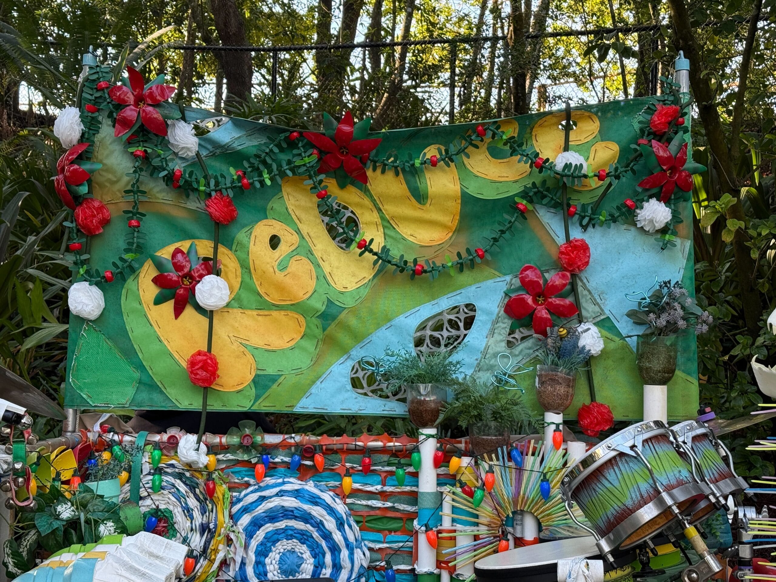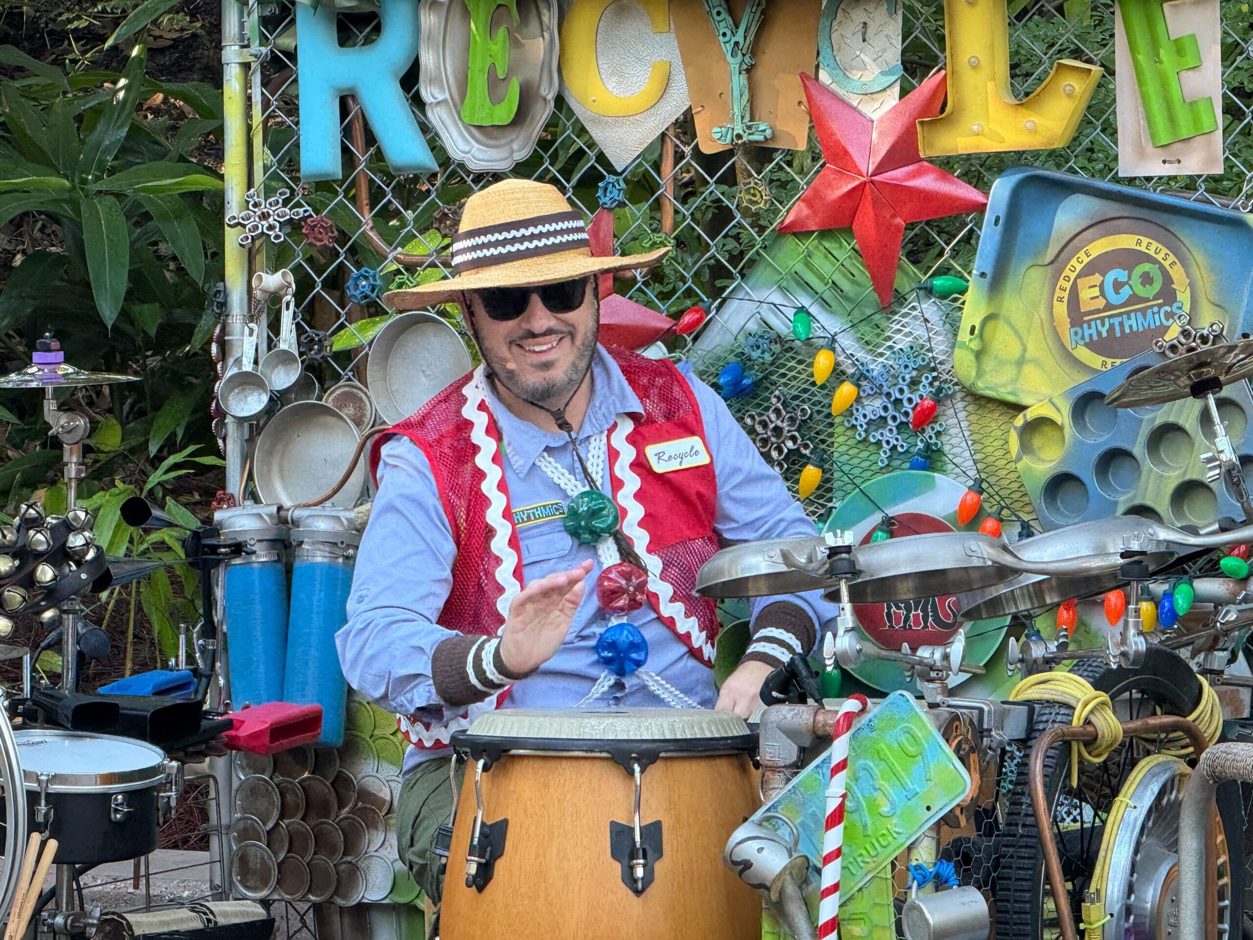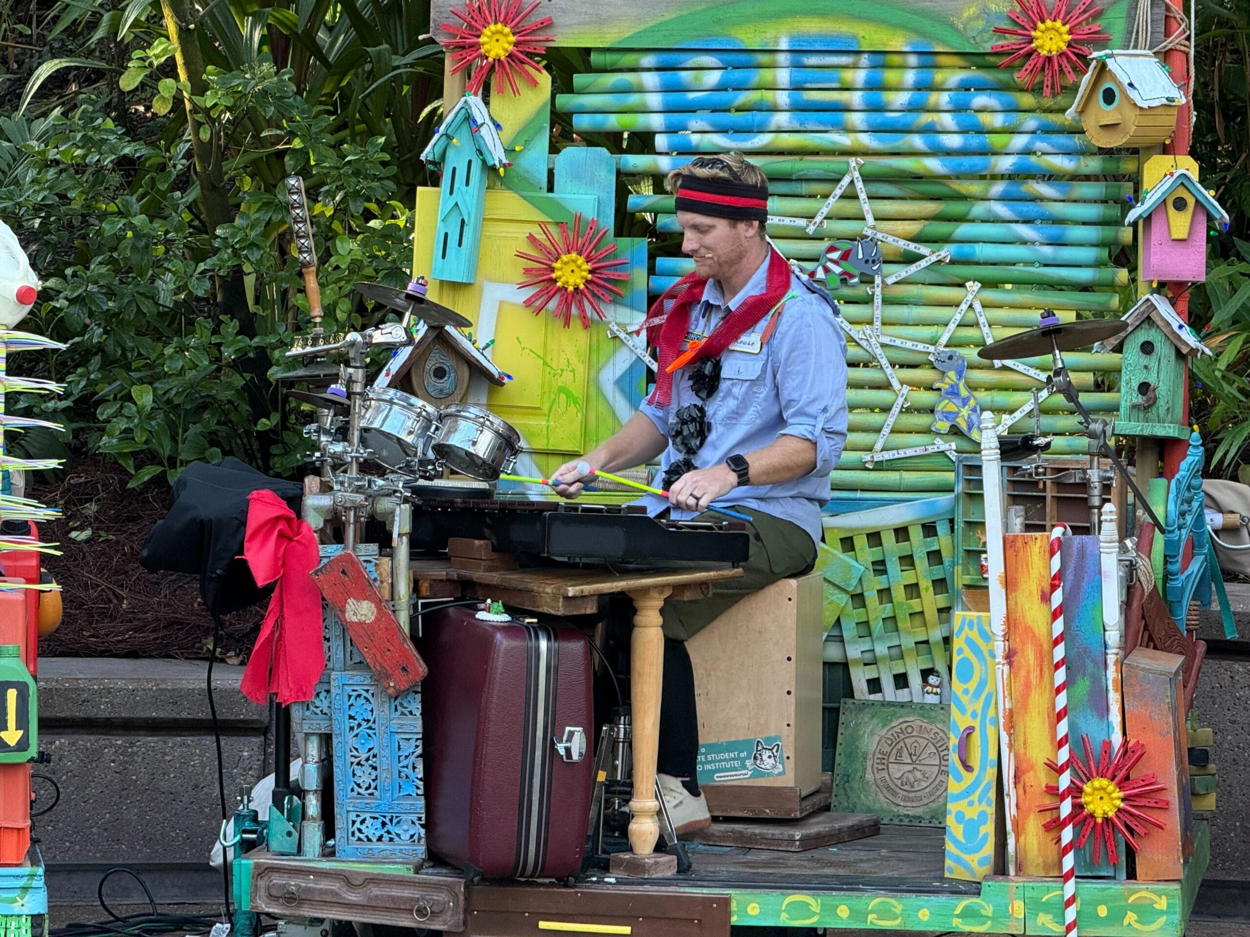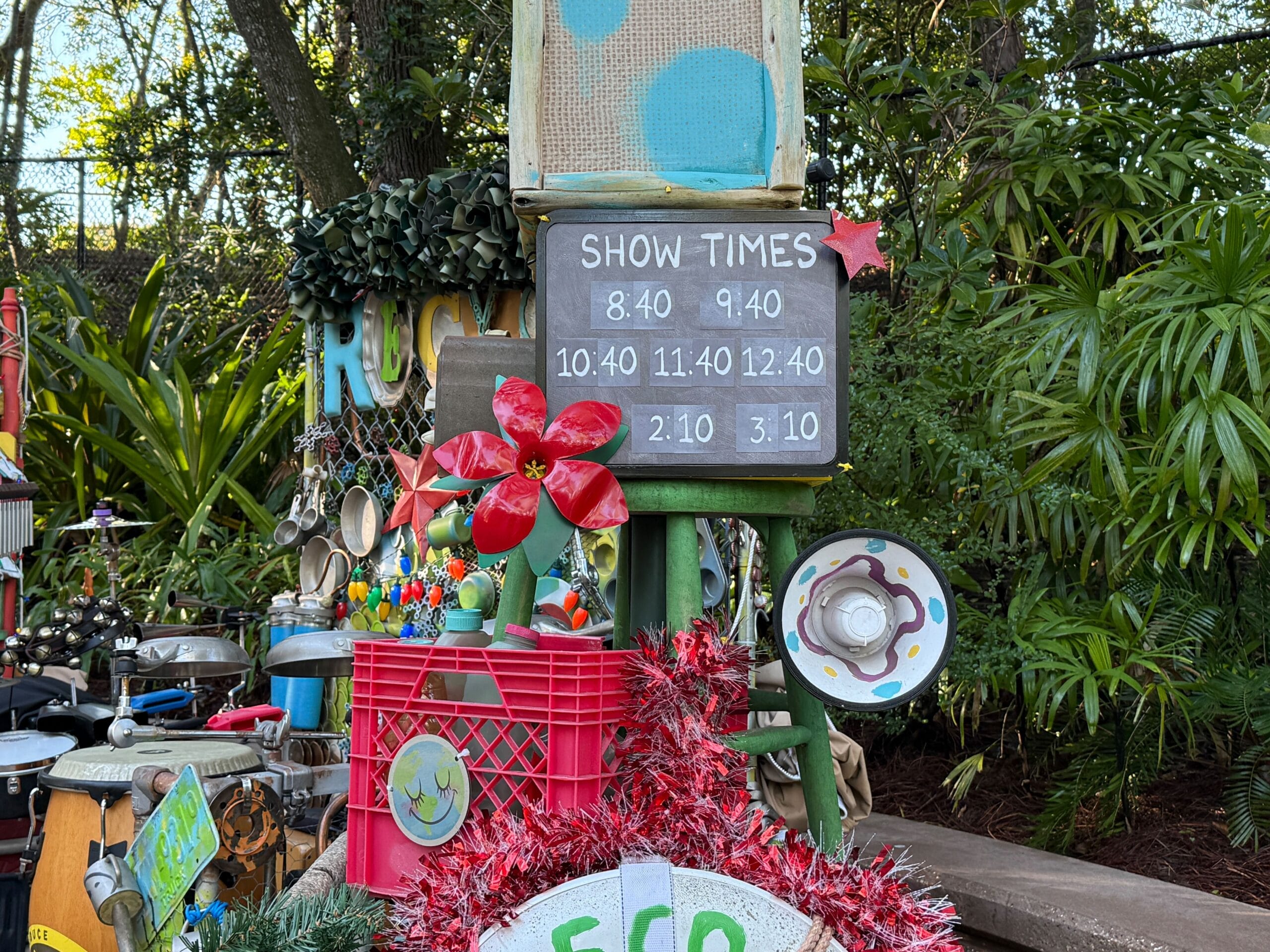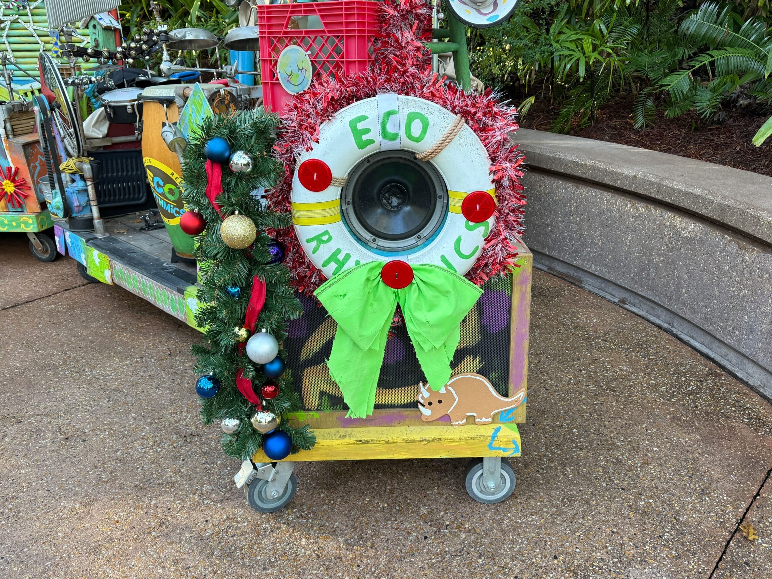The ECORHYTHMiCS perform a high-energy, percussion show at Animal Kingdom promoting conservation. Their holiday set debuted today, which includes props, costumes, and a holiday song.
