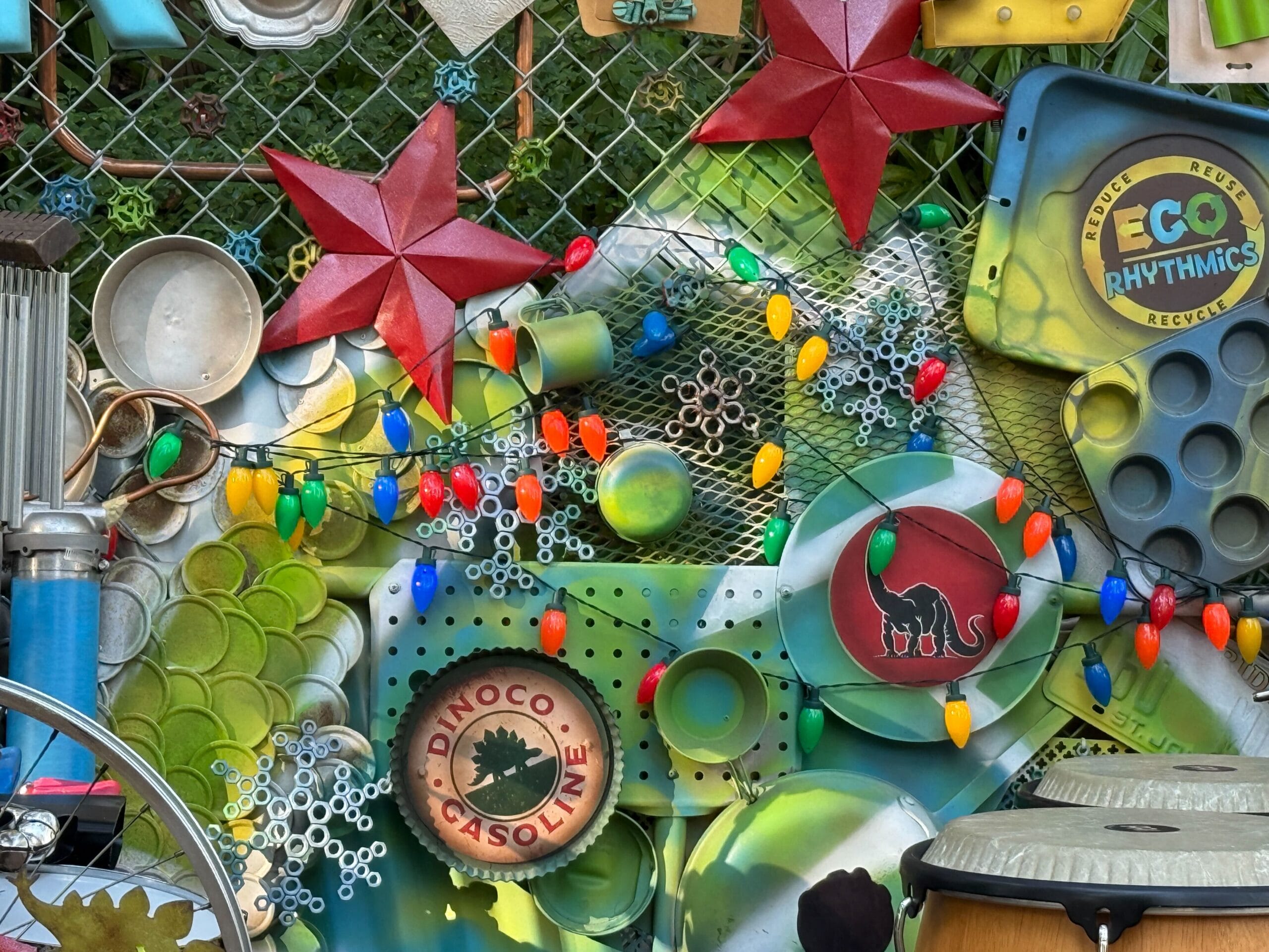 The three-piece band performs on special platforms made of repurposed materials, with each platform illustrating a part of “Reduce, Reuse, Recycle.”