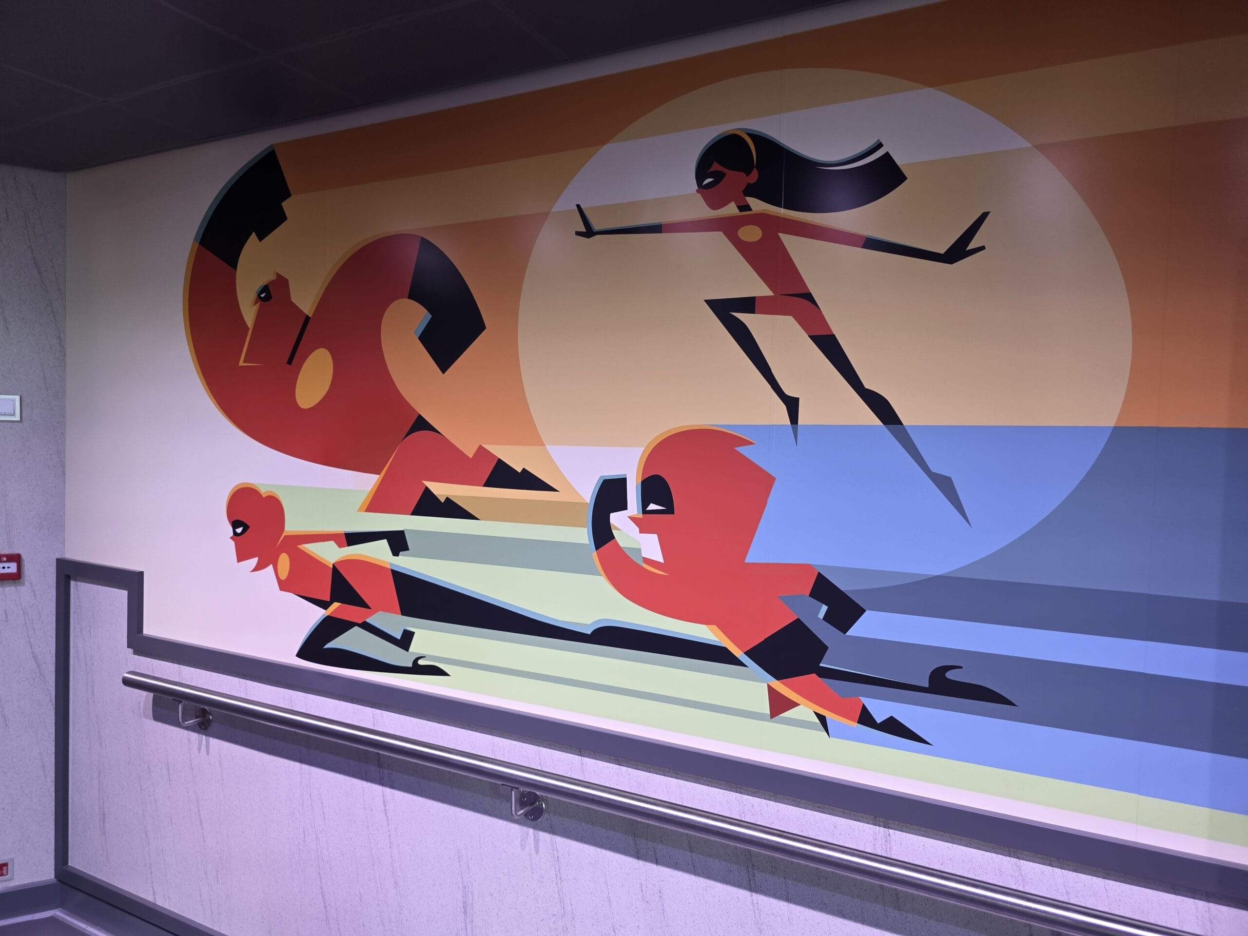 Large images of the Incredibles family line the wall.
