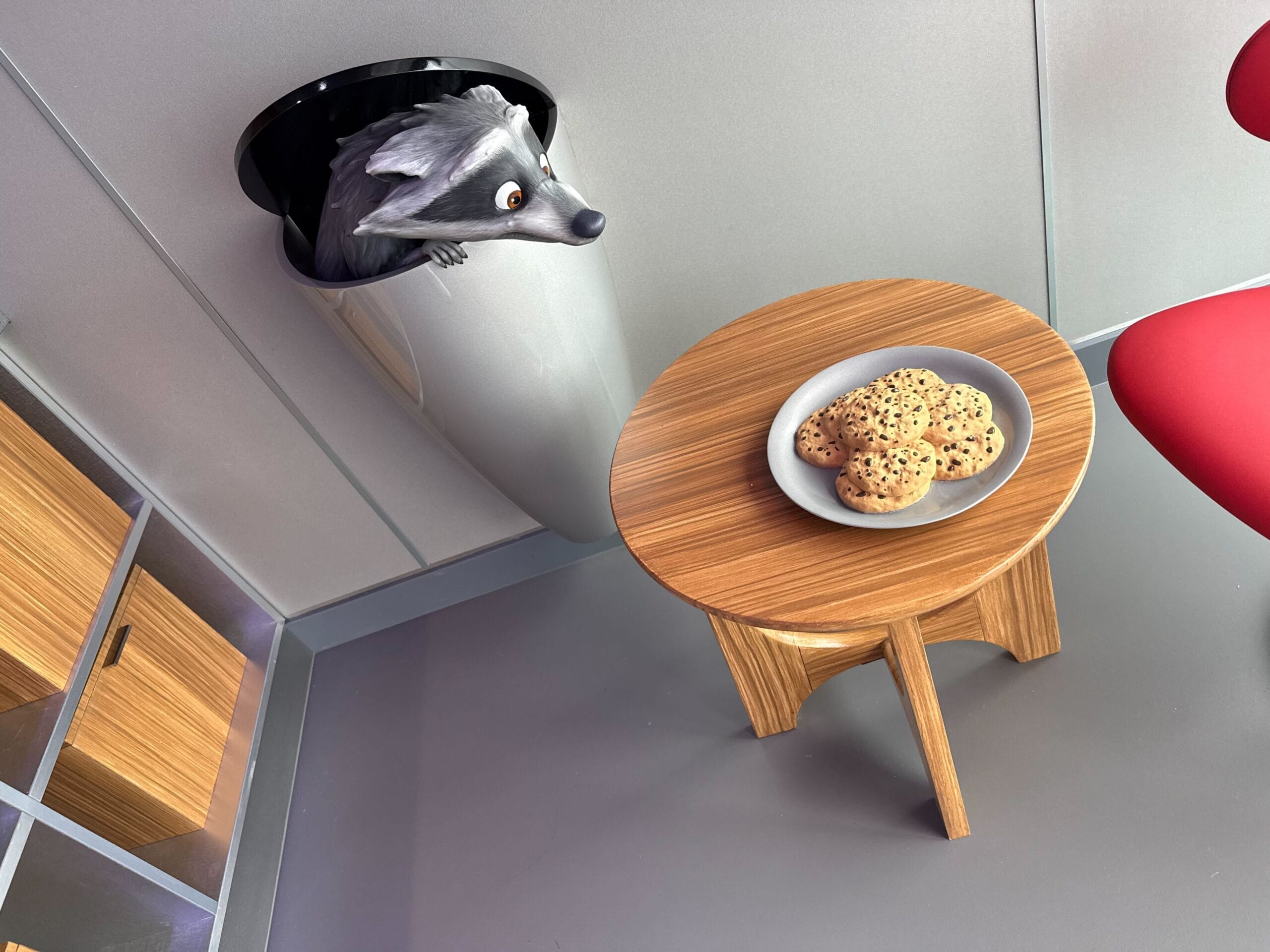 In one corner, Rocky peeks out of the trash can as he looks to grab a bite of the (fake) cookie sitting on the table.