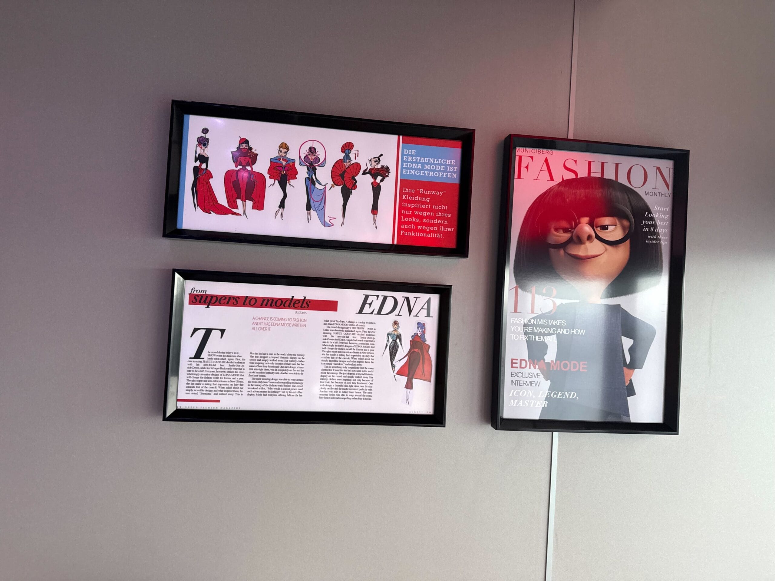 The walls also have framed artwork, including magazine covers and spreads of Edna Mode.
