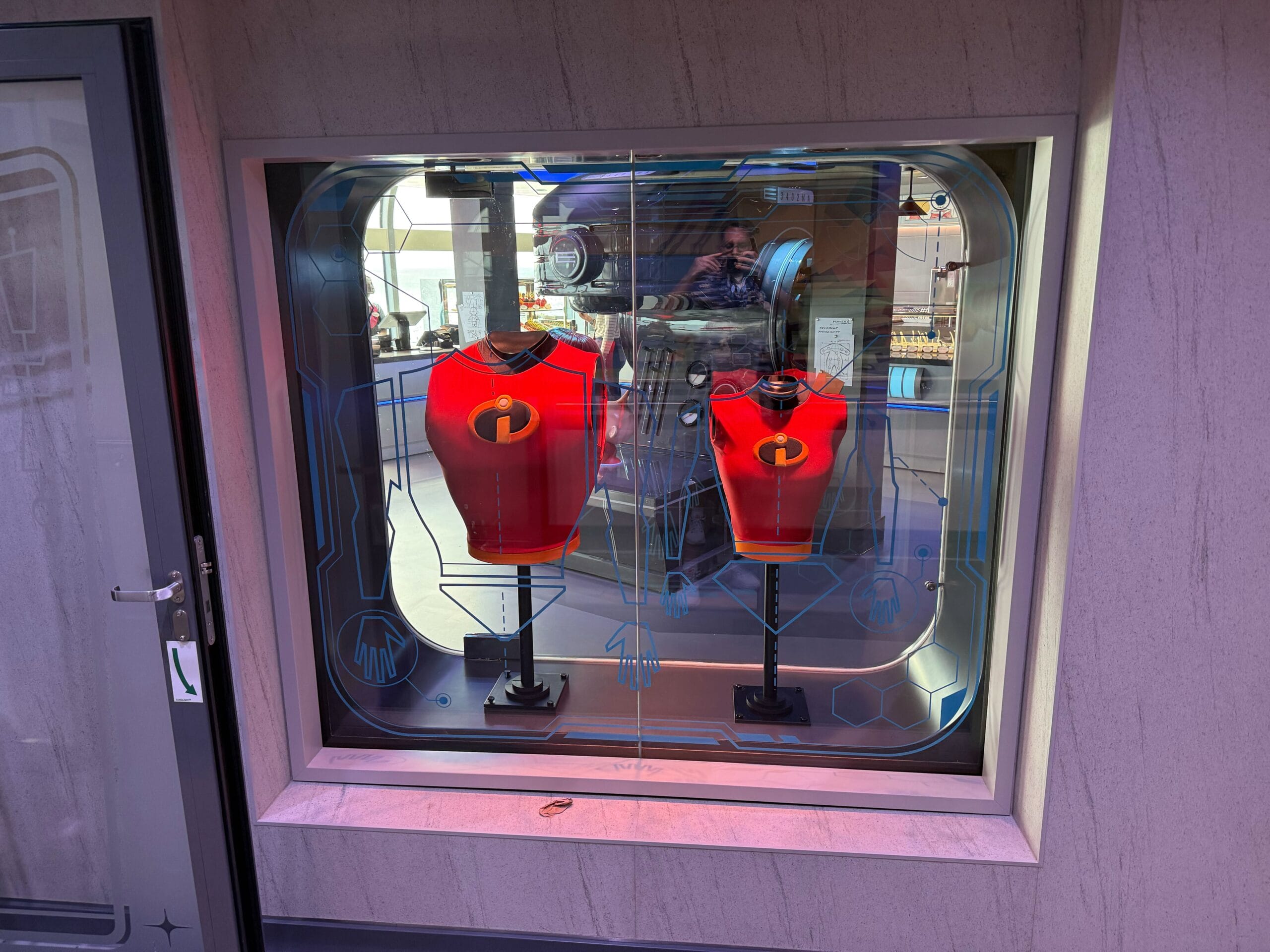 Behind the counter, computer-generated sketches of the Incredibles costumes line the back wall.
