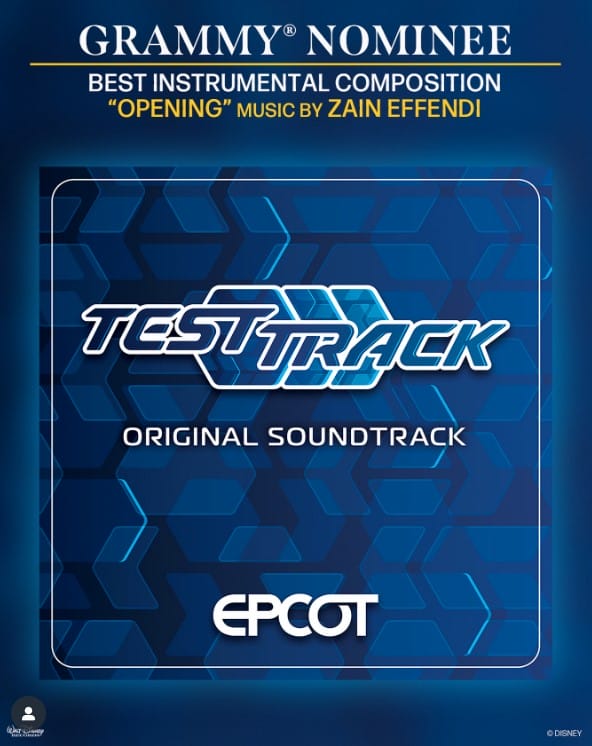 Composer Zain Effendi has been nominated for a Grammy for the composition of “Opening” from the EPCOT Test Track soundtrack.