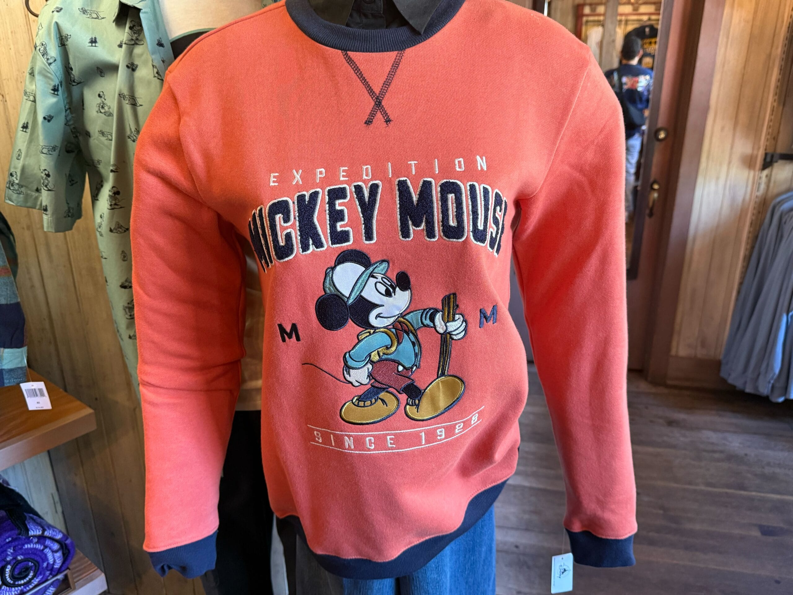 The orange crewneck sweatshirt is embroidered with “Expedition Mickey Mouse” and “Since 1928” on the front. An adventurous Mickey Mouse is hiking a trail in the center of the shirt.